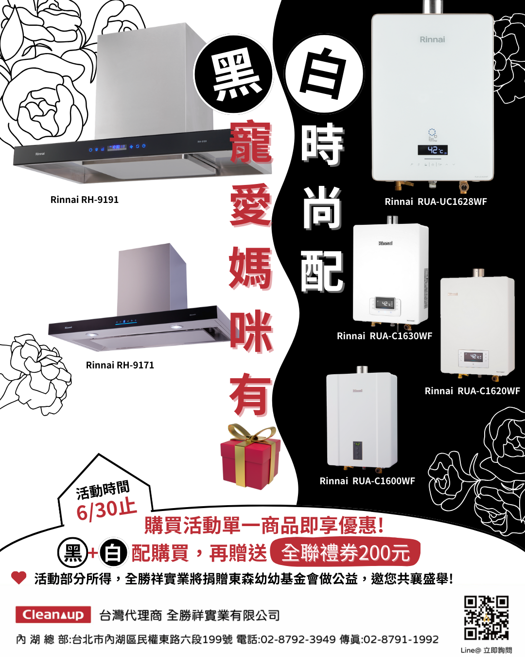 溫馨五月,全勝祥實業推出「黑白時尚配,寵愛媽咪有禮」活動! 林內Rinnai精選沉穩「黑」色排油煙機,守護廚房清新;林內Rinnai優雅「白」色熱水器,帶來舒適沐浴,如同母親的溫柔呵護。 5/1-6/30活動期間,與全勝祥臺北內湖展示中心購買單一指定商品即享優惠;成套購買「黑白配」,再贈全聯禮券200元,讓您為媽咪準備更多驚喜。 這不僅是家電,更是您對媽咪生活品質的重視與關愛。想像媽咪在潔淨廚房烹調、在溫暖浴室放鬆,都能感受到您的用心。 更棒的是,活動部分所得將捐贈東森幼幼基金會作公益,您的愛心將溫暖更多人。 別再煩惱母親節禮物!讓林內Rinnai「黑白時尚配」成為您傳遞愛意的最佳選擇,將您的感恩與祝福,送到媽咪心裡。 現在就行動,與全勝祥實業一同寵愛最愛的媽咪! 活動限定: 東森幼幼社會福利慈善基金會-慢飛天使專案 備註: 1. 購買成套「黑白時尚配」贈送的禮券將隨同發票一併寄出,不得要求轉換、轉讓或折換現金。 2.全勝祥實業保留隨時修正、暫停、終止或解釋本活動之最終權利。