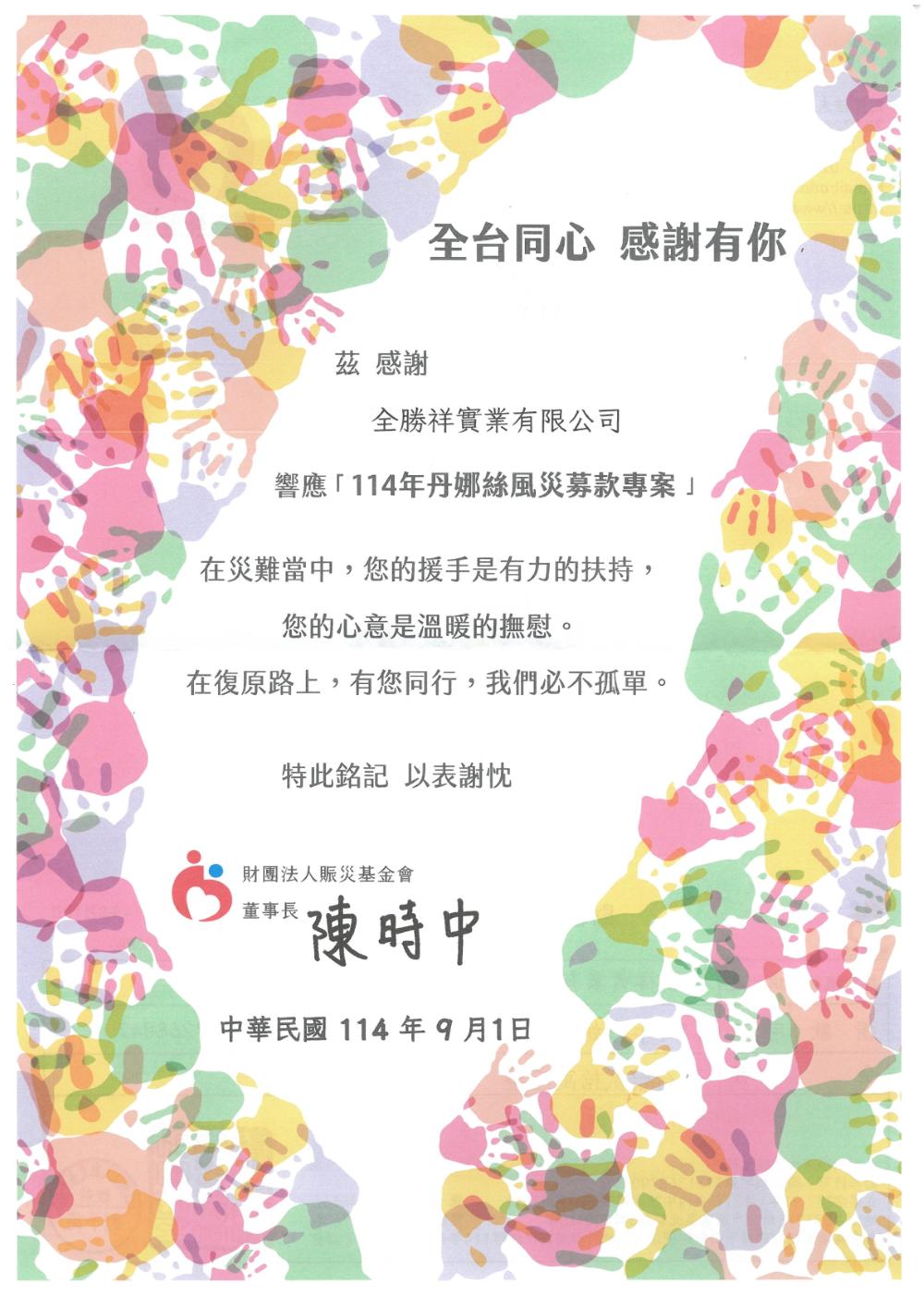 風災無情,但人間有愛,全勝祥實業懷抱著一份溫柔的關懷,秉持「取之於社會,用之於社會」的精神,積極參與公益回饋,協助受「114年丹娜絲風災」影響的民眾重建家園,公司慷慨解囊,響應募款專案,捐助善款。 這份由心而發的善舉,獲得了主辦單位的誠摯感謝,一封飽含溫情的感謝函,是對全勝祥實業愛心最好的見證,肯定了我們在艱難時刻與社會大眾站在一起的決心;全勝祥實業承諾未來將持續關注社會需求,投入更多資源支持公益活動,為建立更美好的社會貢獻心力。 【Cleanup台灣代理商 全勝祥實業有限公司】 ◼︎內湖總部:台北市內湖區民權東路六段195~199號 一樓