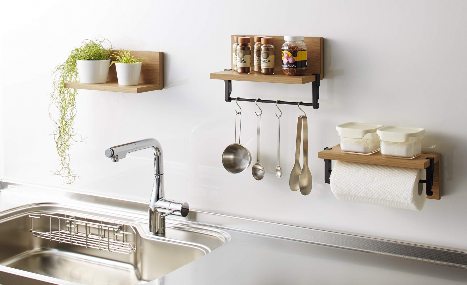 Cleanup「磁吸壁板」配件「翻轉兩用置物架」,設計成雙面可上下翻轉使用,兼具置物收納、瀝水和吊掛功能,大大增加了實用性,滿足多種收納需求;美觀部分,花色提供5種選擇,掛鉤提供黑色與銀色2種選擇,讓整體廚具設計搭配更具靈活。