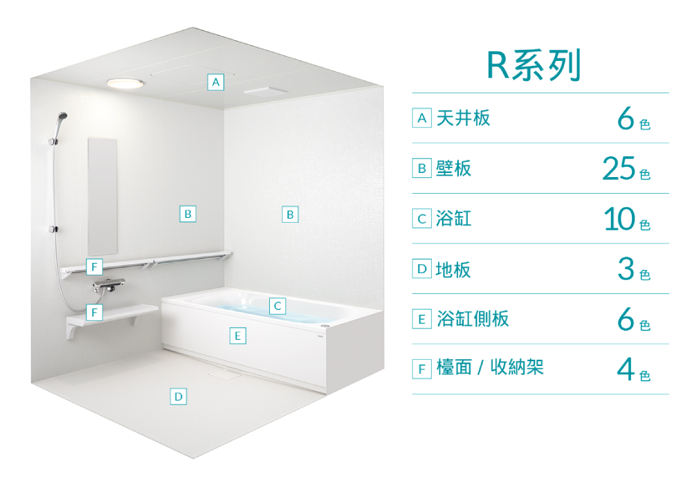 享受「喜歡」。 精心嚴選的室內裝飾、讓「喜歡」包圍你的沐浴時光。 壁板、天井板以及浴缸側板相互搭配整體顏色及材質。 選擇您喜愛的功能與配件,只專屬您的整體衛浴就此誕生。