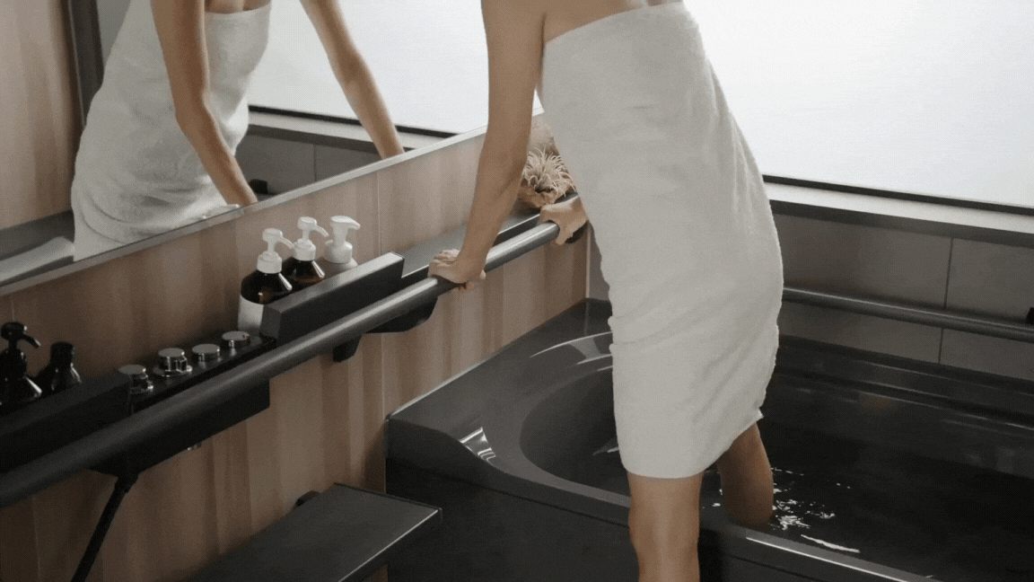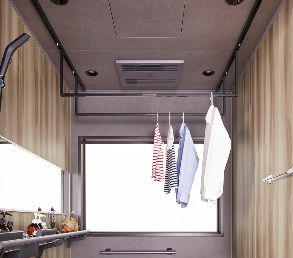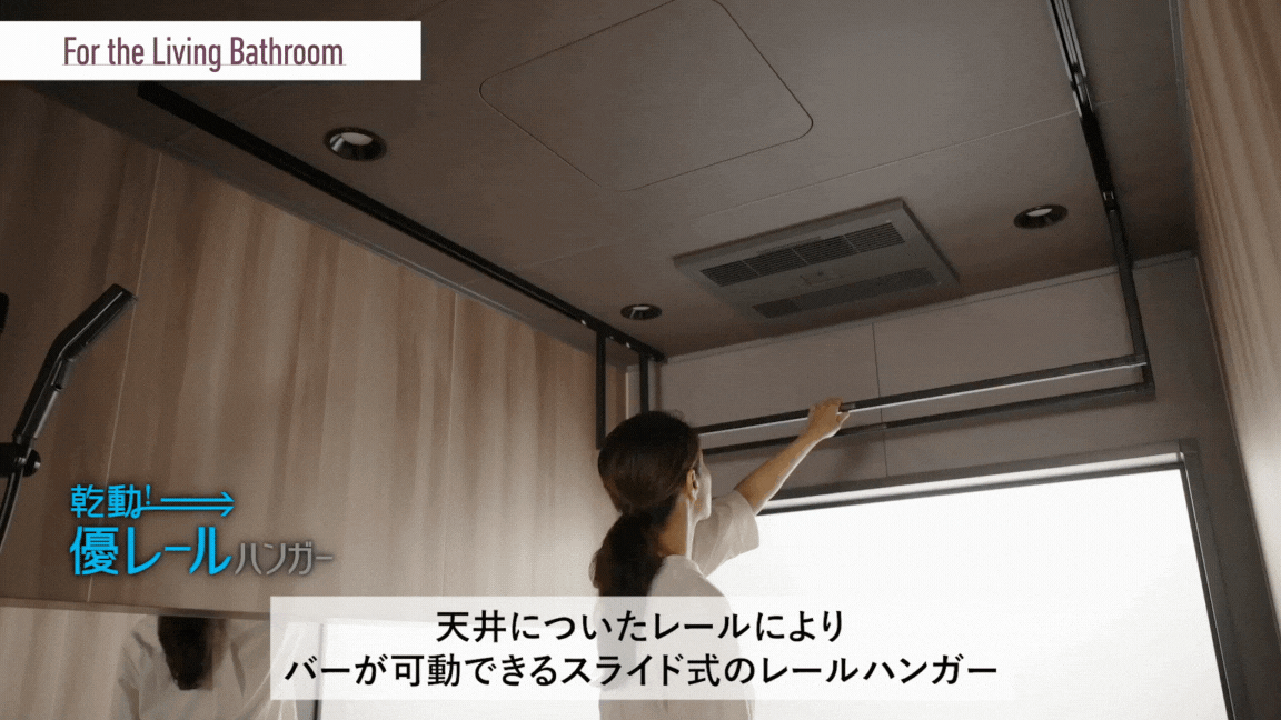 由於是可移動的,衣物不會堆積,也不會妨礙洗澡。 握把設置在較靠近自己的前端設計,以輕鬆的姿勢完成在浴室的晾衣動作。 |
