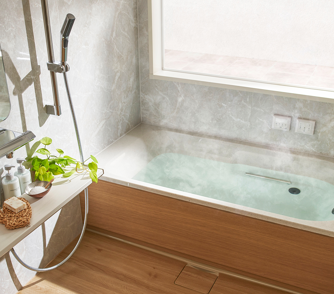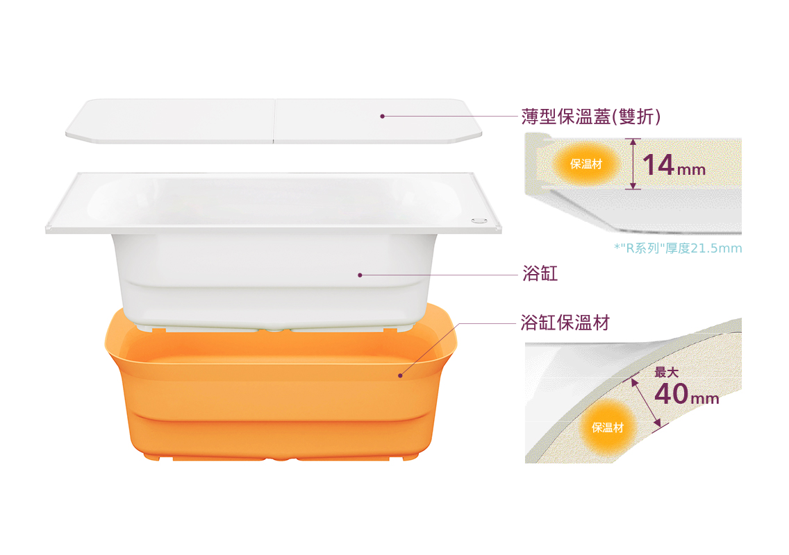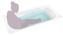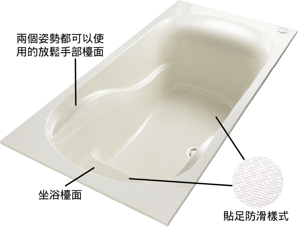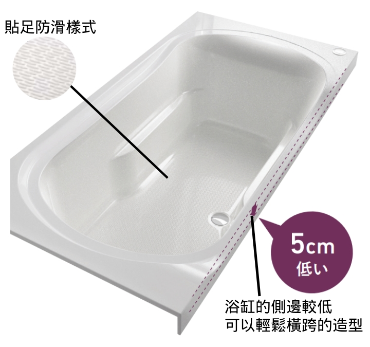 | 橫跨出浴缸的部分較低較薄,因此比較好出入;浴缸側邊的中央高度比兩邊低了5cm。 | 地板與浴缸內側的底部高低差較少,可以站得比較穩。 | |||||||||