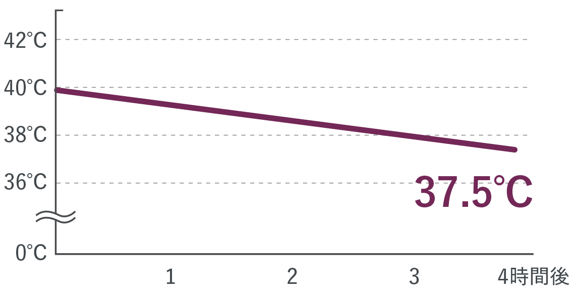 4小時後溫度下降幅度也維持在2.5℃以內。 (JIS基準*) *溫度變化數據是以JIS為基準所判斷的數據。(當社調查/2023年10月)實際使用情況依性能不同可能有所差異。 |