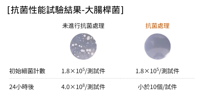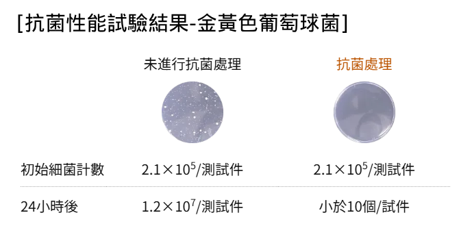 * 將含有細菌的液體滴在產品表面,在35℃、90%以上的環境下培養24小時後進行清洗。將清洗後的液體放入培養液中,在35℃培養48小時,測定細菌數。 |