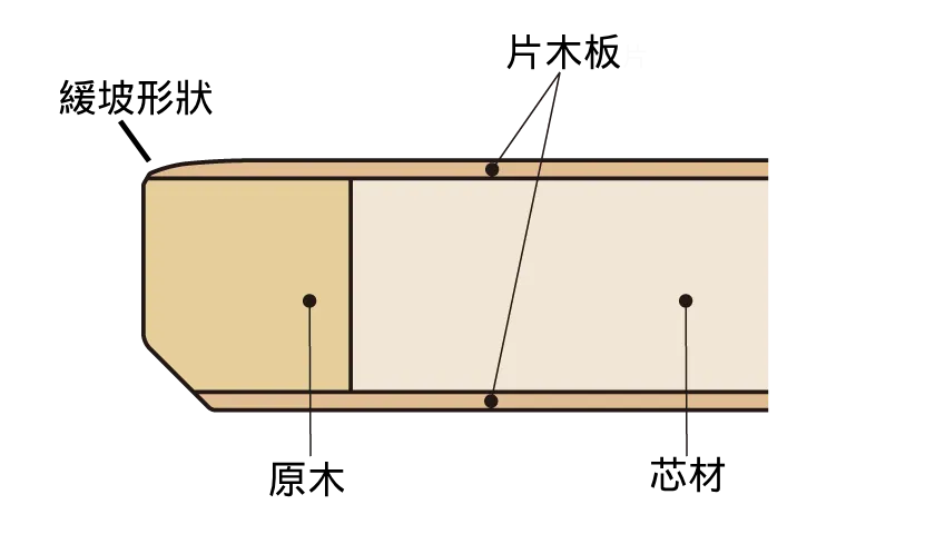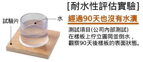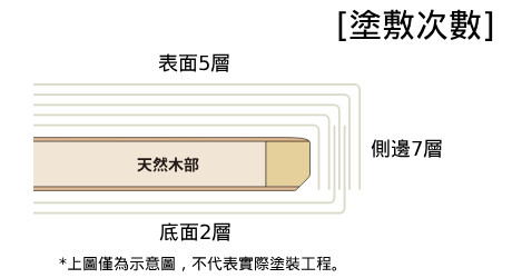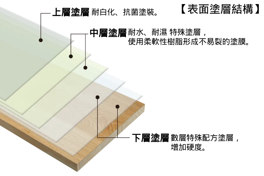 鋸切後的面板厚度經過加工,即使掉落物品也不易刮傷或露出芯材,幾乎不會因潮濕而翹曲。天然木材表面採用五層特殊塗料,具有優異的耐刮性。底漆採用柔軟度塗料,可有效減輕衝擊力。