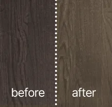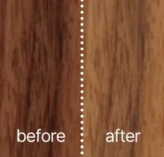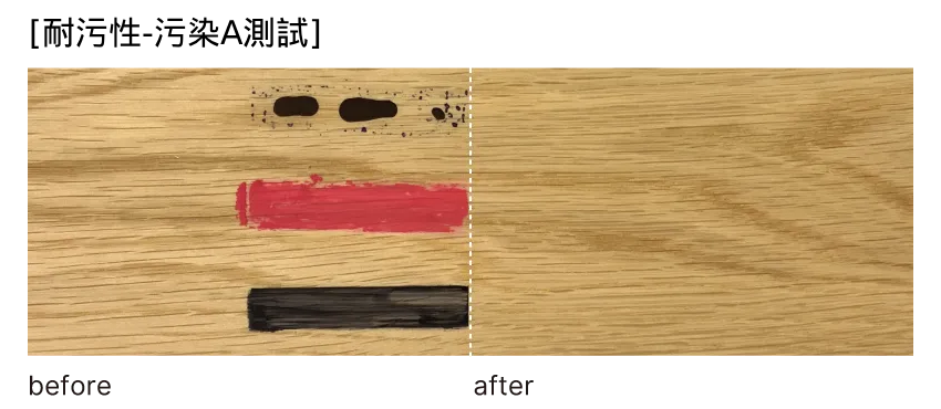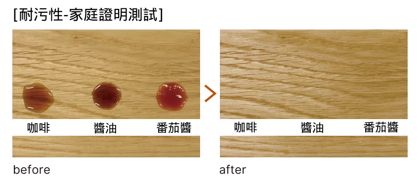 已進行測試,可去除各種情況下的污漬,包括容易黏附在廚房的調味品和油污。即使調味品、飲料或酒精灑在天然木質檯面上,只需用水擦拭即可輕鬆去除污漬。即使使用廚房氯系消毒漂白水(次氯酸鈉)或酒精,也能保護檯面,去除的只是污漬。其性能卓越,讓您日常使用安心無虞。
