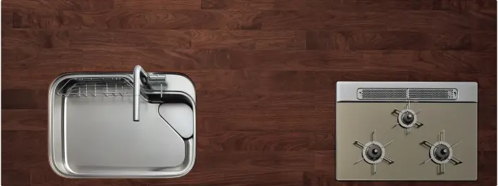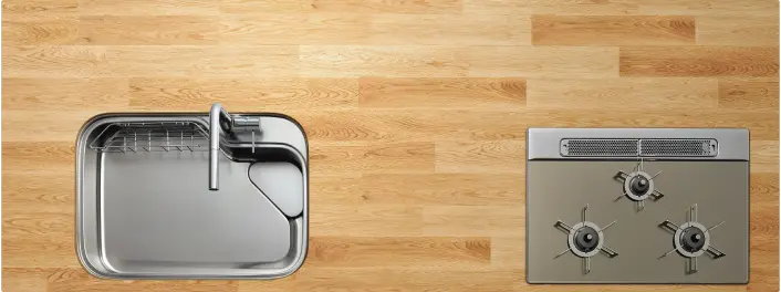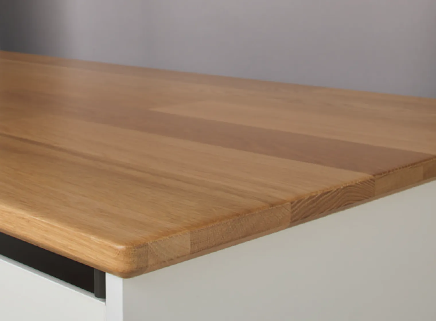 特殊的塗層可保護檯面免受水漬和滲透。表面五層塗層可有效防水,背面兩層塗層可調節水分蒸發,防止檯面翹曲。木材邊緣最容易滲水,正面和背面塗層疊加,最多可達七層。水槽周圍的邊緣最易受潮,也採用特殊塗層進一步保護。邊緣和水槽區域採用與鋸木板相同的實木,增強了防水性能。這款檯面的性能專為在潮濕環境中長期日常使用而設計。