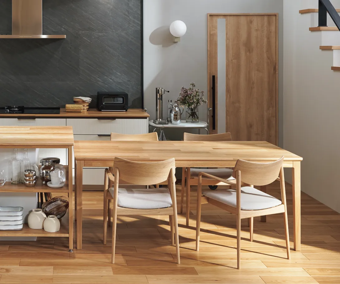 這張天然木質生活桌與工作檯面規格相同,桌子塗有特殊塗料,即使沾上食物或調味料也可以輕鬆擦拭乾淨,因此不僅可用於用餐,還可以用作第二個操作台。 |