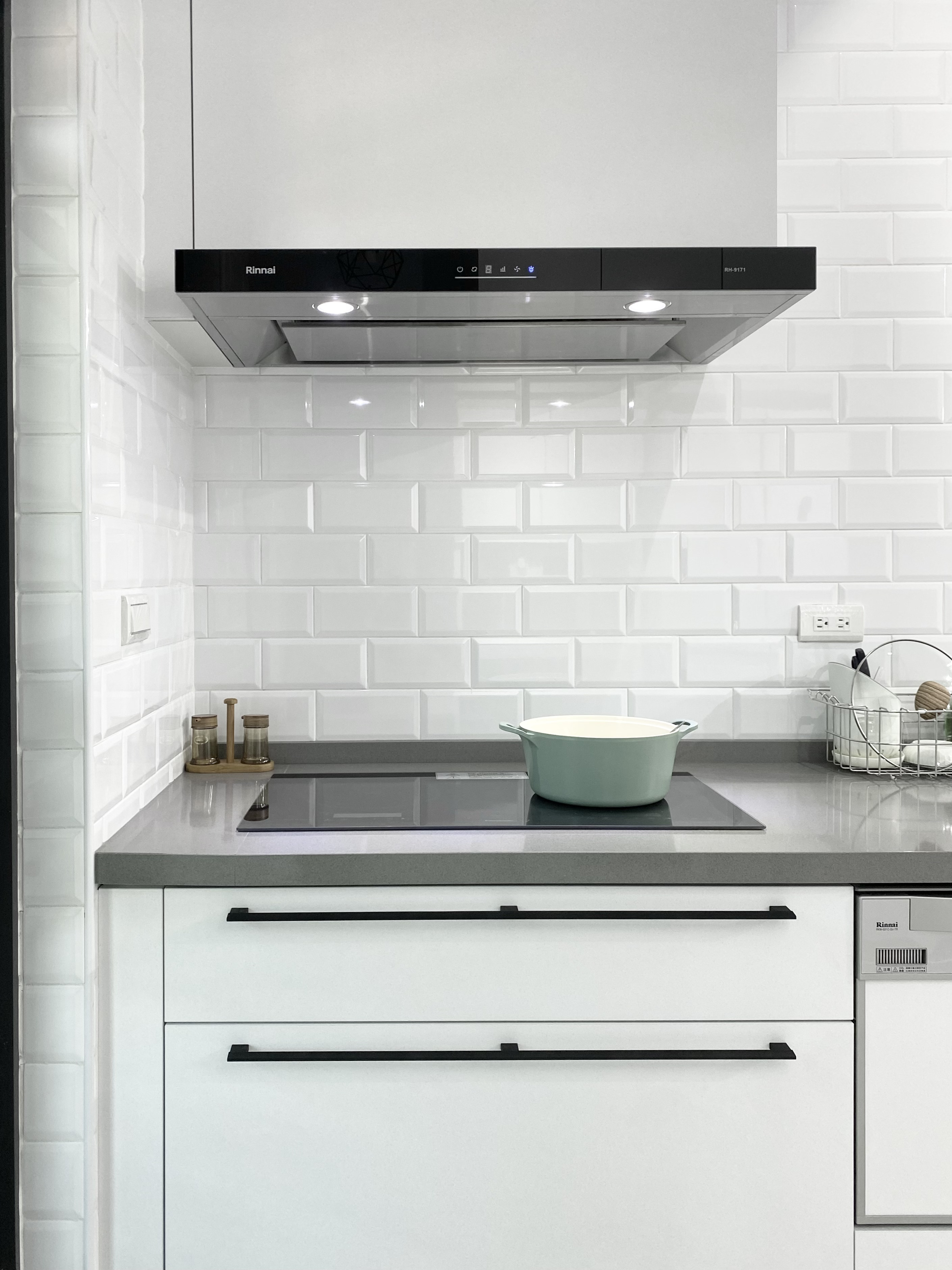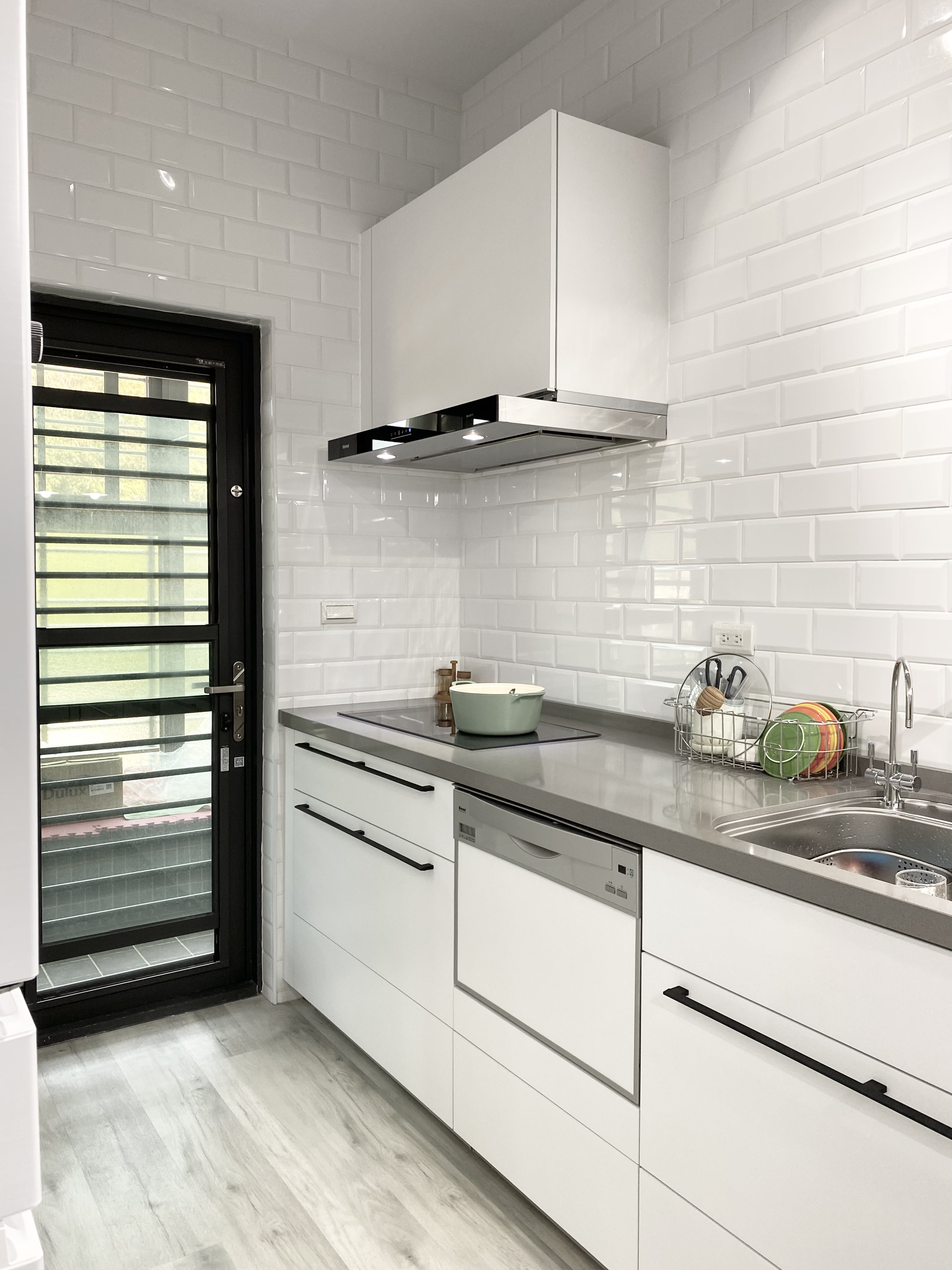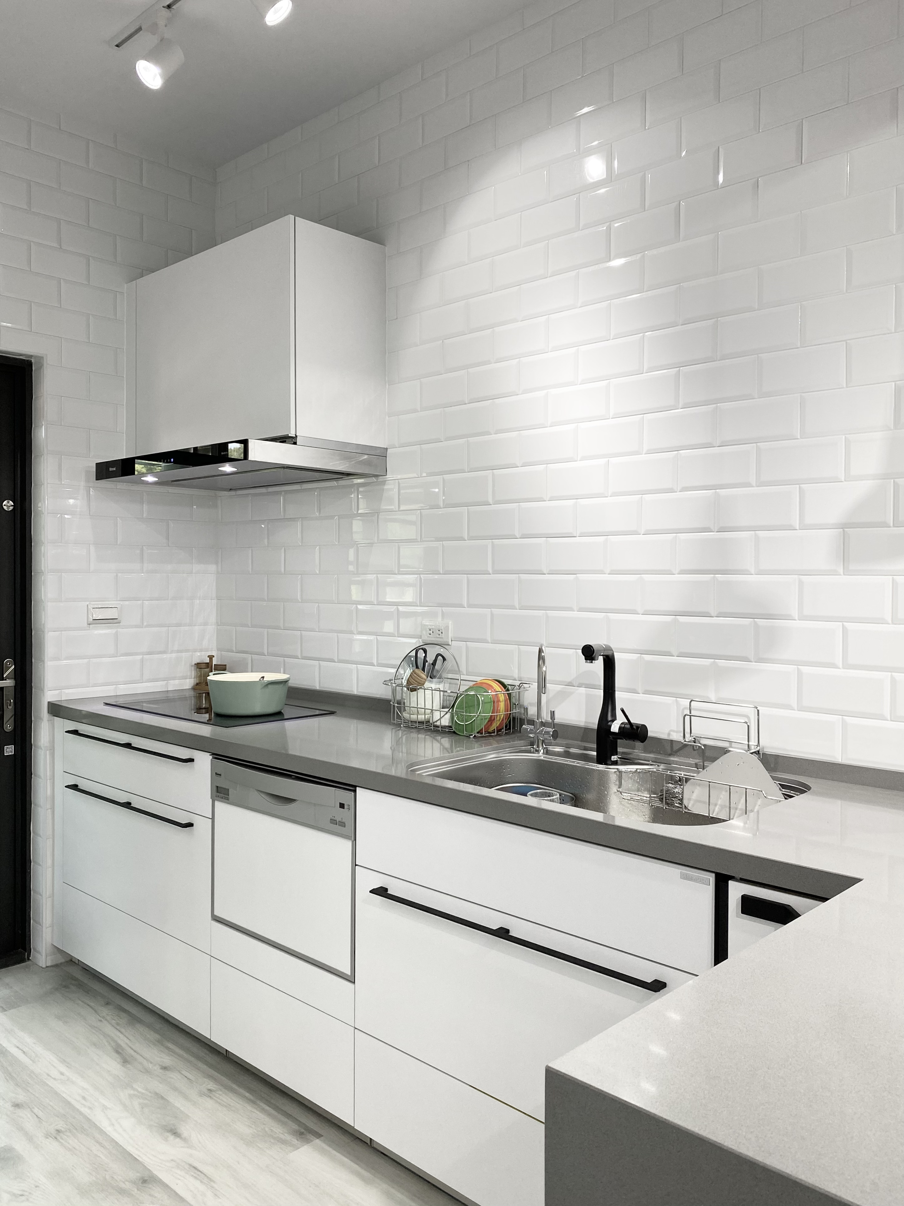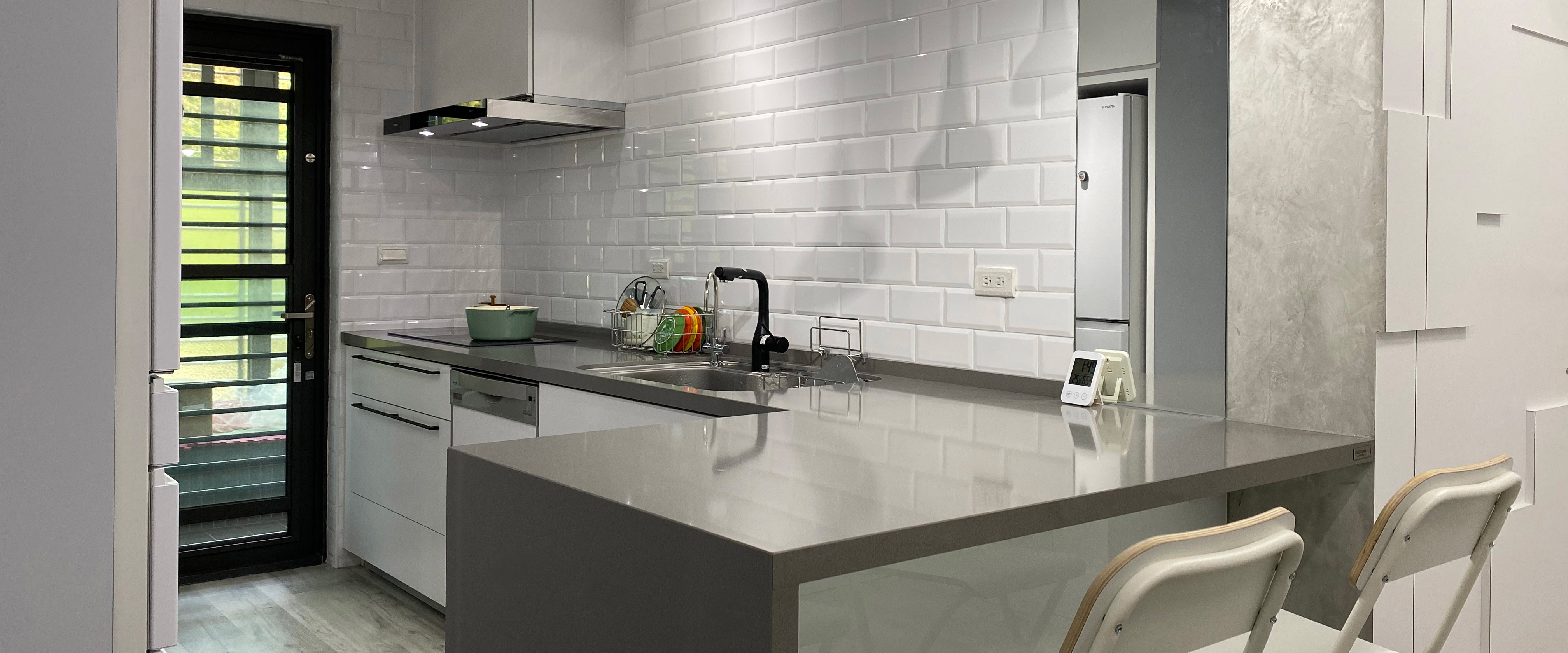 Stedia:CAT G把手,檯面:西班牙賽麗石 CS-102,白色磁磚的潔淨與明亮感為空間注入了一種純粹的簡約之美,搭配金屬色調的中島,則增添了現代感與精緻氛圍。白色磁磚的低調優雅讓空間顯得更加開闊