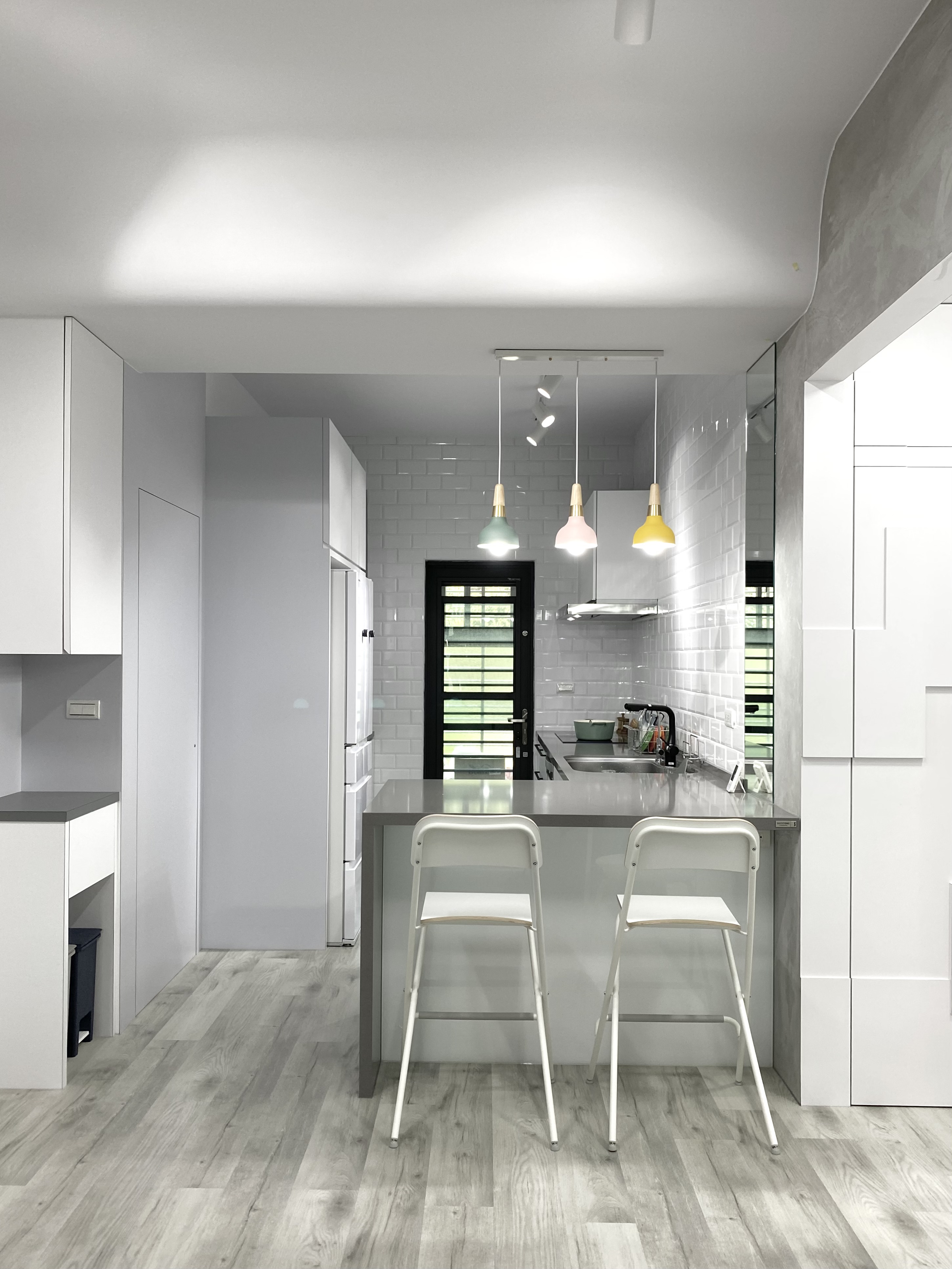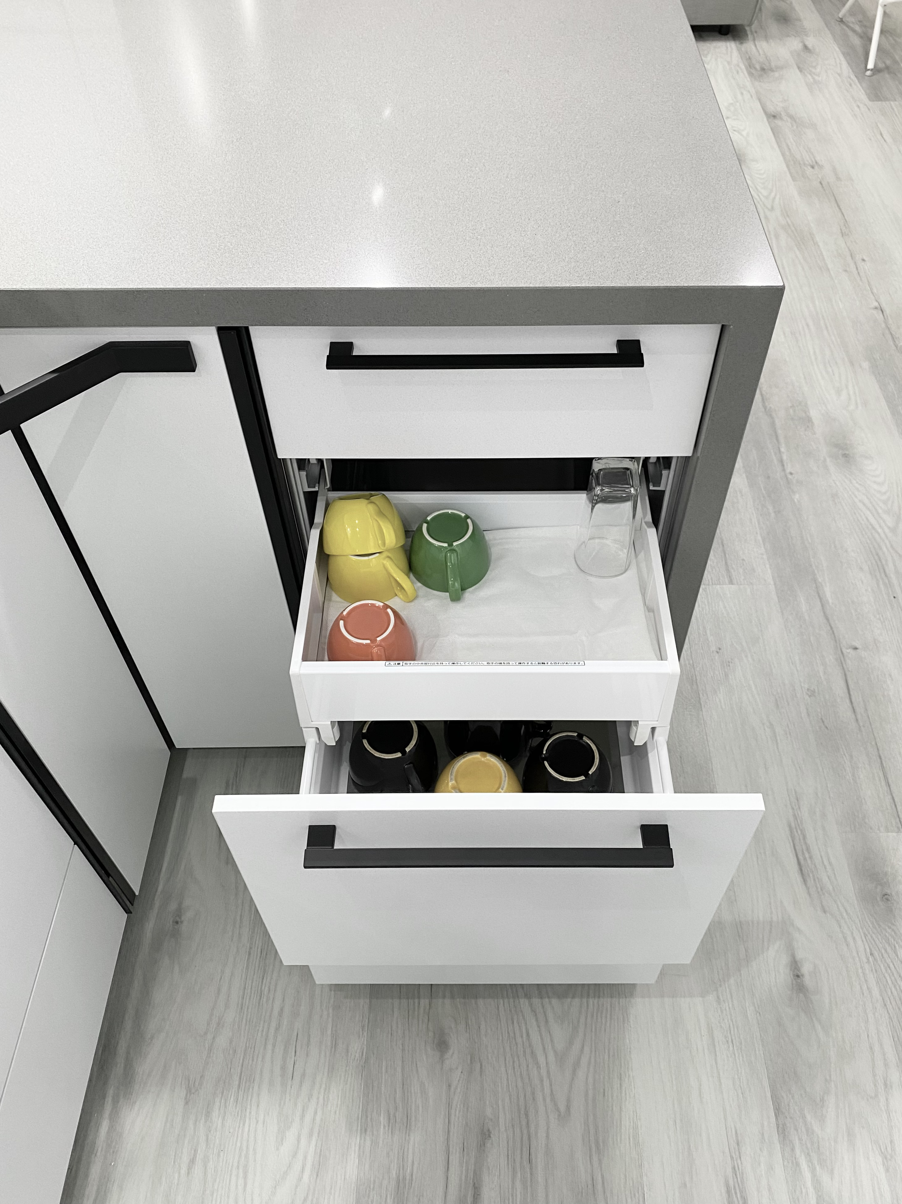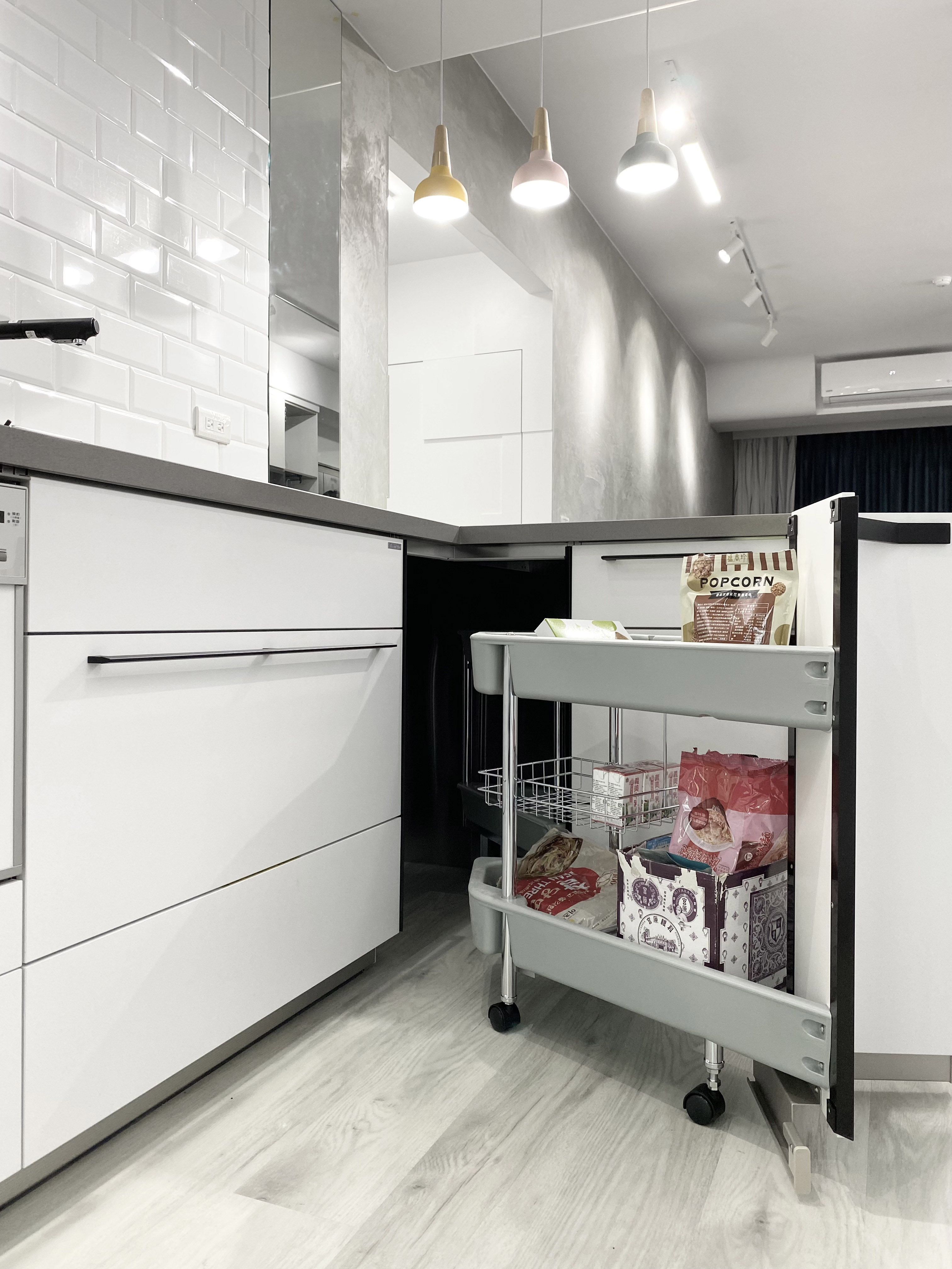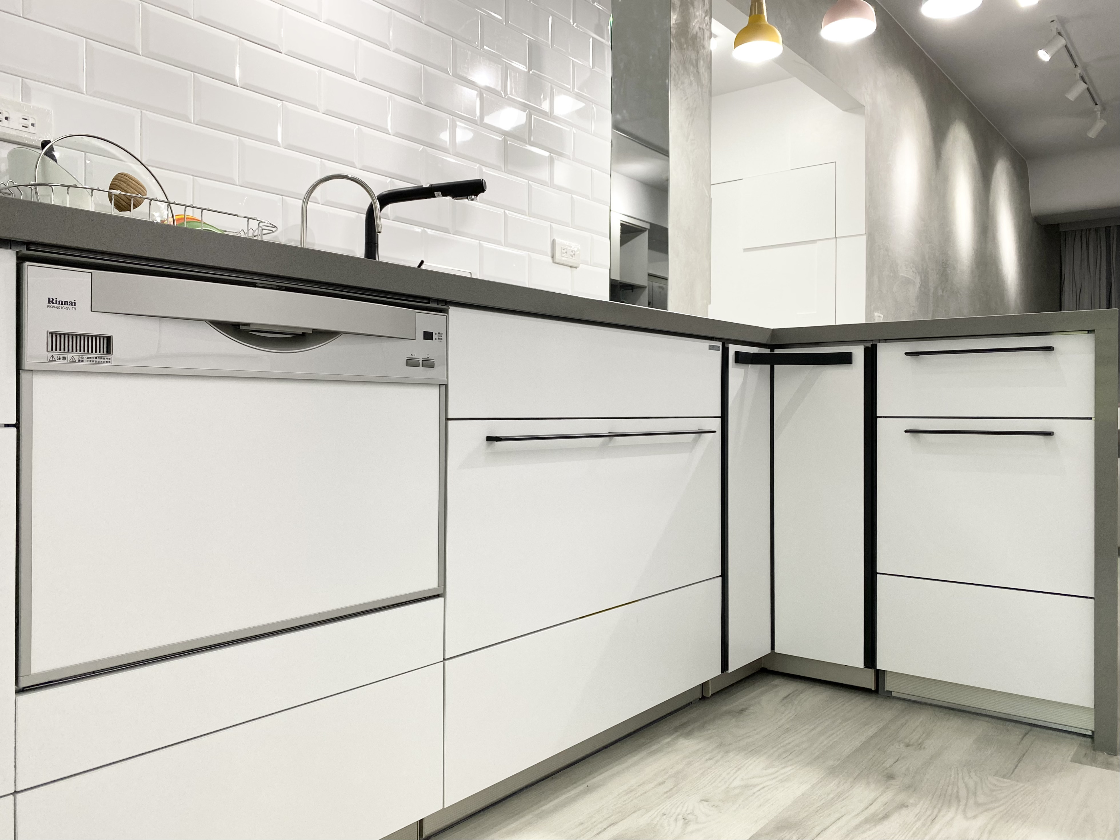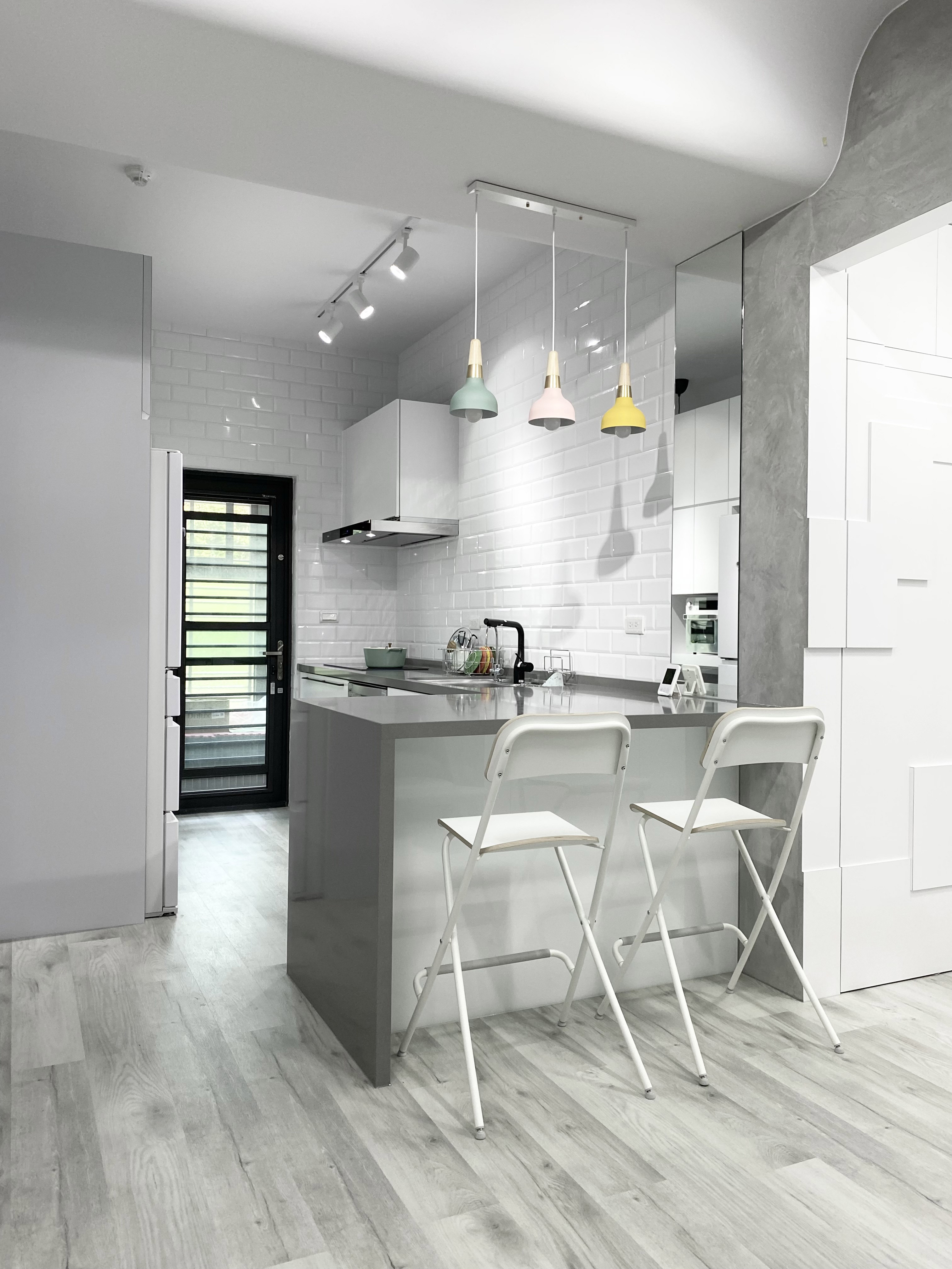 Stedia:CAT G把手,檯面:西班牙賽麗石 CS-102,白色磁磚的潔淨與明亮感為空間注入了一種純粹的簡約之美,搭配金屬色調的中島,則增添了現代感與精緻氛圍。白色磁磚的低調優雅讓空間顯得更加開闊
