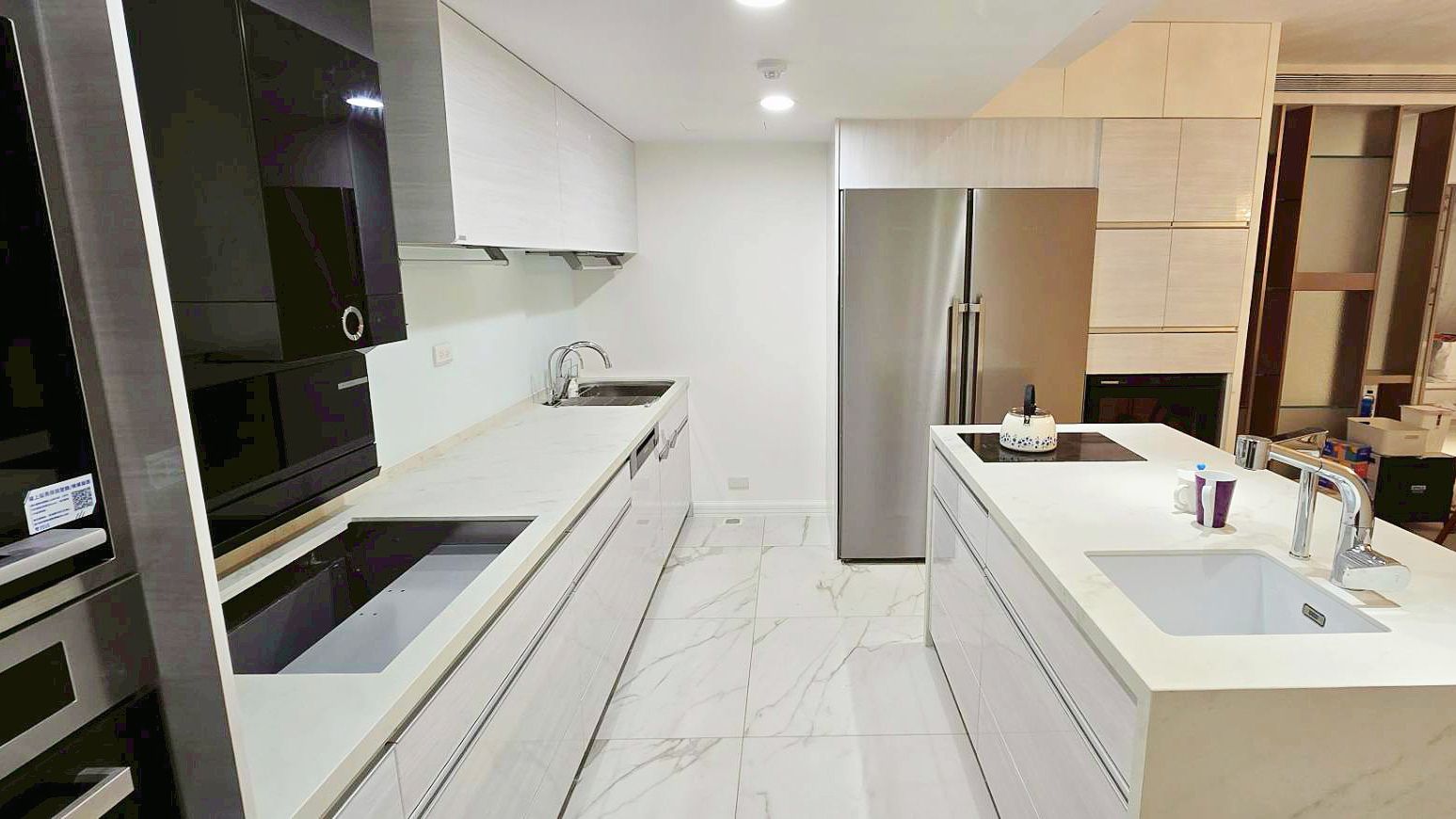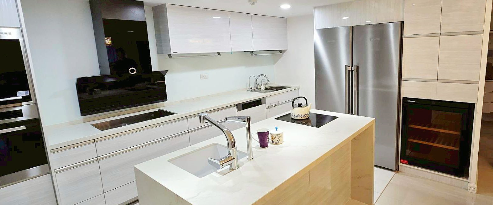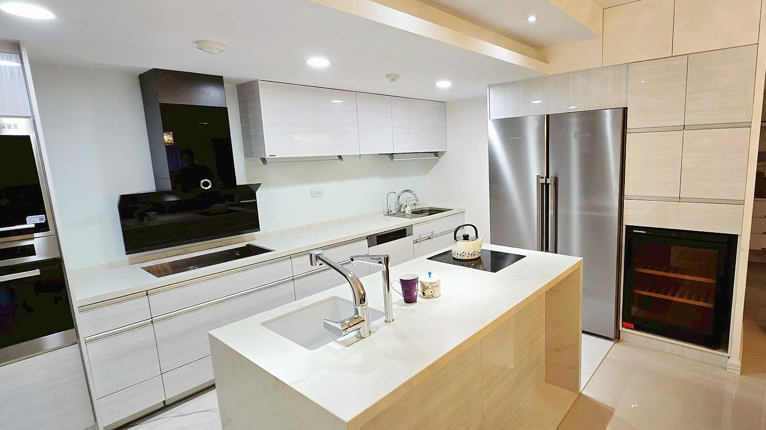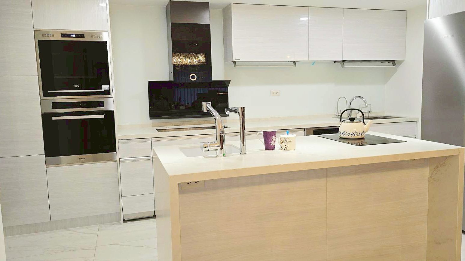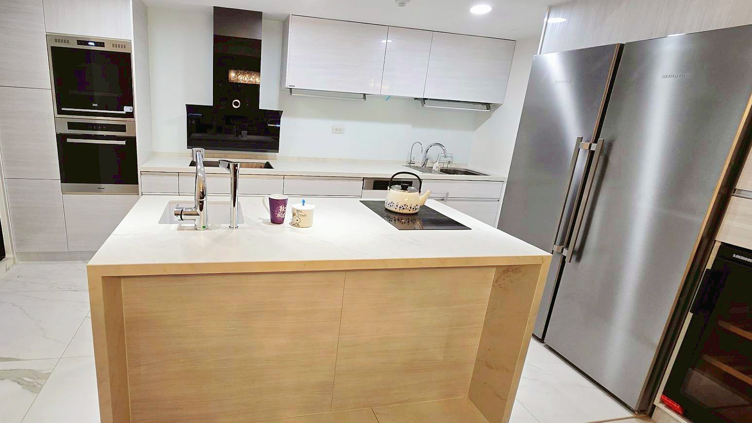 CHK鏡面門板搭配同色系的帝通石檯面,打造清爽明亮的廚房。