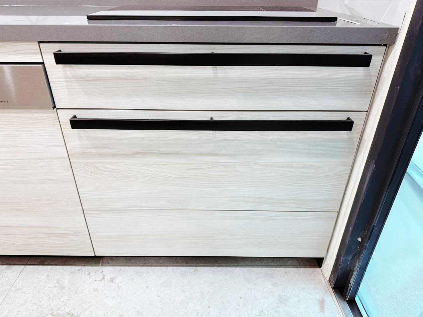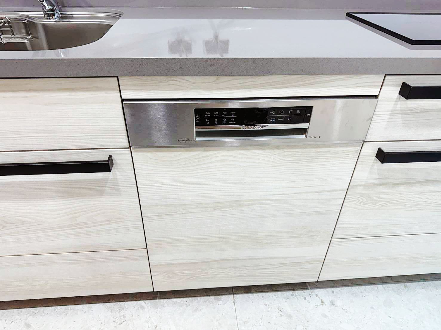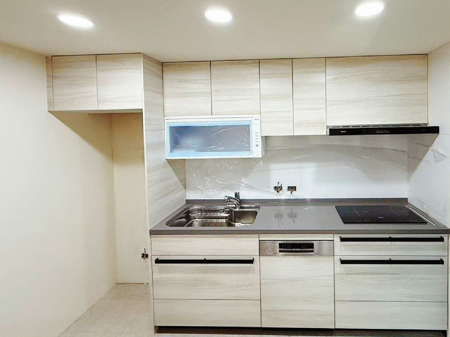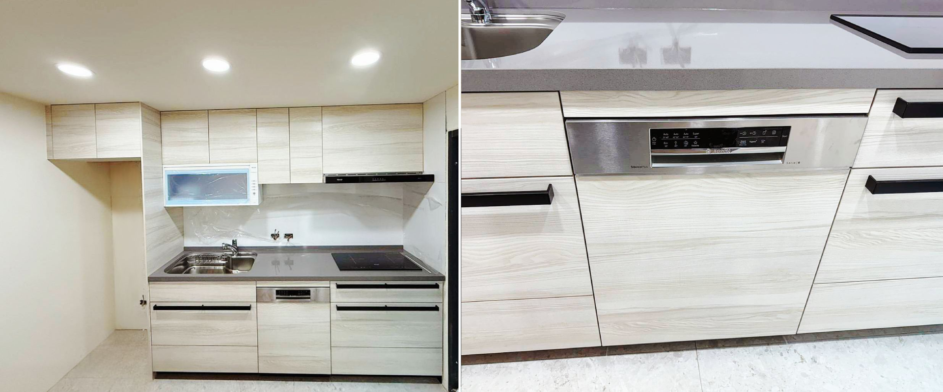 Cleanup CENTRO 系列SA-L不鏽鋼導流水槽搭配賽麗石檯面(CS-102),維持檯面乾爽與優雅,E3M白橡木色門片營造溫馨氛圍;家電嚴選林內商品;恬靜舒適,成為美學與機能兼具的理想廚房。