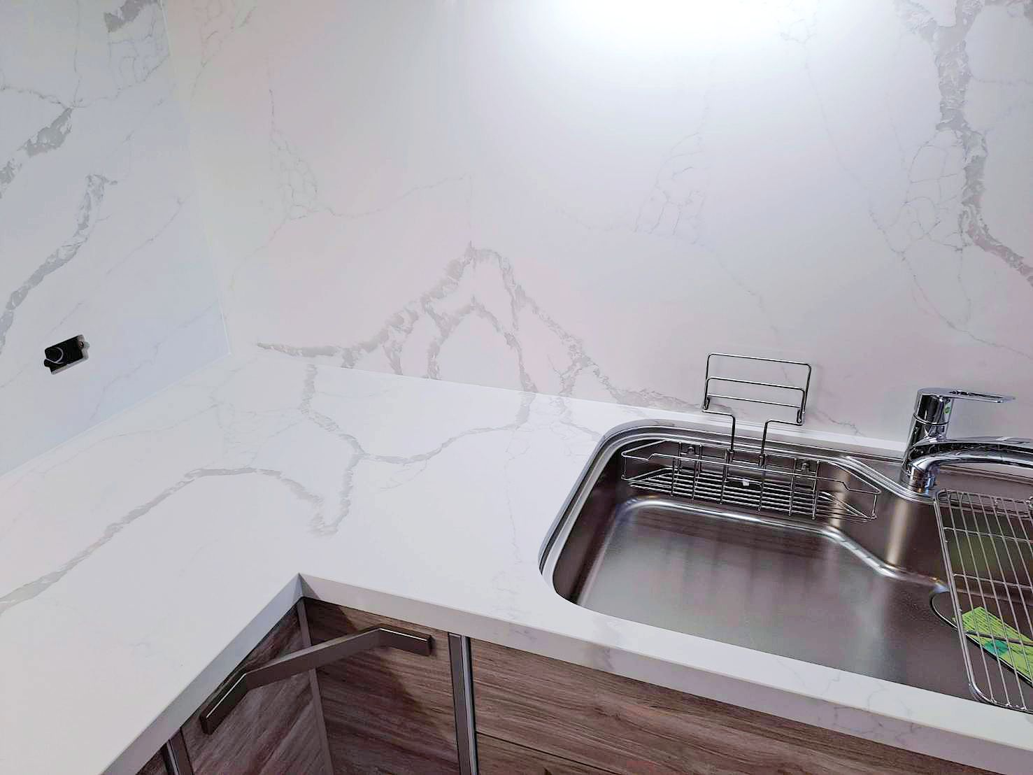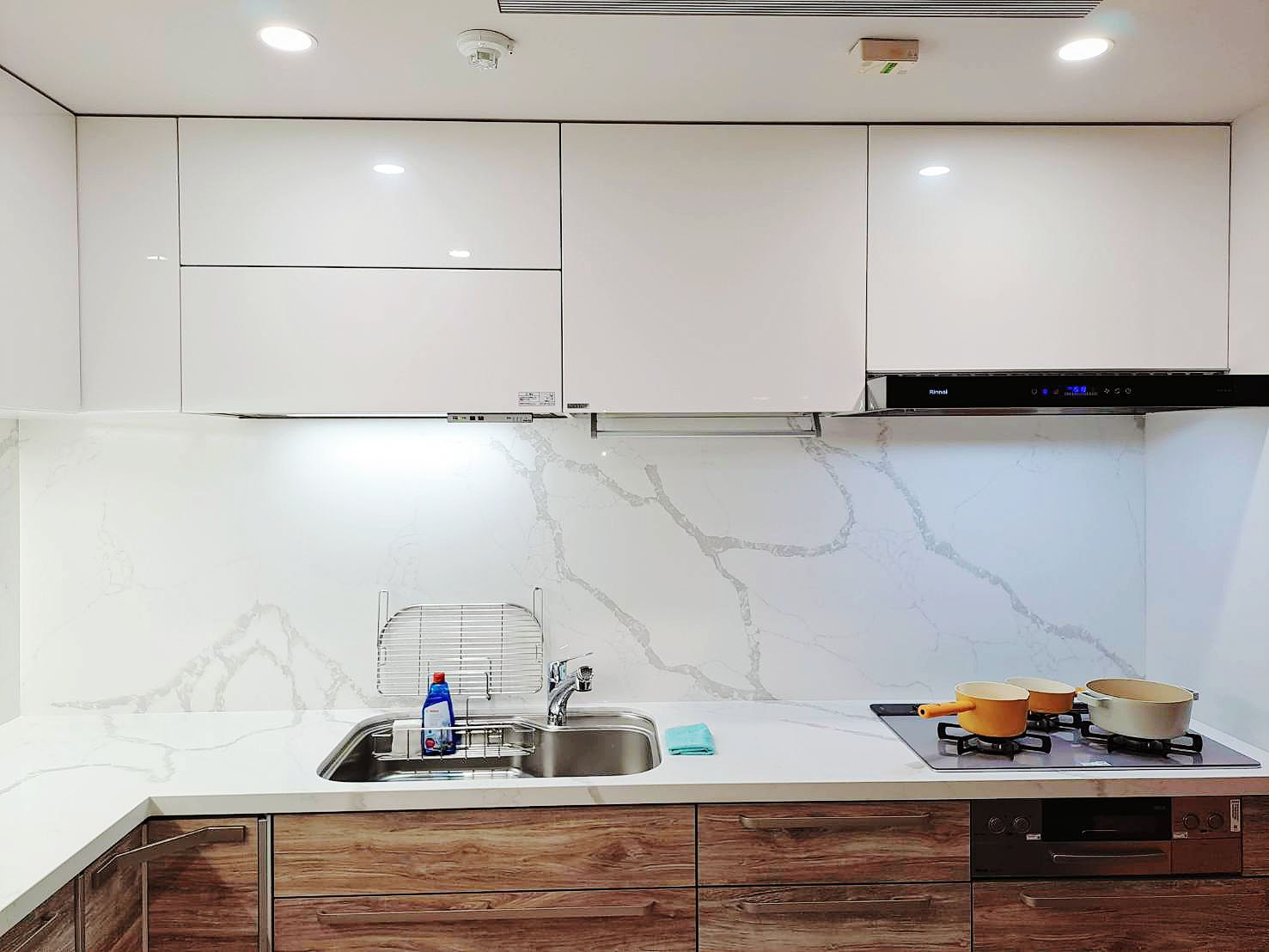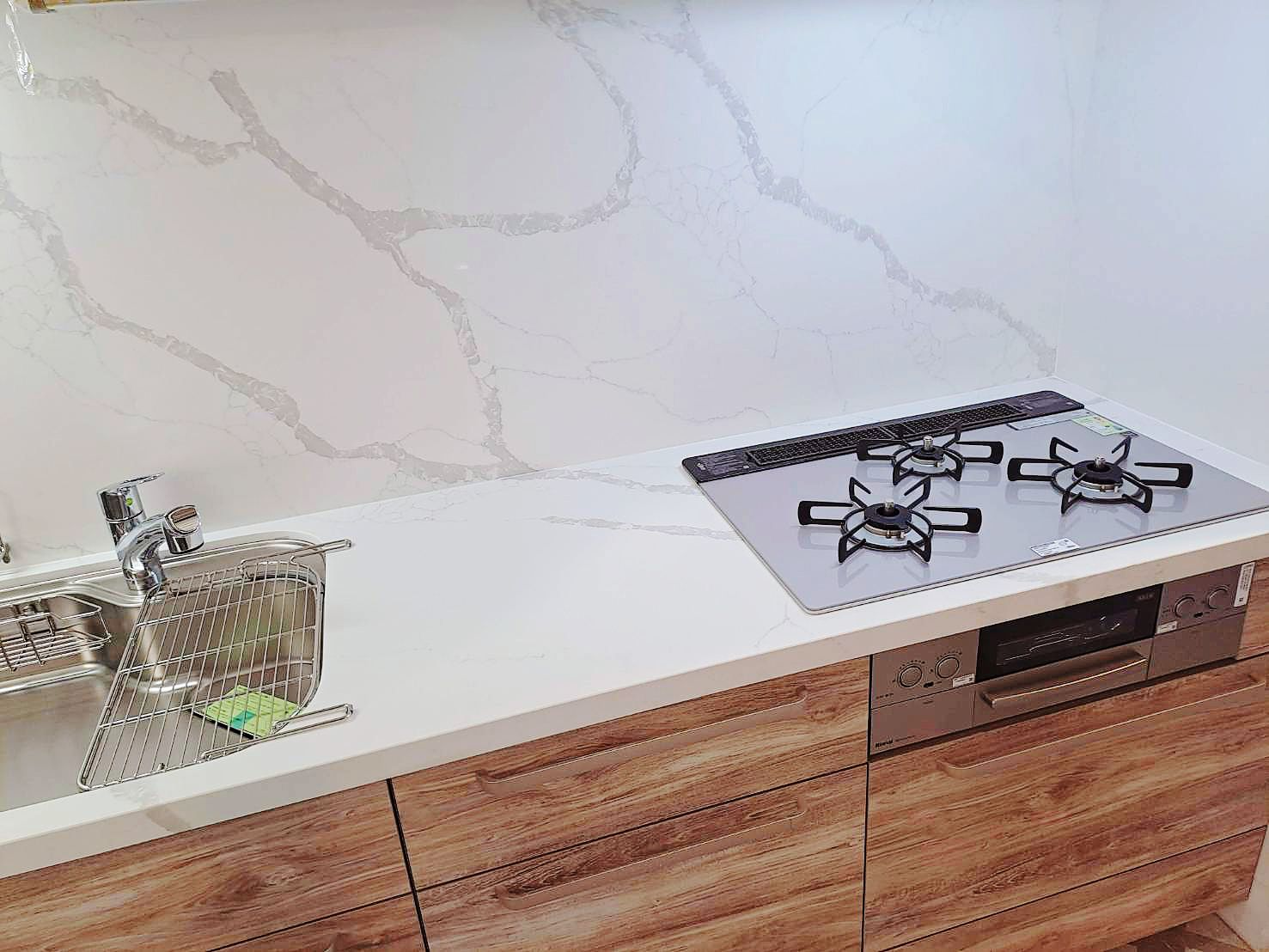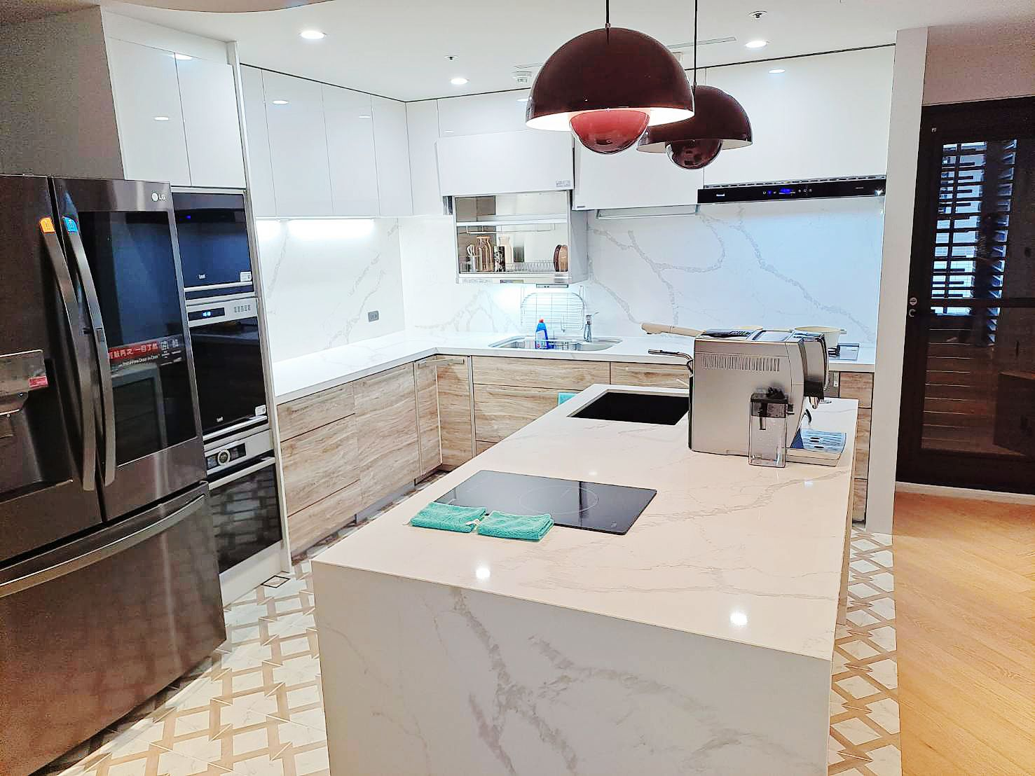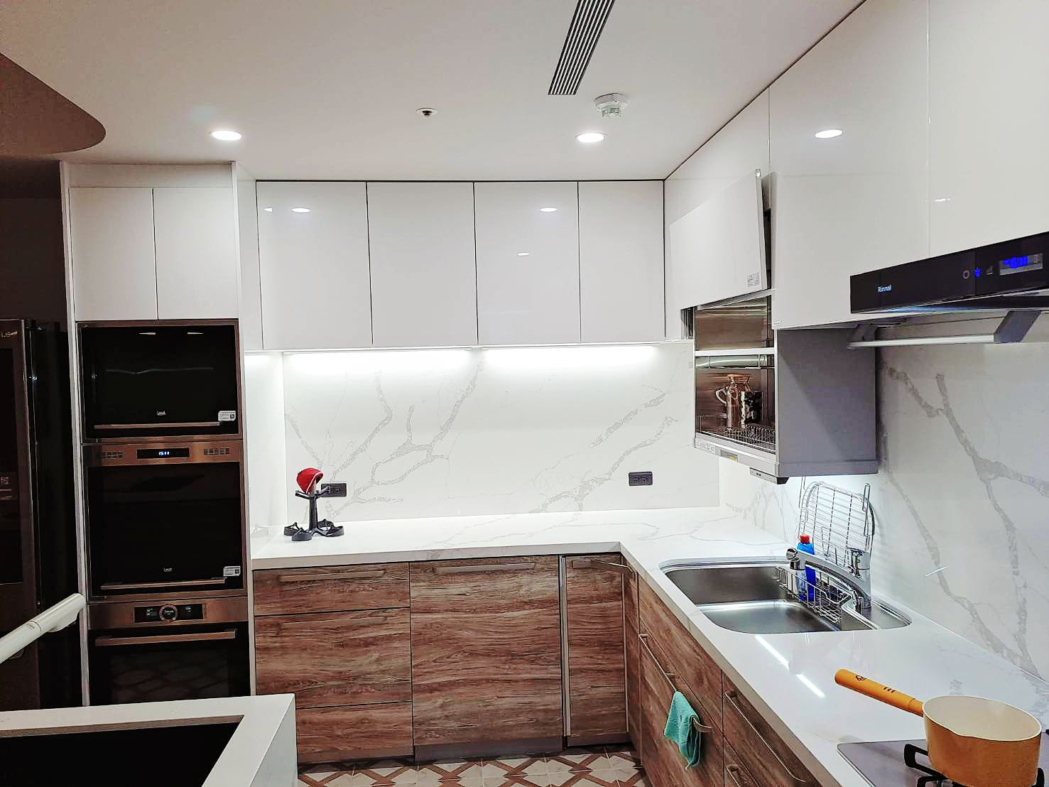 上櫃純淨典雅(CNA色)與下櫃溫潤沉穩 (CSK色)門片,搭配明亮光澤的檯面晶華石JH-5009與相同大器紋理壁板 ,工法細緻,下櫃也與地板紋路呼應,視覺低調奢華,將美學與功能完美結合。