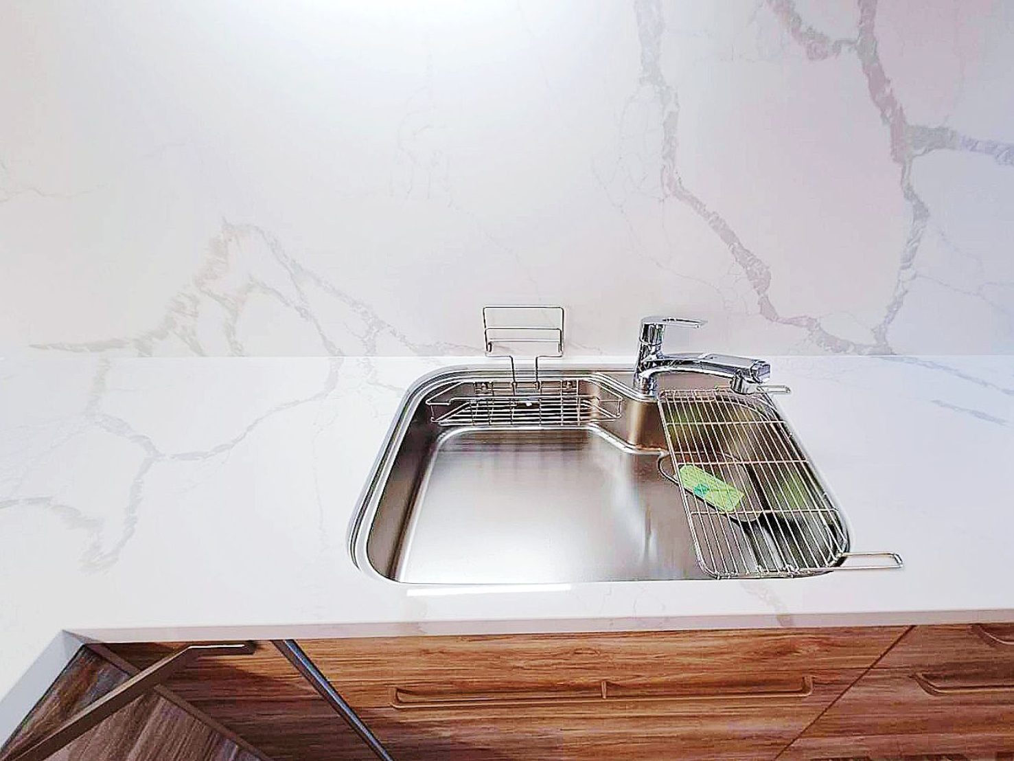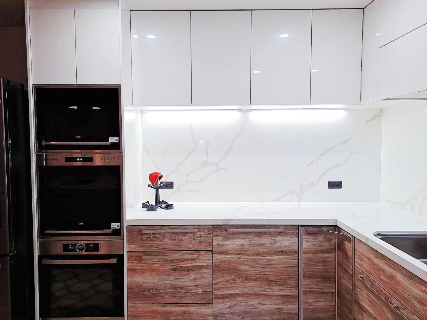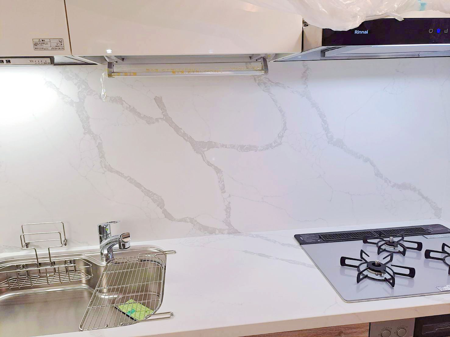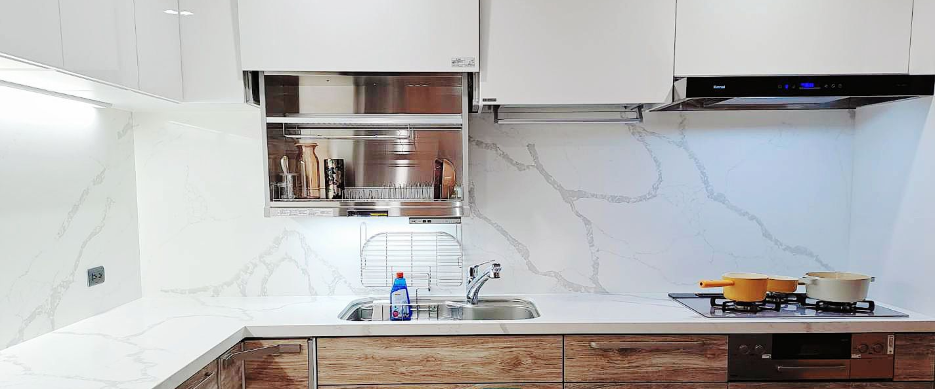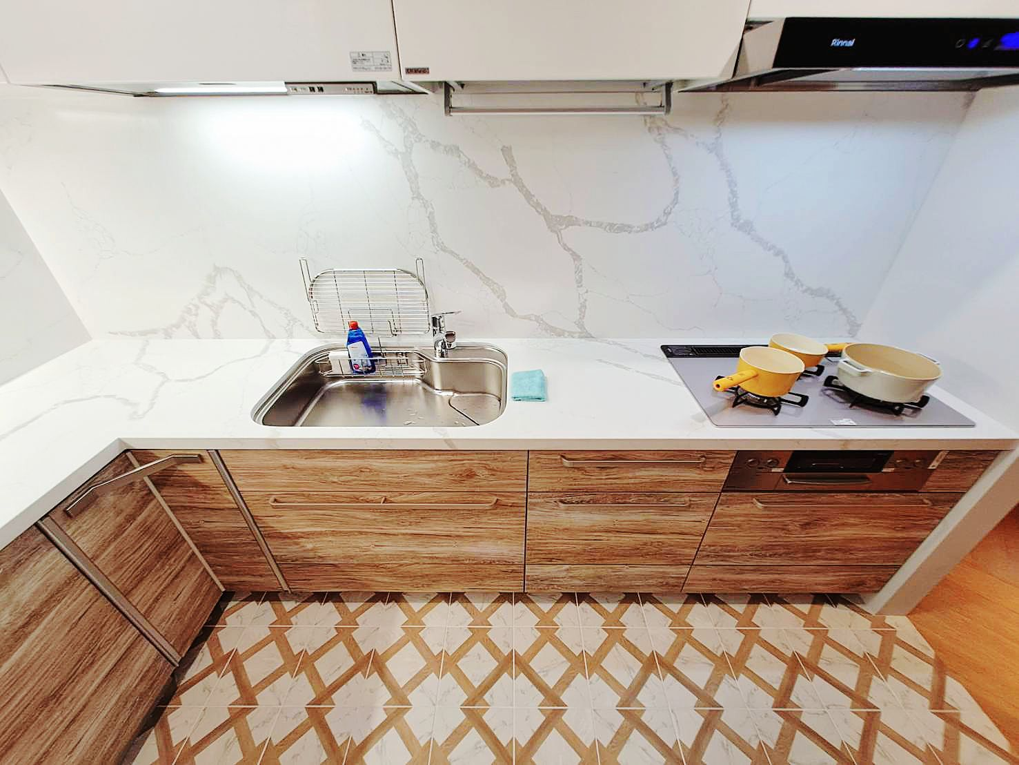 上櫃純淨典雅(CNA色)與下櫃溫潤沉穩 (CSK色)門片,搭配明亮光澤的檯面晶華石JH-5009與相同大器紋理壁板 ,工法細緻,下櫃也與地板紋路呼應,視覺低調奢華,將美學與功能完美結合。