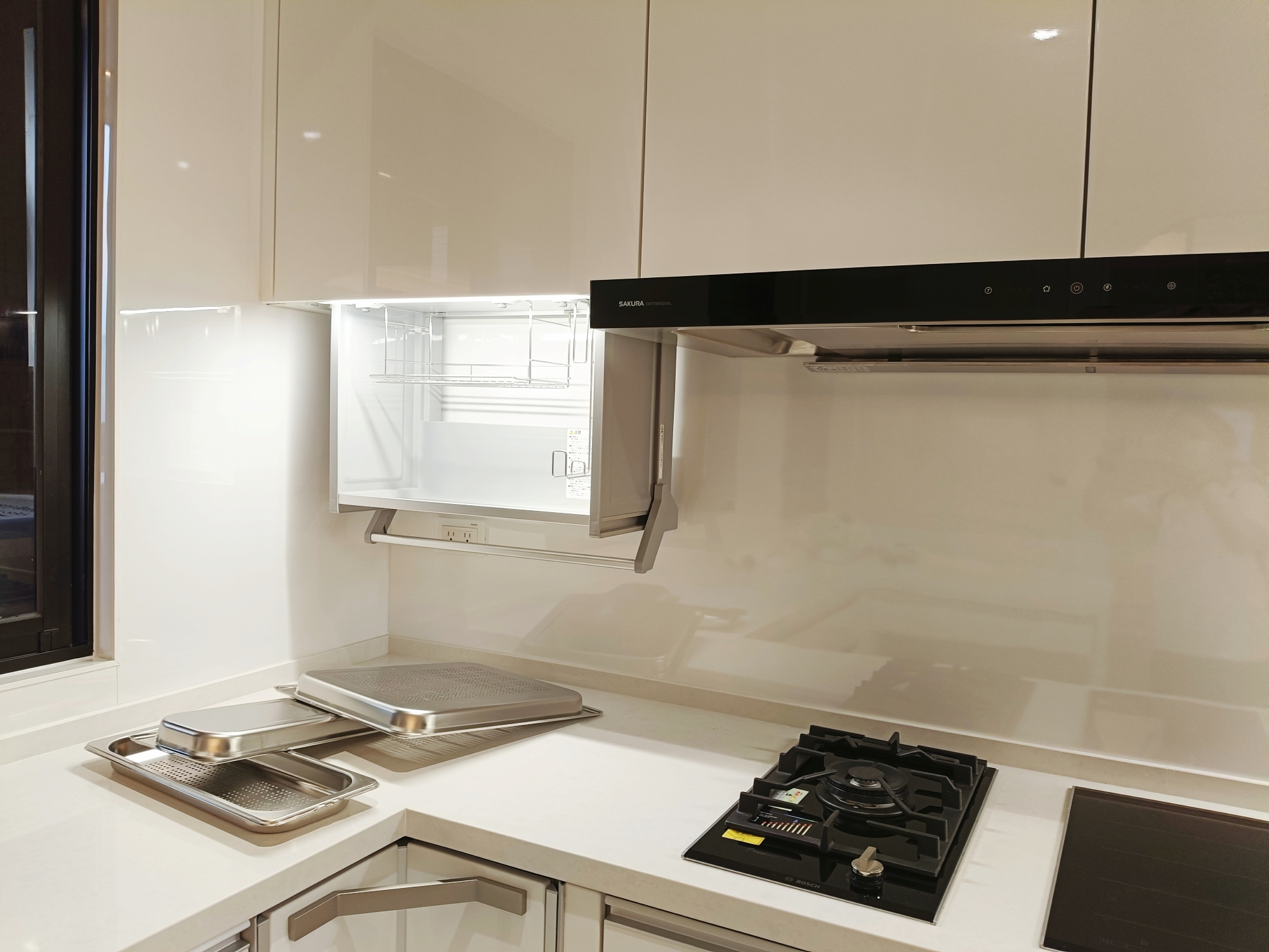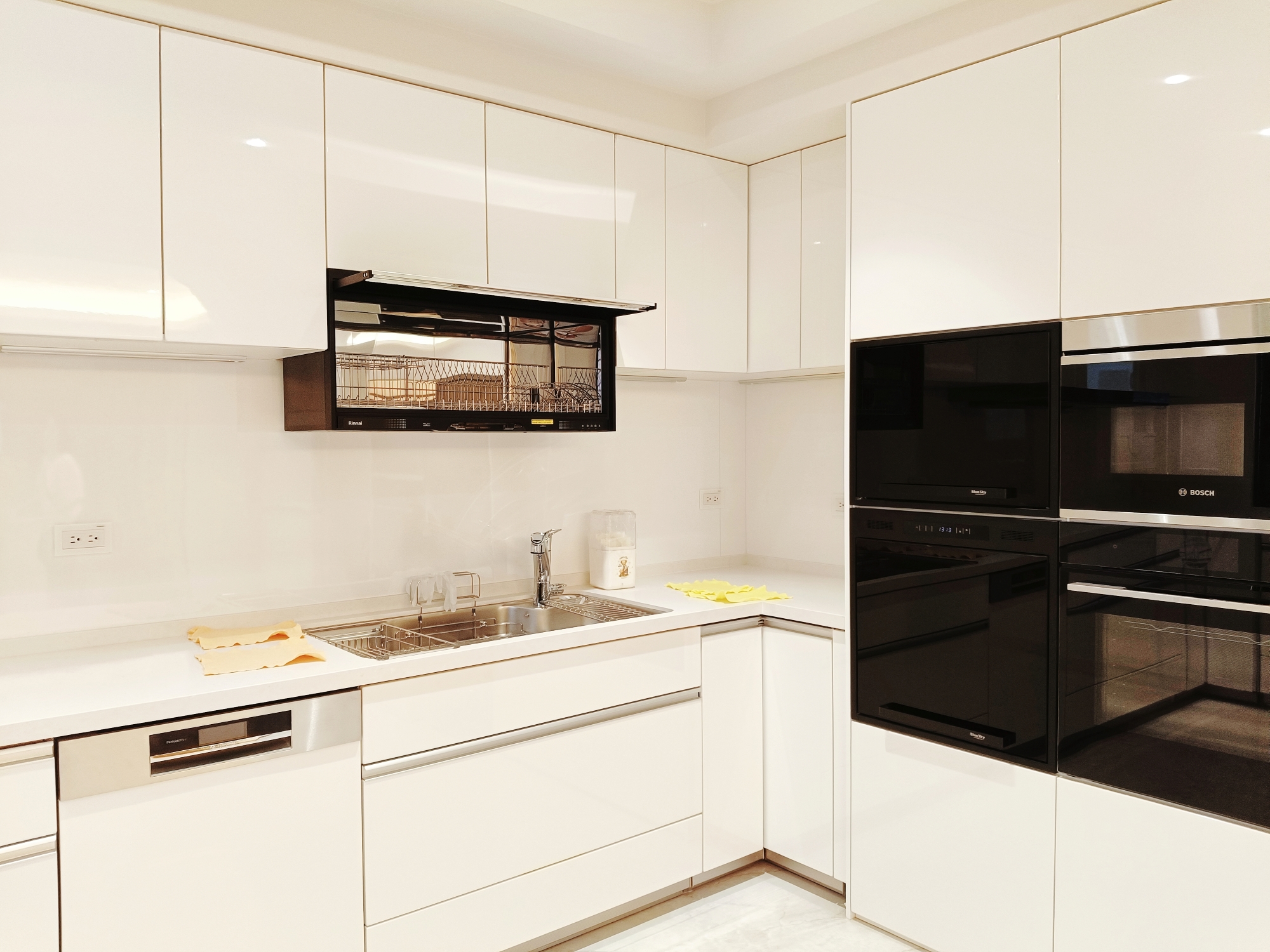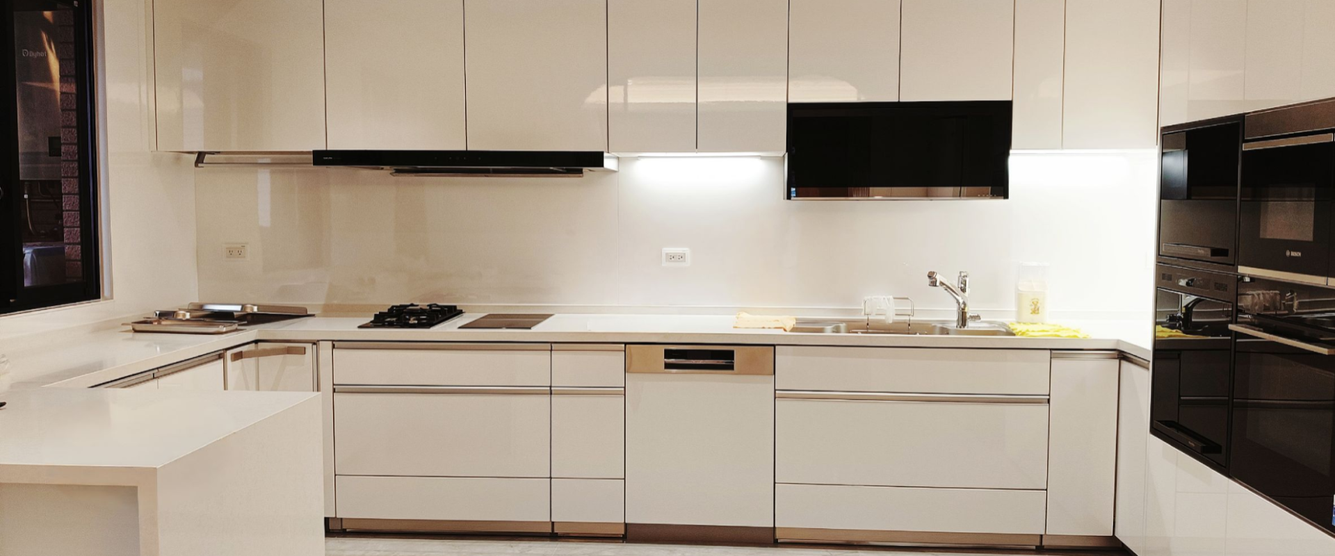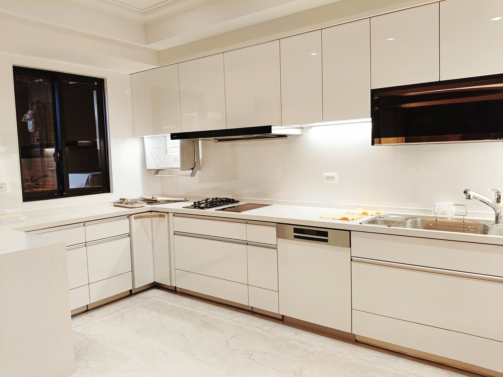 以現代極簡風格的ㄇ型廚具為主體,含中島,採用STEDIA Class03 CNA的門片,檯面選用愷薩金石4600;多樣化功能巧妙隱藏於簡潔的外觀之下,創造出一個既現代又極具效率的理想廚房。