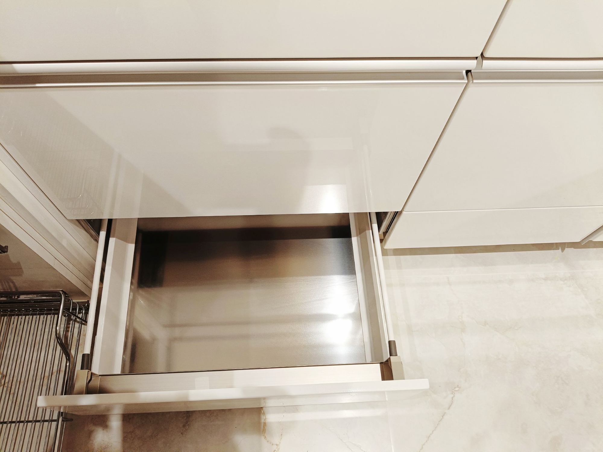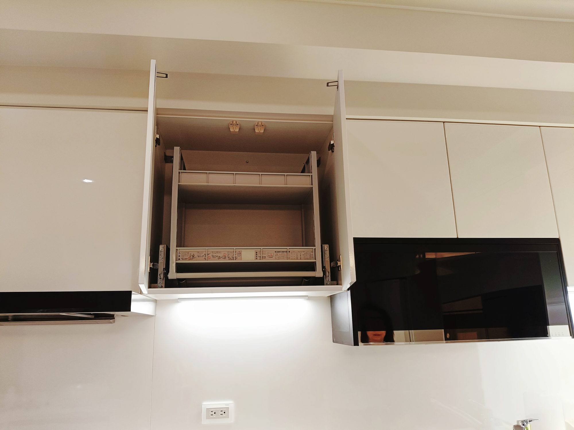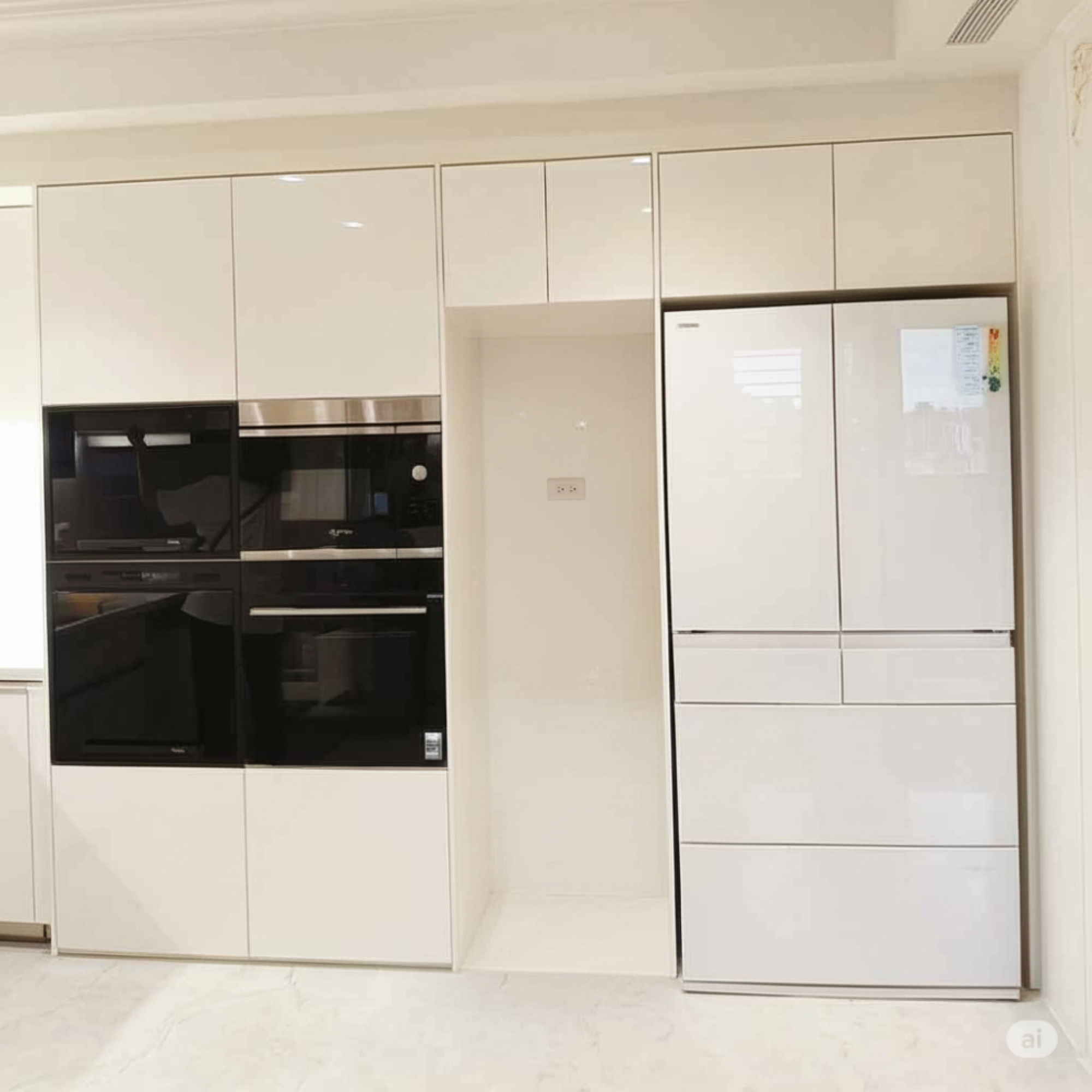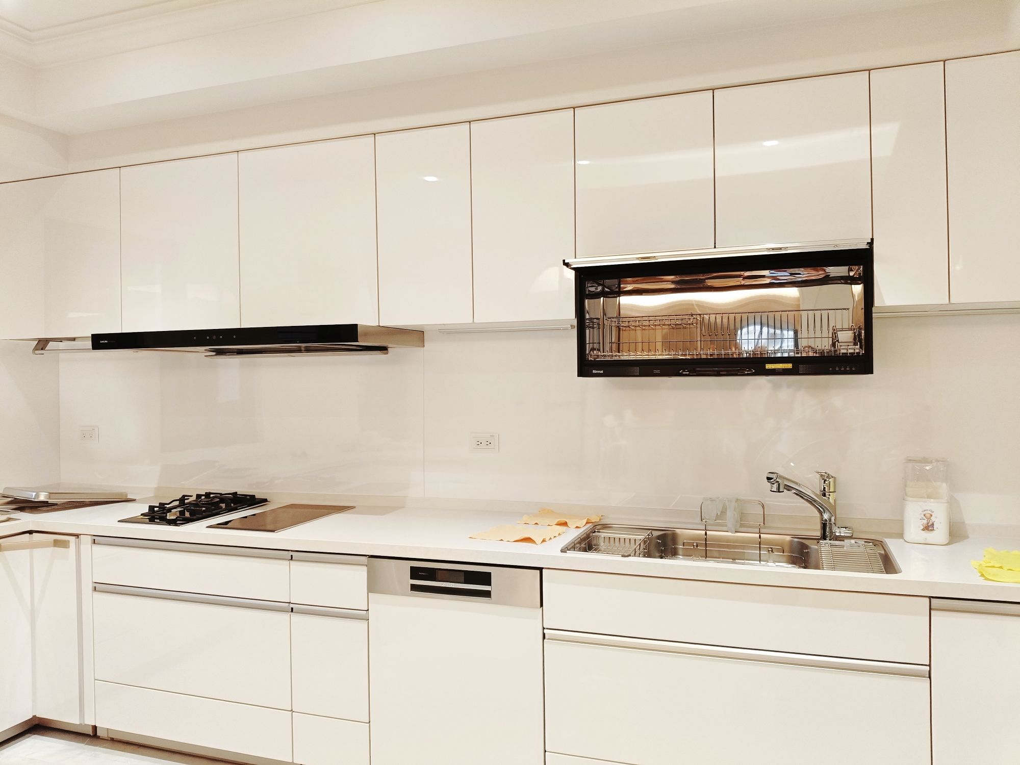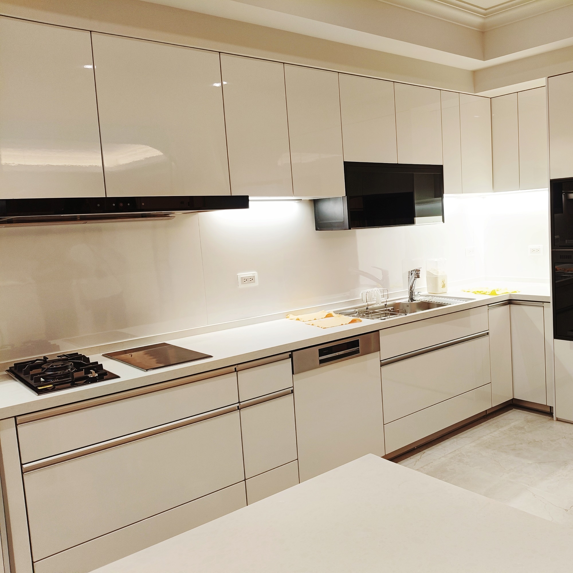 以現代極簡風格的ㄇ型廚具為主體,含中島,採用STEDIA Class03 CNA的門片,檯面選用愷薩金石4600;多樣化功能巧妙隱藏於簡潔的外觀之下,創造出一個既現代又極具效率的理想廚房。