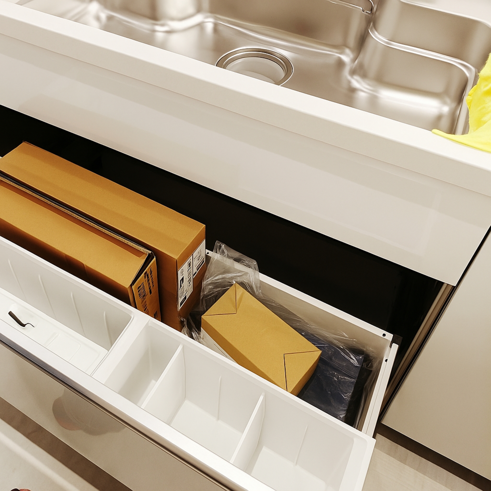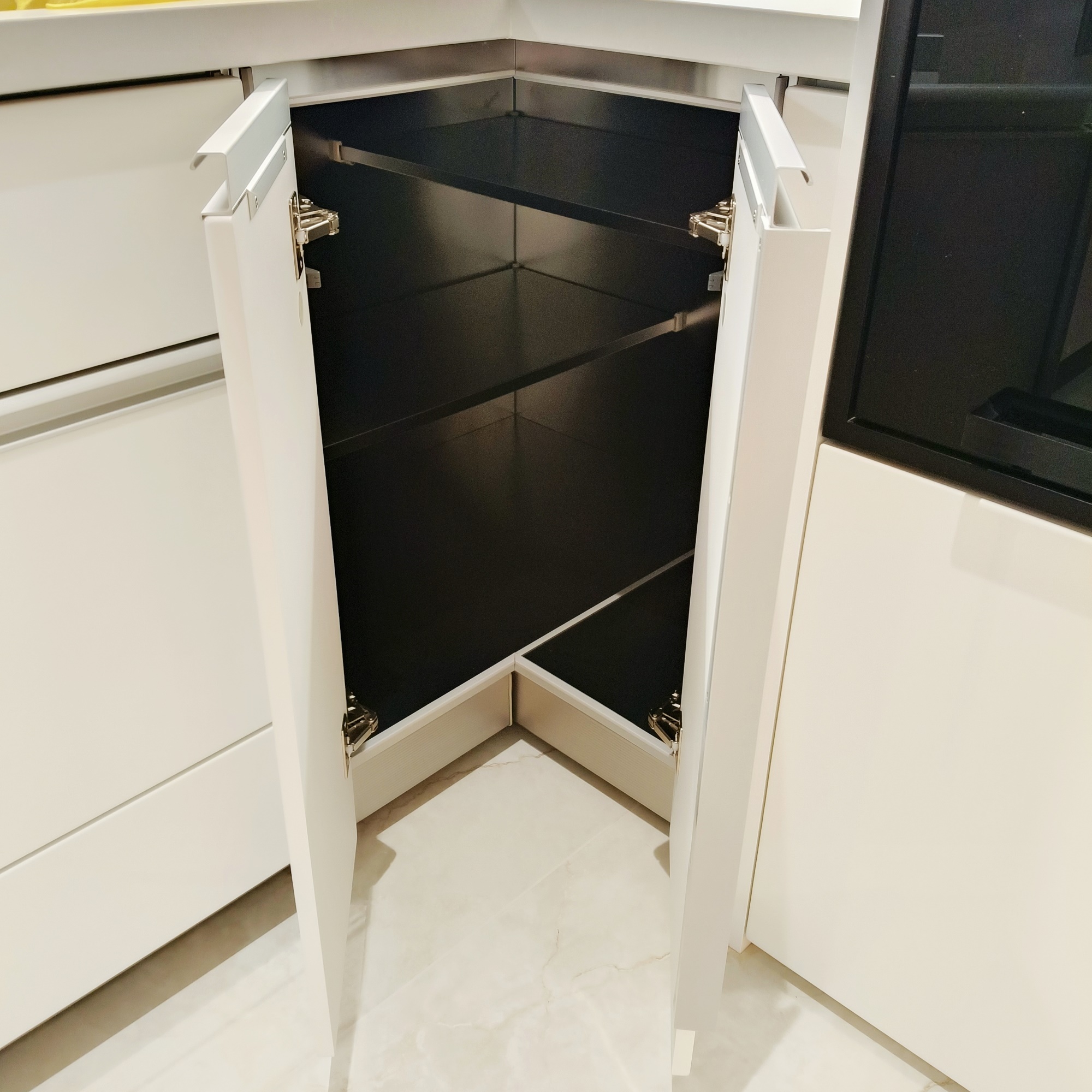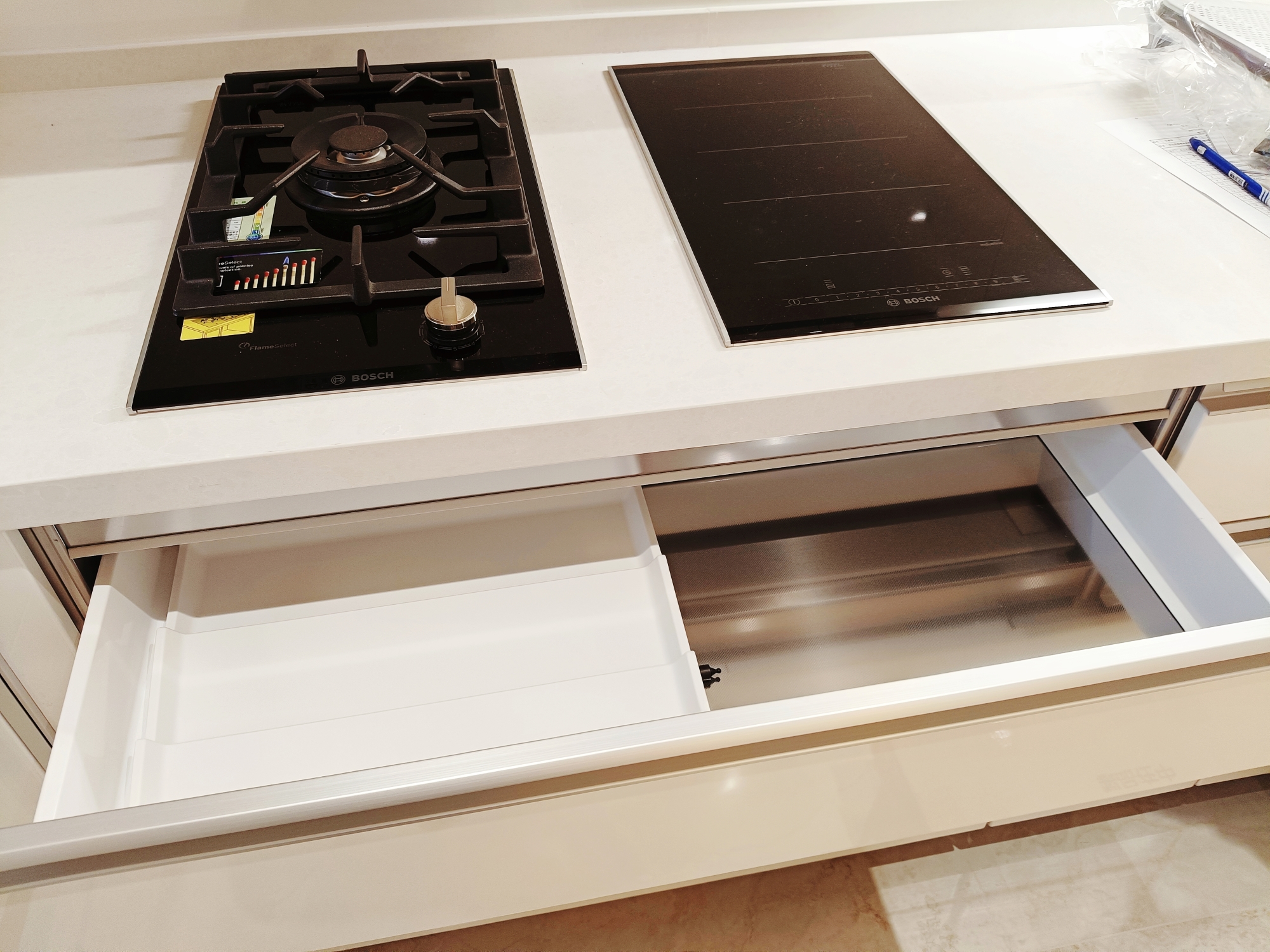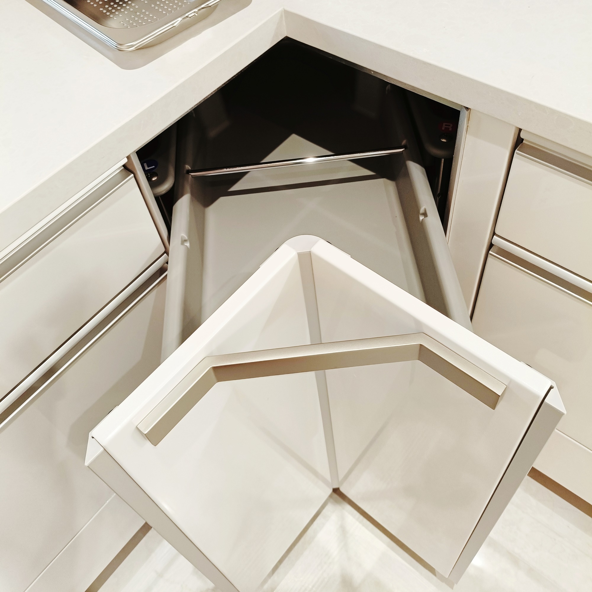 以現代極簡風格的ㄇ型廚具為主體,含中島,採用STEDIA Class03 CNA的門片,檯面選用愷薩金石4600;多樣化功能巧妙隱藏於簡潔的外觀之下,創造出一個既現代又極具效率的理想廚房。