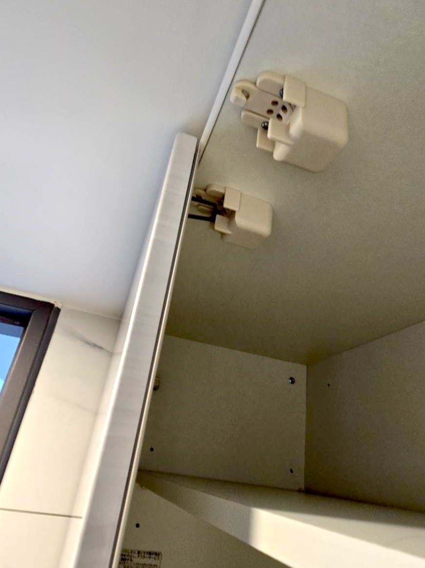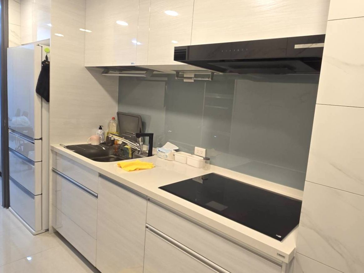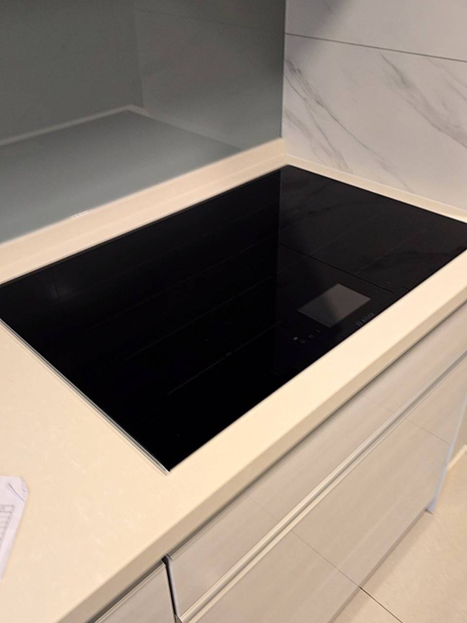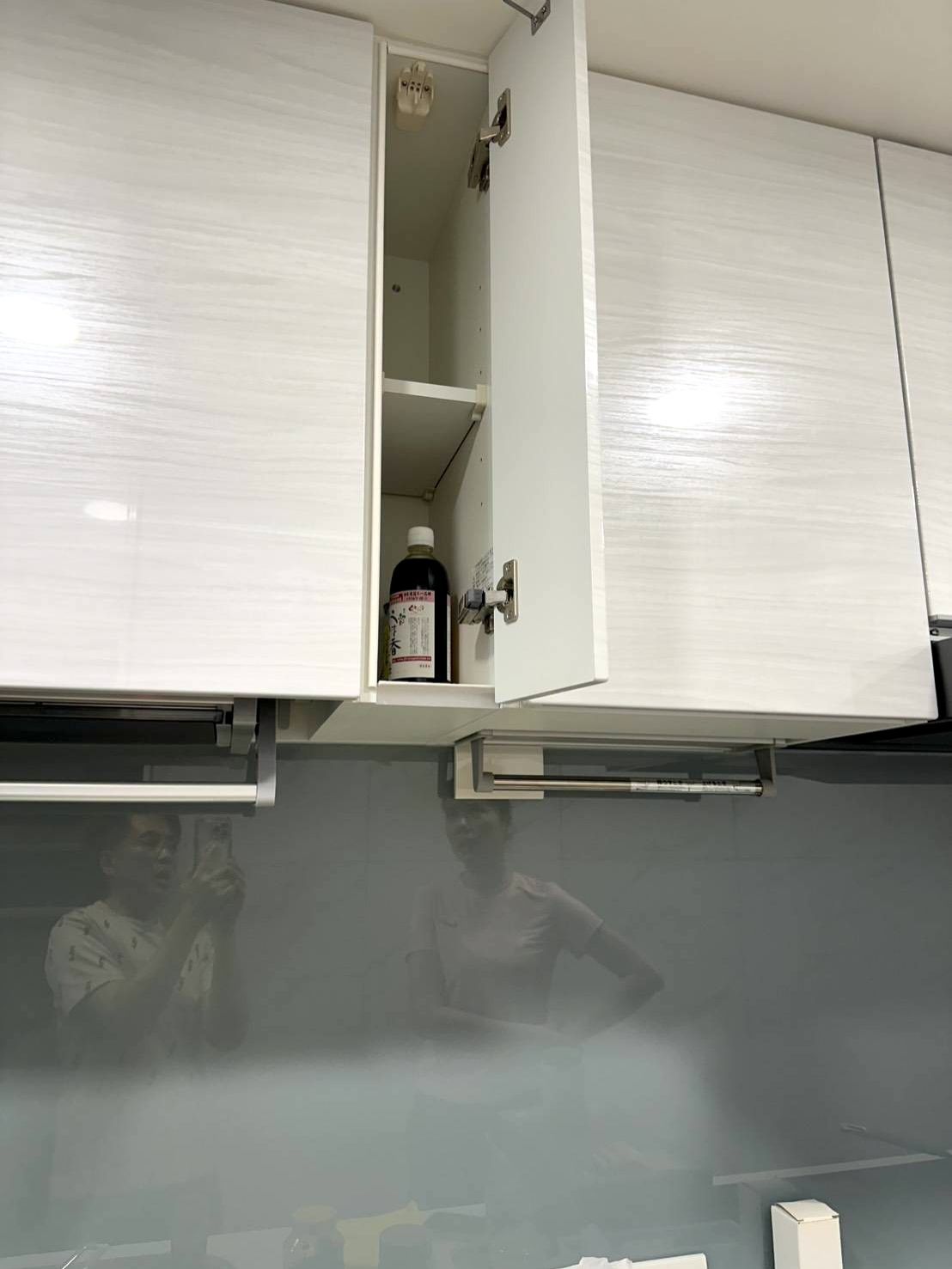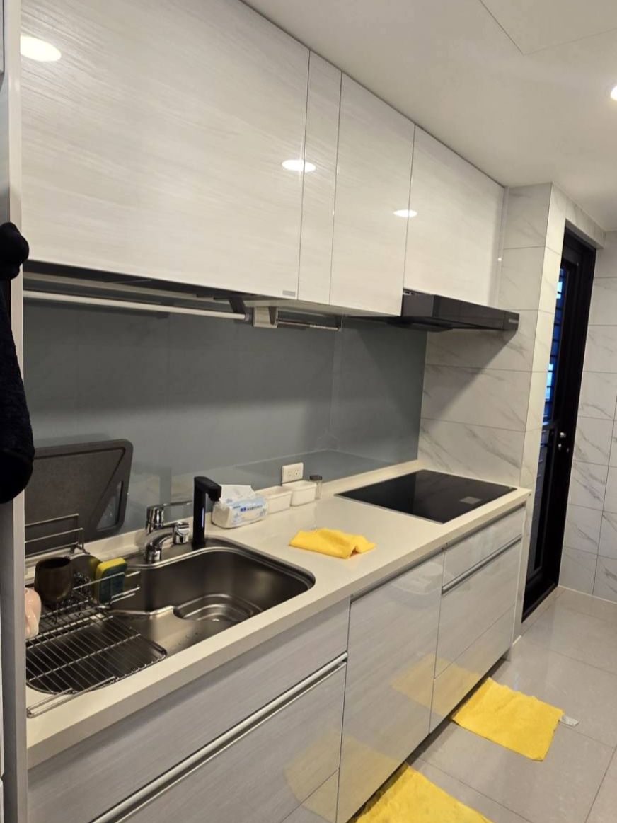 設計師選用 Cleanup STEDIA Class03 CHK 色門片,其細膩的灰白木質紋理,讓廚房空間充滿溫潤質感,搭配凱薩金石棉白色檯面,營造出和諧的層次感,銀色的隱藏式把手設計更是神來一筆,不僅簡潔俐落,也讓整體風格更顯純粹,與整體廚房牆壁與地板相呼輝映。