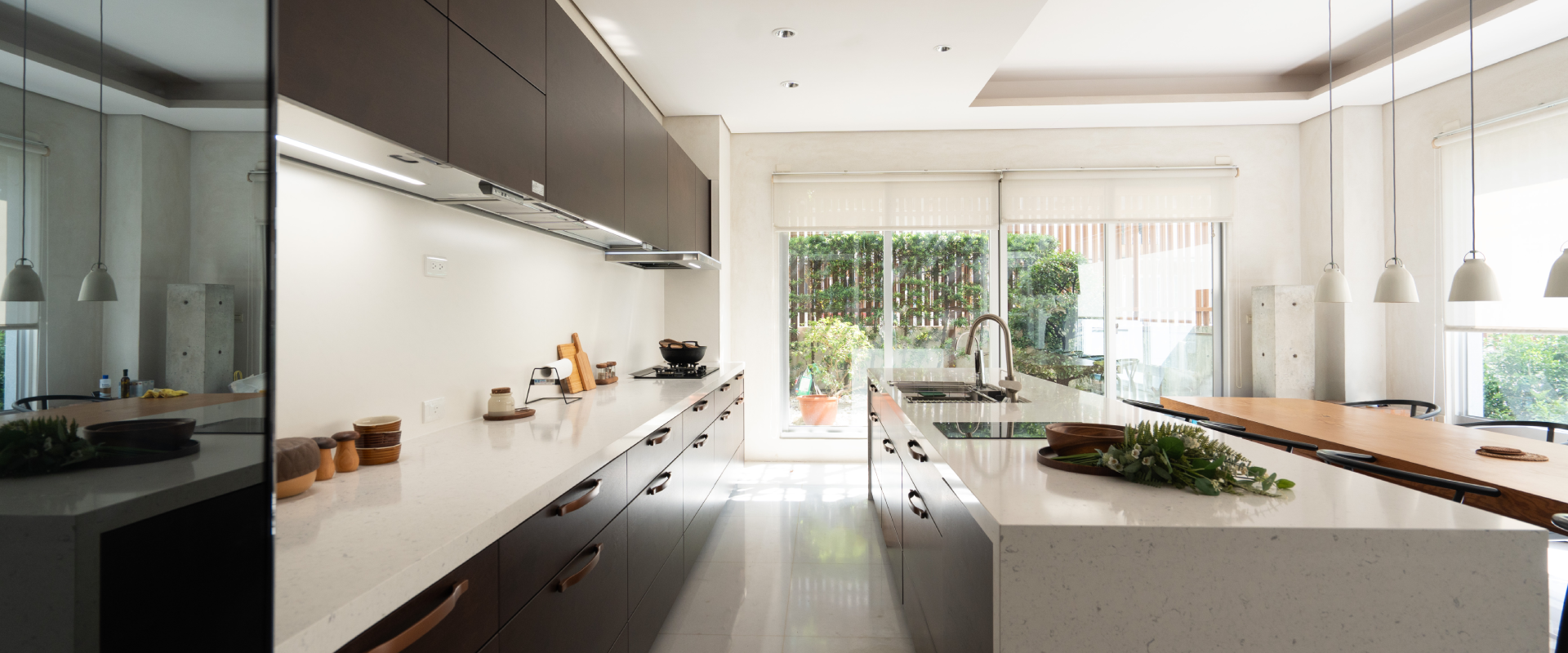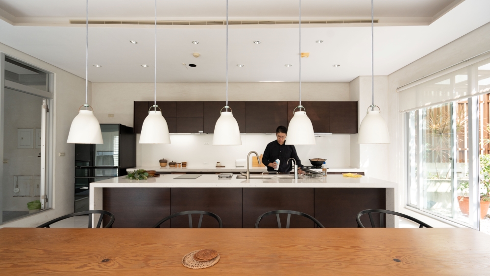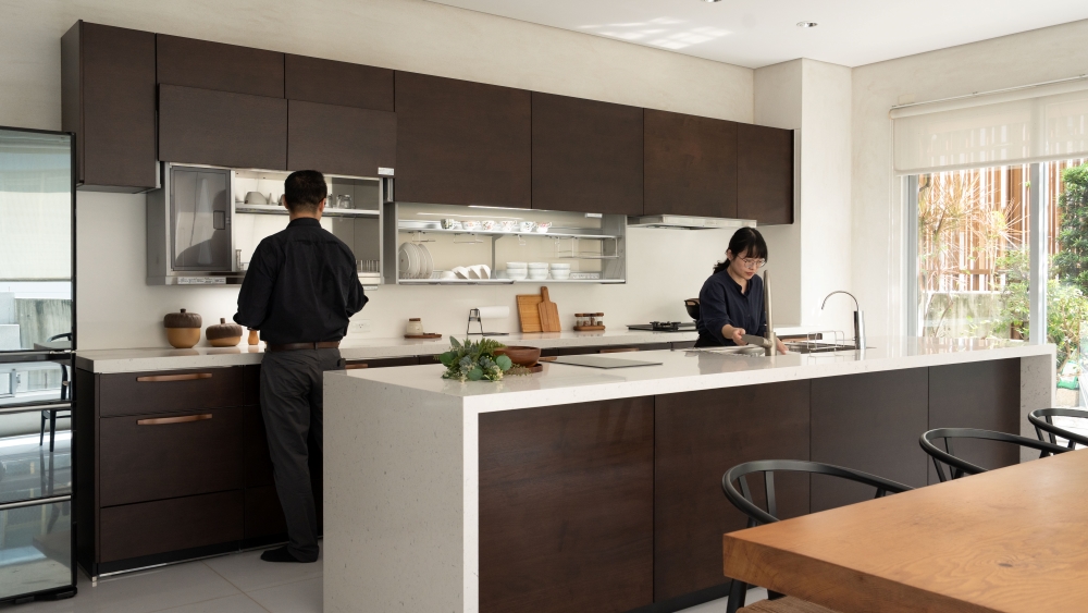 (德匠名廚)臺南東興展示中心-王子元設計師 表示:屋主現場採光良好,選用實木貼皮門片來讓自然光線與實木貼皮的光影效果得到極大的昇華及提升。水槽設計於中島,來提升後方檯面空間,以便屋主擺放小家電,上方改採用電動升降櫃來幫助收納的便利性。