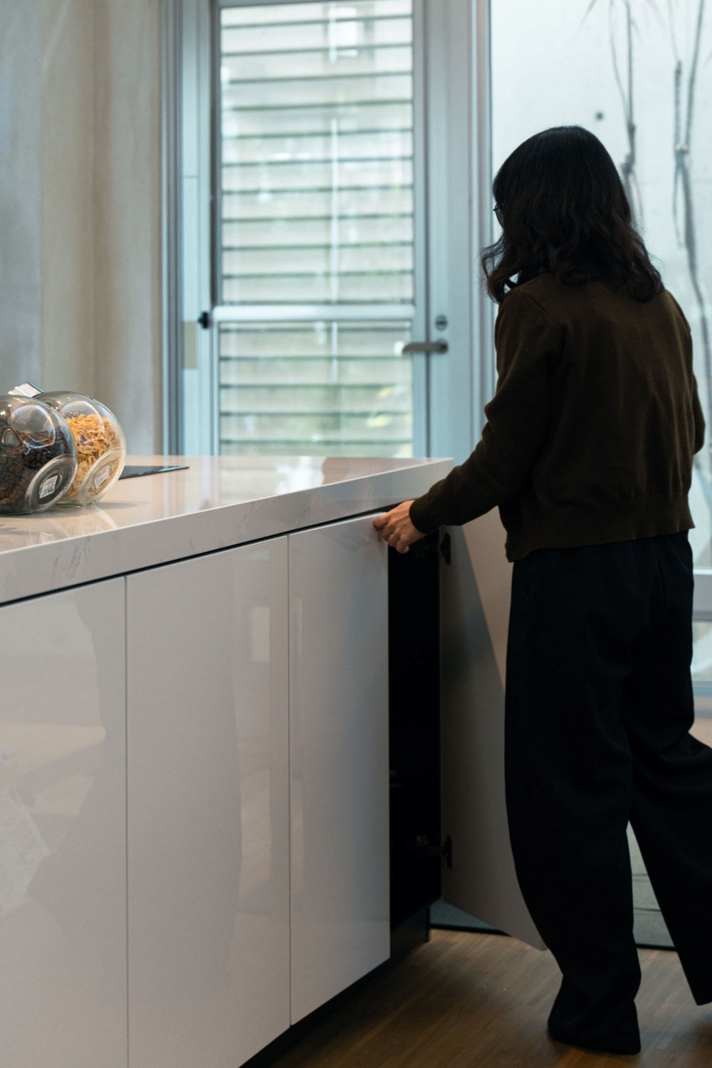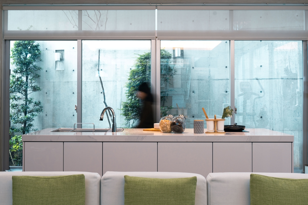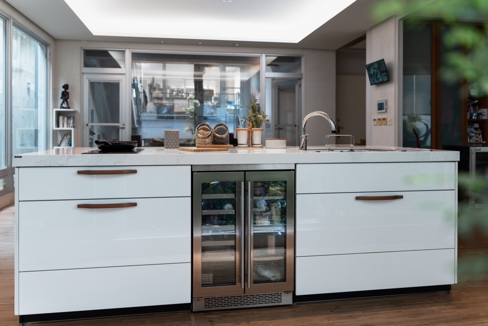 (德匠名廚)臺南東興展示中心-王子元設計師 表示:在沙發正後方的位置,安裝上全家夢想的輕食廚房,採用間單大方CNA白色門片去襯托後方清水模圍牆,讓後院的綠樹與沙發的綠色抱枕相互輝映,讓CNA成為家中的中心,並讓家人料理時能後與運動的家人一同歡樂。中島下方採用紅酒飲料櫃,客廳中的家人無需跑到廚房拿取紅酒飲料,讓空間動線得到最大的運用。