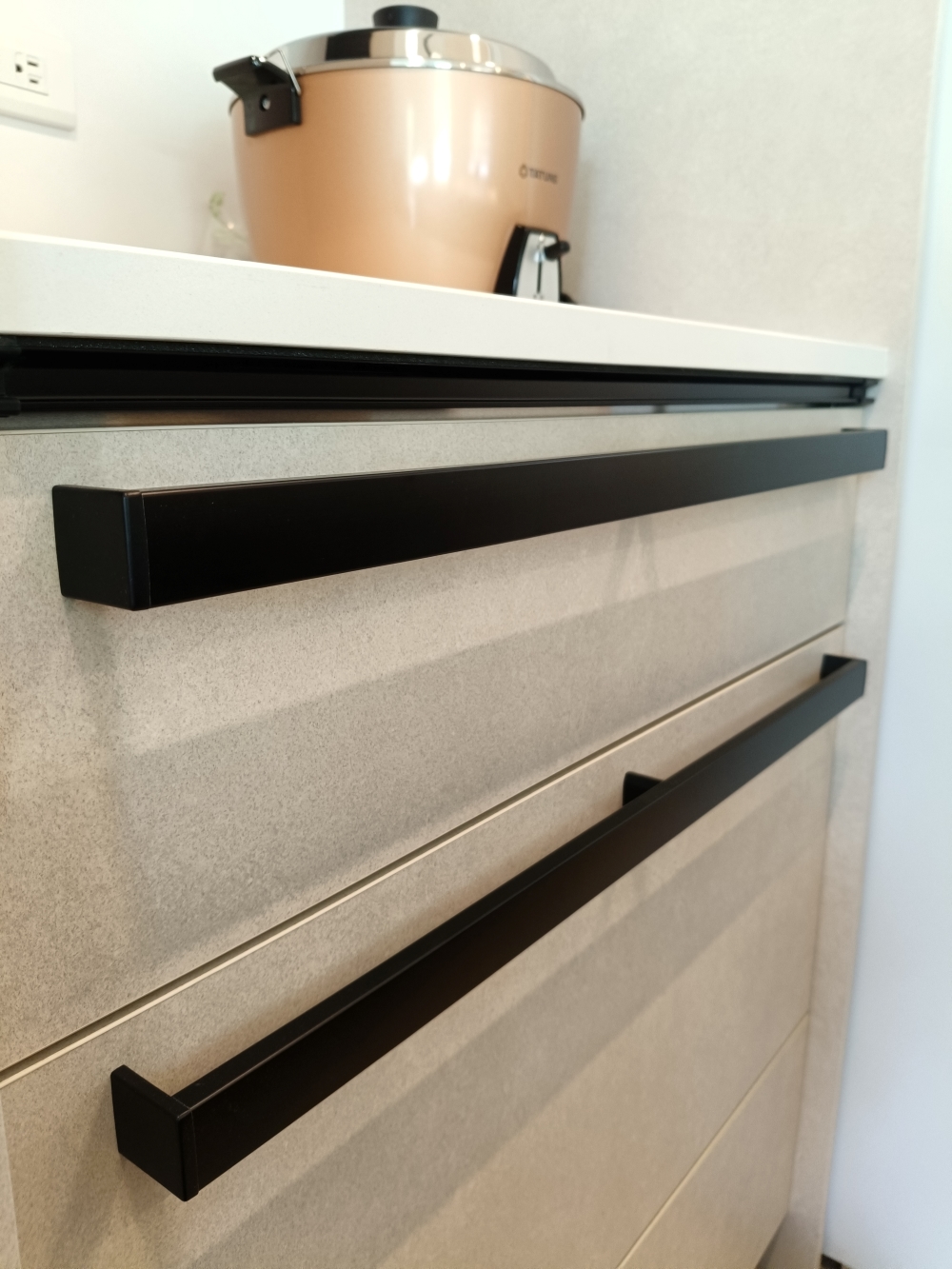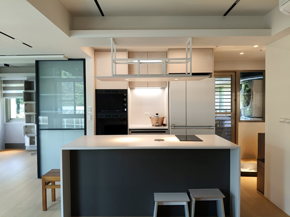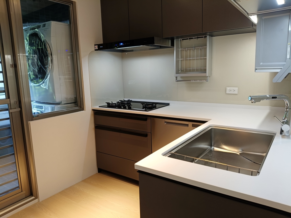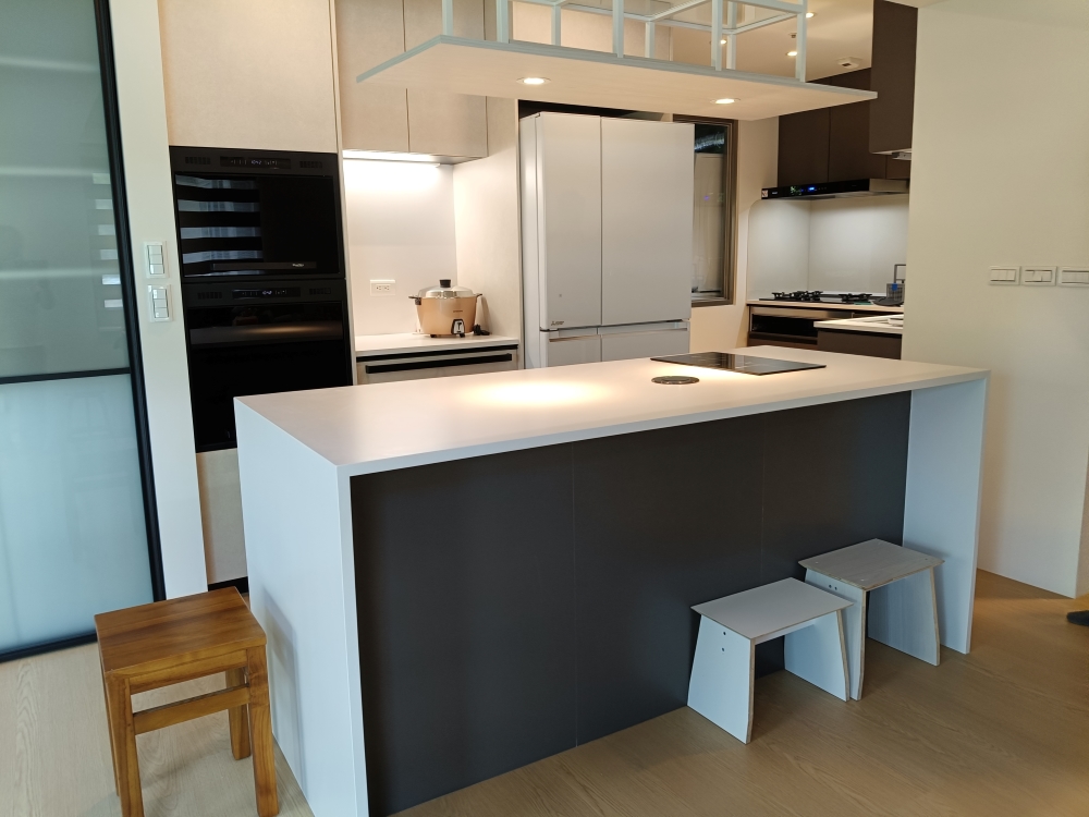 Cleanup小空間的機能美學!設計師以Cleanup CENTRO的CAV與CUL優雅配色,搭配黑色凸把手,營造俐落現代感,開放中島設計結合電器櫃,讓料理動線更順暢;檯面選用賽麗石CS-503,耐刮耐污又具時尚光澤,搭載電動升降烘碗機吊櫃與下拉式吊櫃,還有中島韓國升降插座,巧妙隱藏物品,收納不雜亂一應俱全;加上日本BF導流水槽實用與美感兼具,打造最懂生活的小空間廚房。