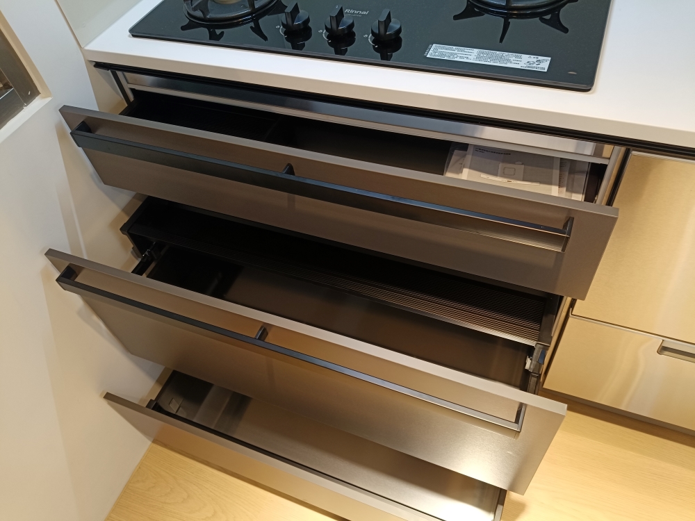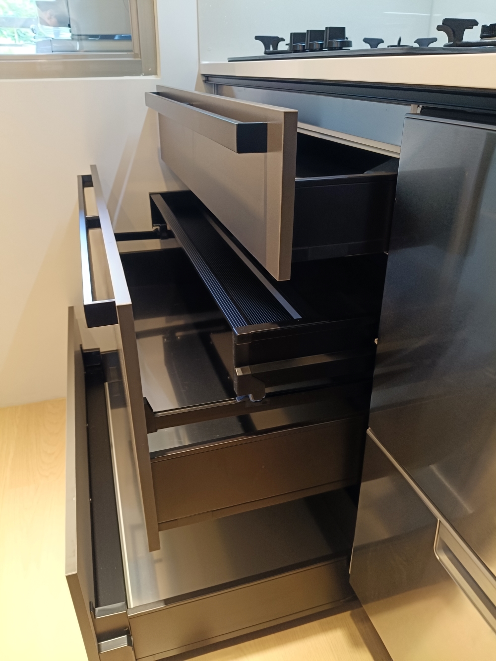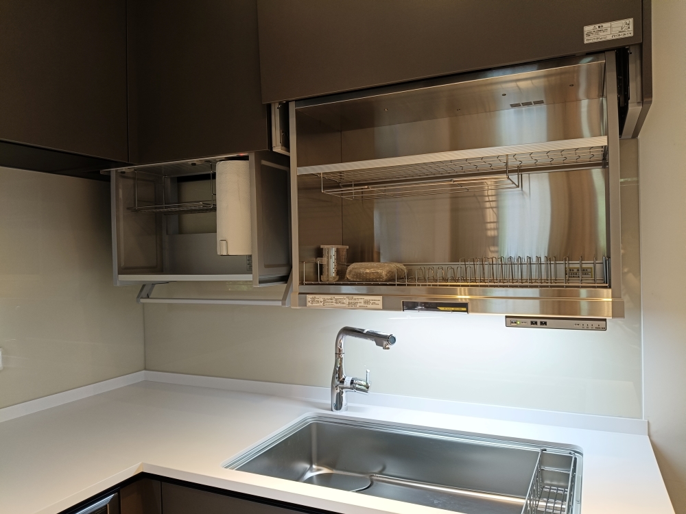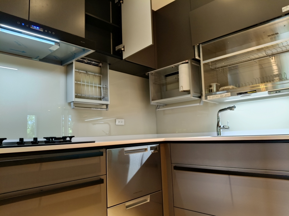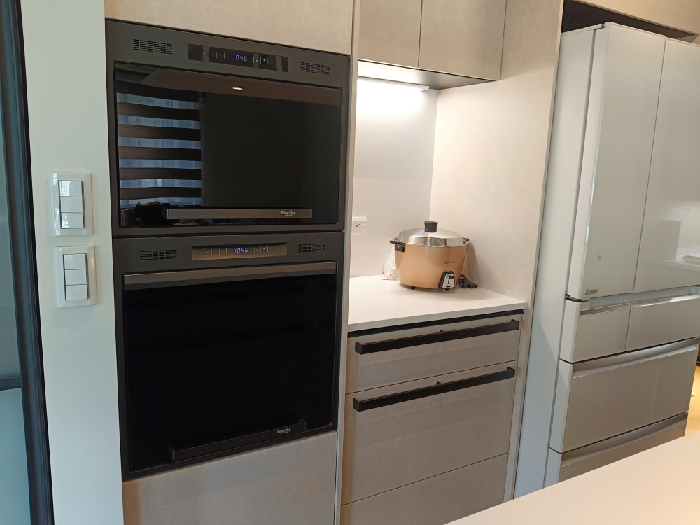 Cleanup小空間的機能美學!設計師以Cleanup CENTRO的CAV與CUL優雅配色,搭配黑色凸把手,營造俐落現代感,開放中島設計結合電器櫃,讓料理動線更順暢;檯面選用賽麗石CS-503,耐刮耐污又具時尚光澤,搭載電動升降烘碗機吊櫃與下拉式吊櫃,還有中島韓國升降插座,巧妙隱藏物品,收納不雜亂一應俱全;加上日本BF導流水槽實用與美感兼具,打造最懂生活的小空間廚房。
