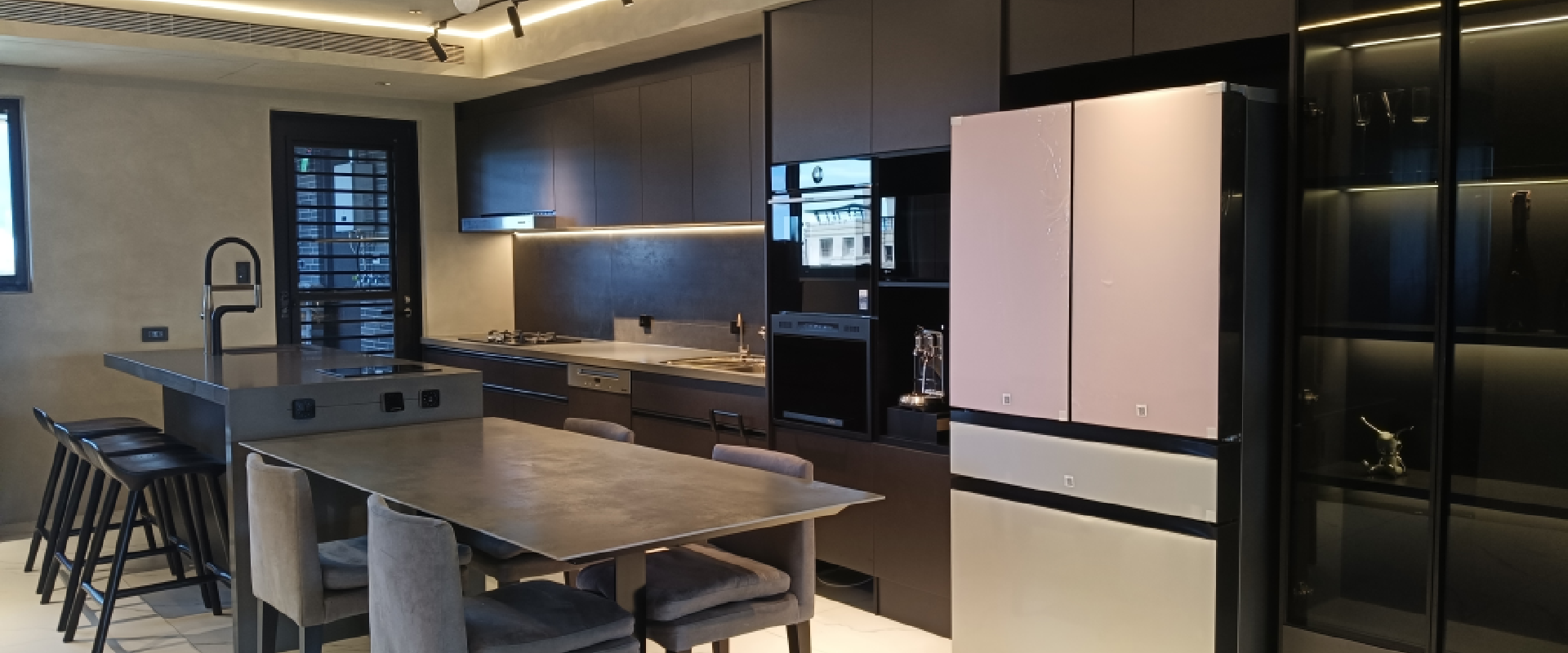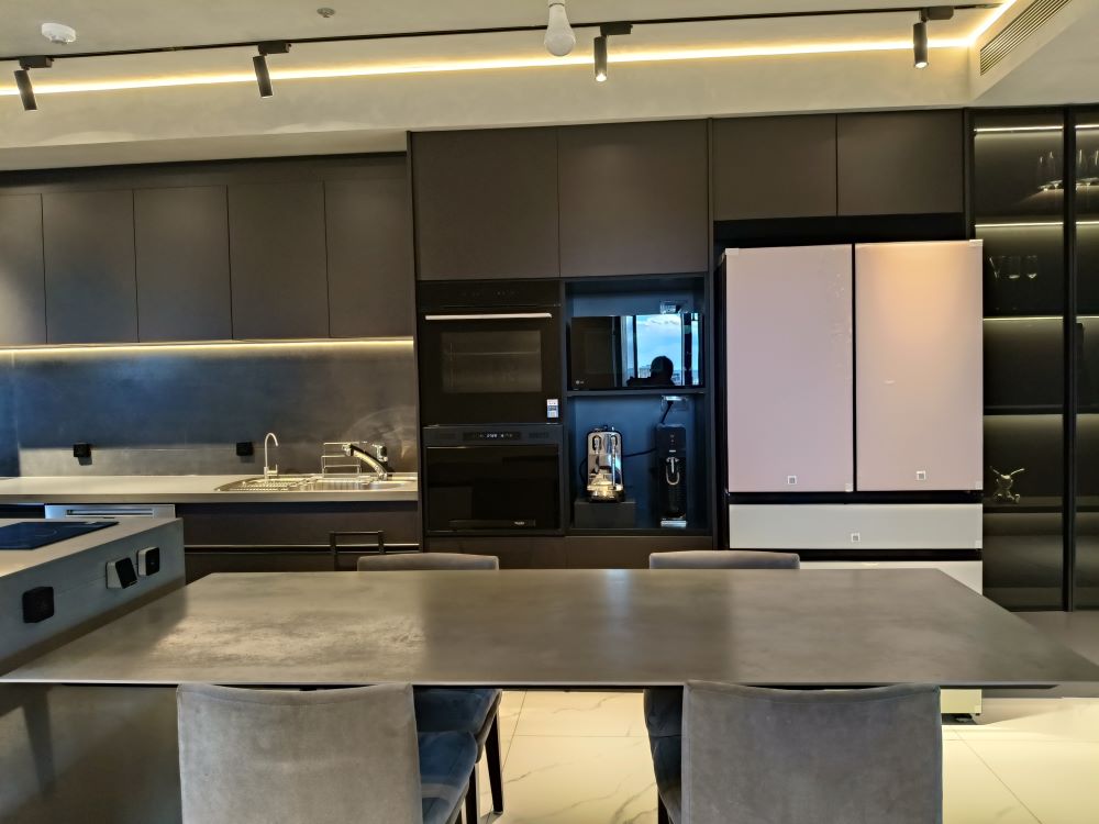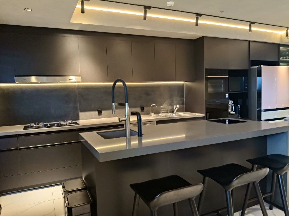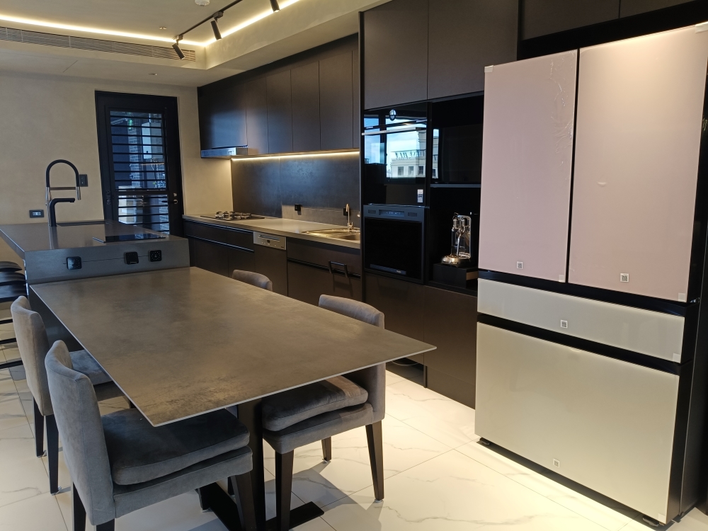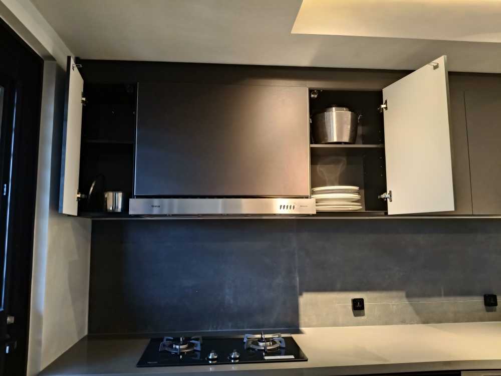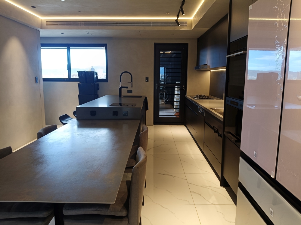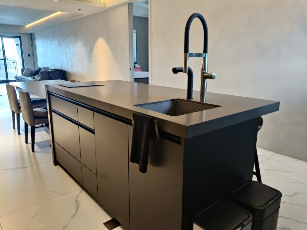 設計發想核心為「和諧」,旨在創造一個充滿質感、且與空間完美融合的廚房;櫃體門片選用 Cleanup CENTRO Class05 CUZ 色系,沉穩中帶有內斂光澤,並搭配U型黑色隱藏把手,簡約俐落的設計賦予櫃體優雅的延伸感,檯面選用具現代感的 愷薩金石2003鈦金灰;整體廚房除了實用機能之外,更是專為屋主一家量身打造的藝術空間。