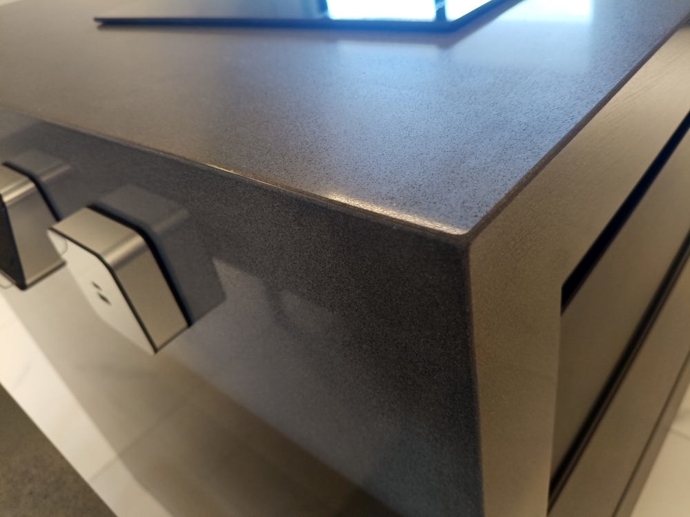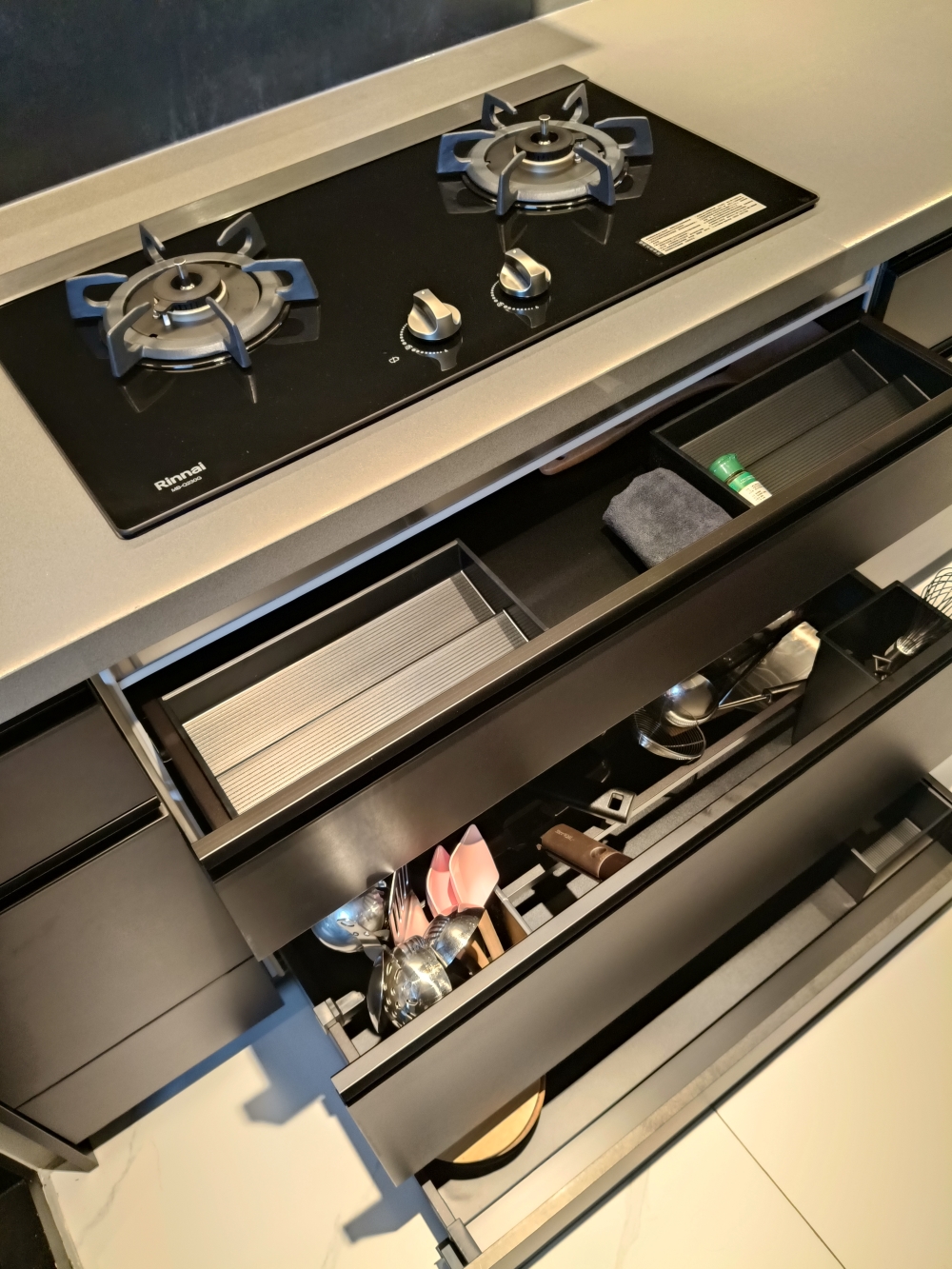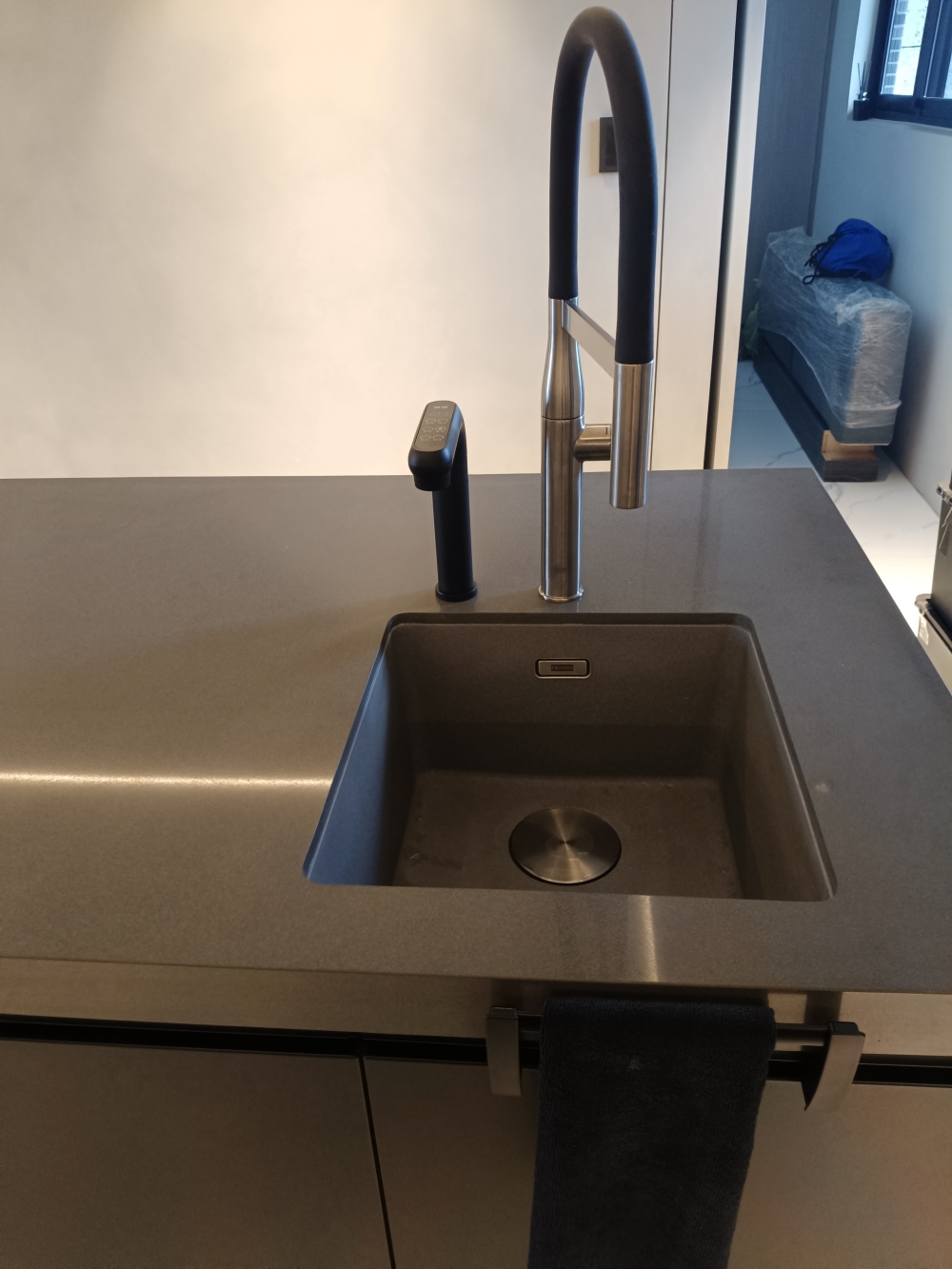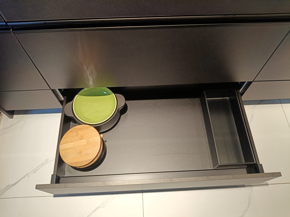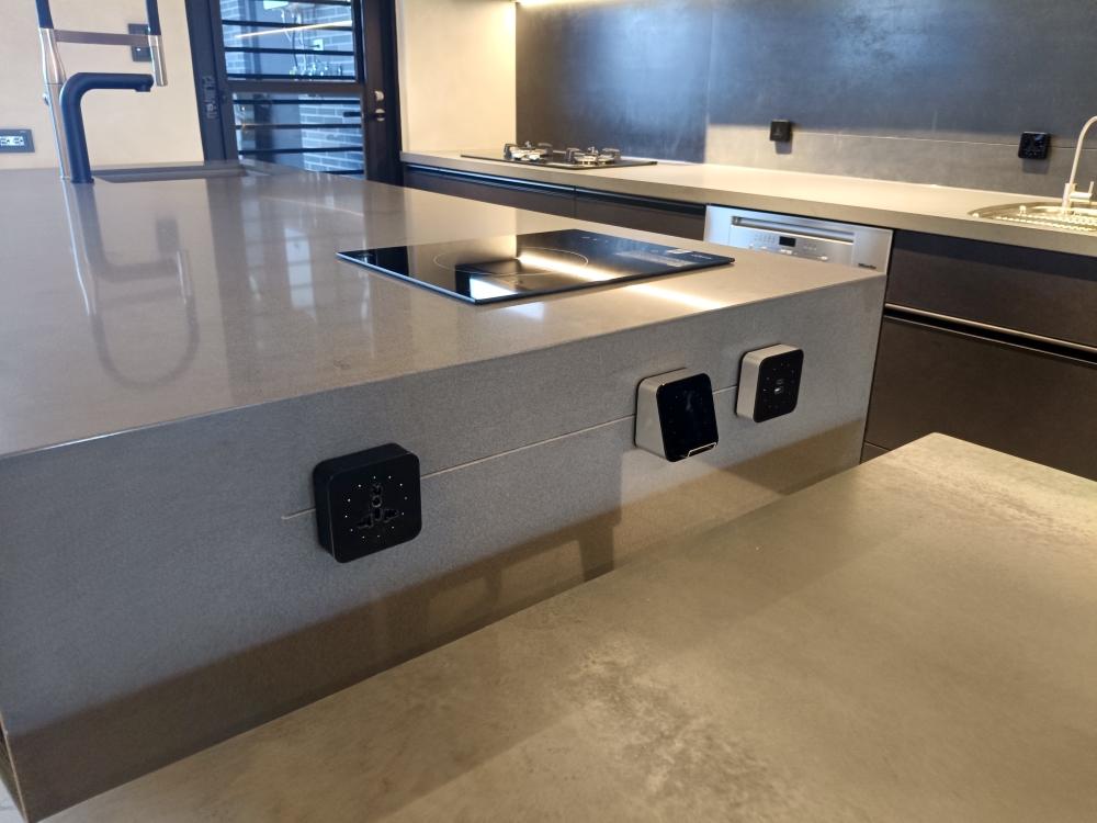 設計發想核心為「和諧」,旨在創造一個充滿質感、且與空間完美融合的廚房;櫃體門片選用 Cleanup CENTRO Class05 CUZ 色系,沉穩中帶有內斂光澤,並搭配U型黑色隱藏把手,簡約俐落的設計賦予櫃體優雅的延伸感,檯面選用具現代感的 愷薩金石2003鈦金灰;整體廚房除了實用機能之外,更是專為屋主一家量身打造的藝術空間。