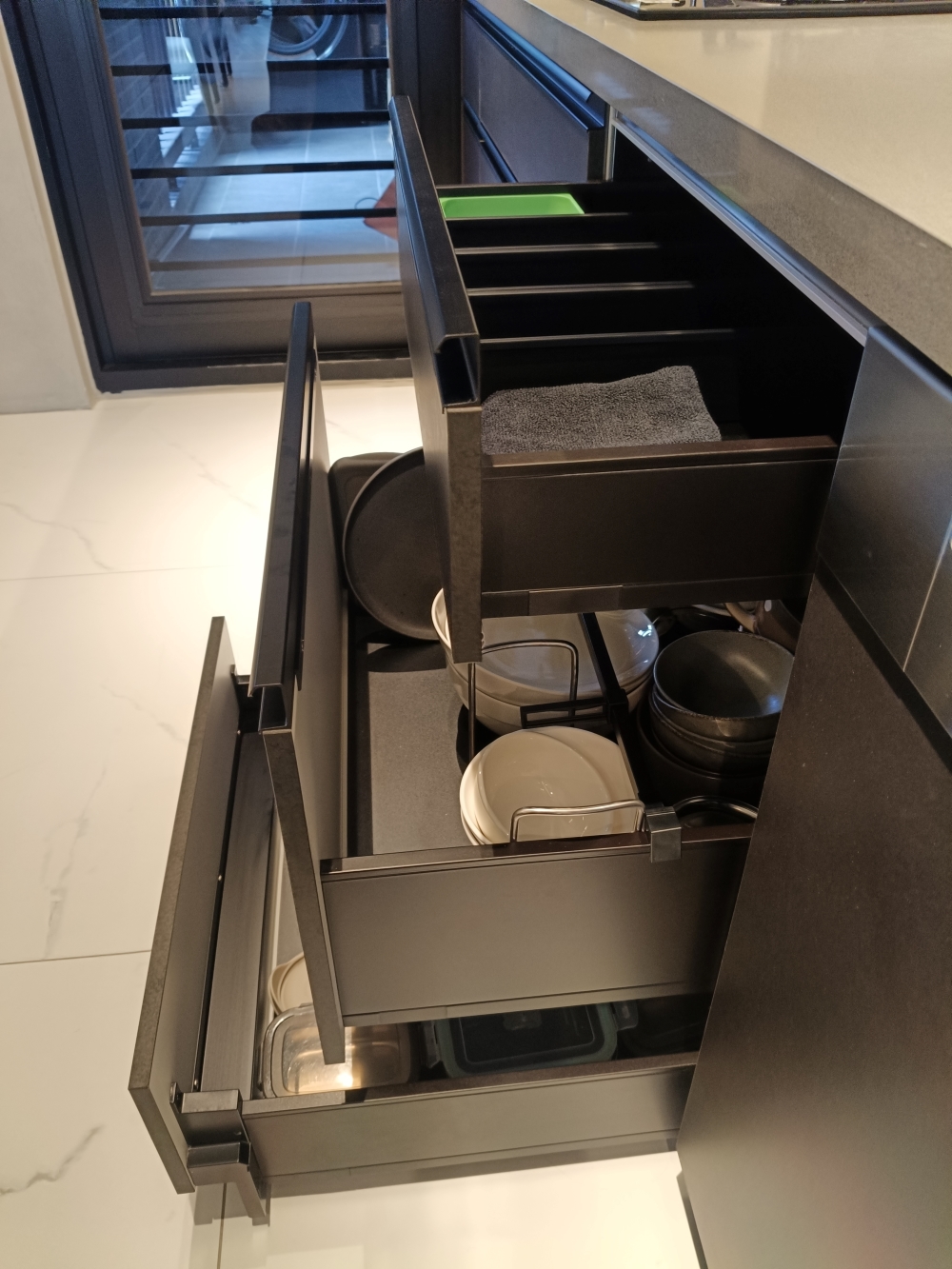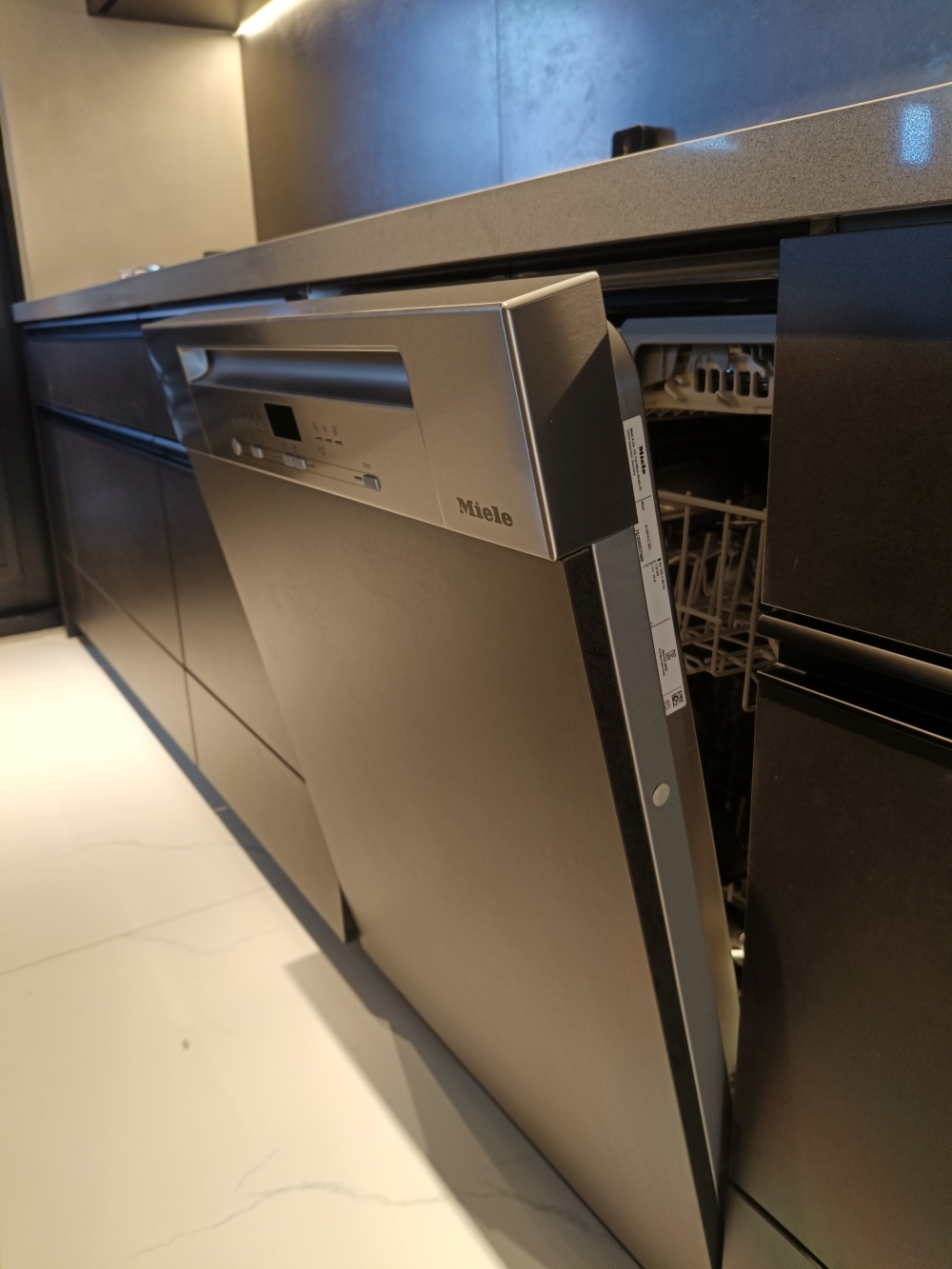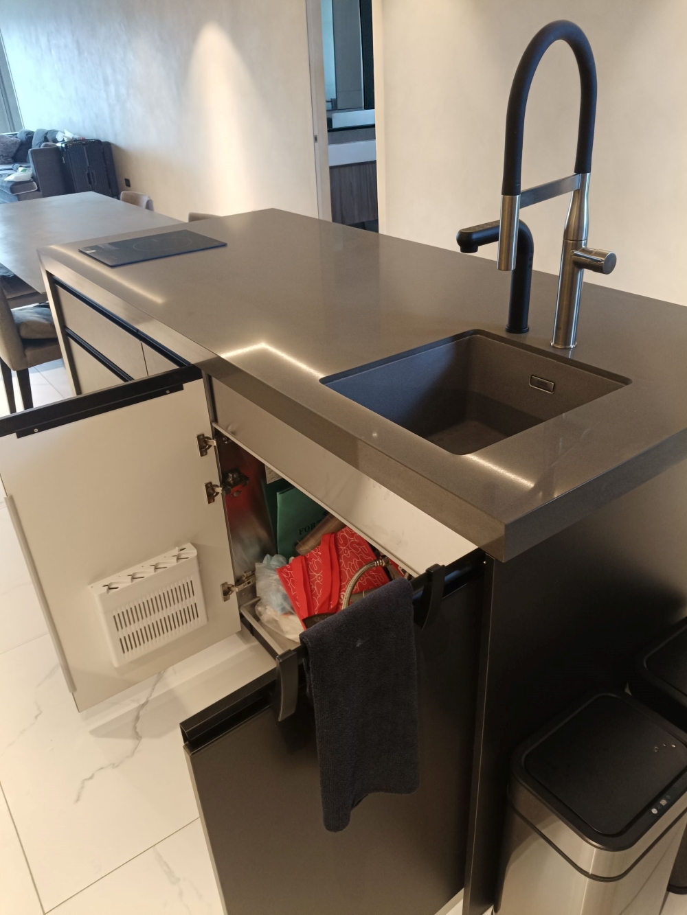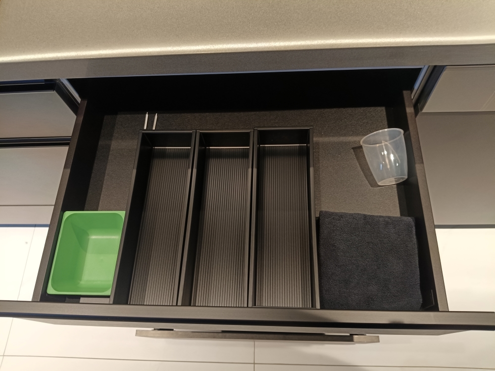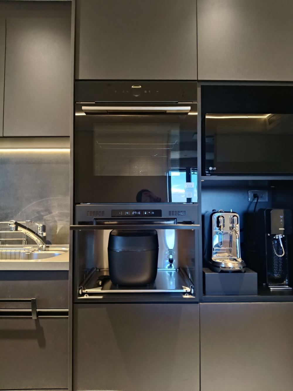 設計發想核心為「和諧」,旨在創造一個充滿質感、且與空間完美融合的廚房;櫃體門片選用 Cleanup CENTRO Class05 CUZ 色系,沉穩中帶有內斂光澤,並搭配U型黑色隱藏把手,簡約俐落的設計賦予櫃體優雅的延伸感,檯面選用具現代感的 愷薩金石2003鈦金灰;整體廚房除了實用機能之外,更是專為屋主一家量身打造的藝術空間。