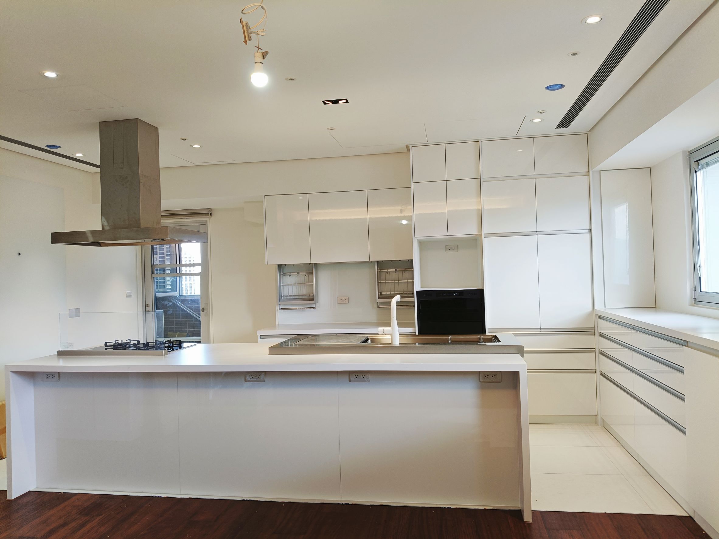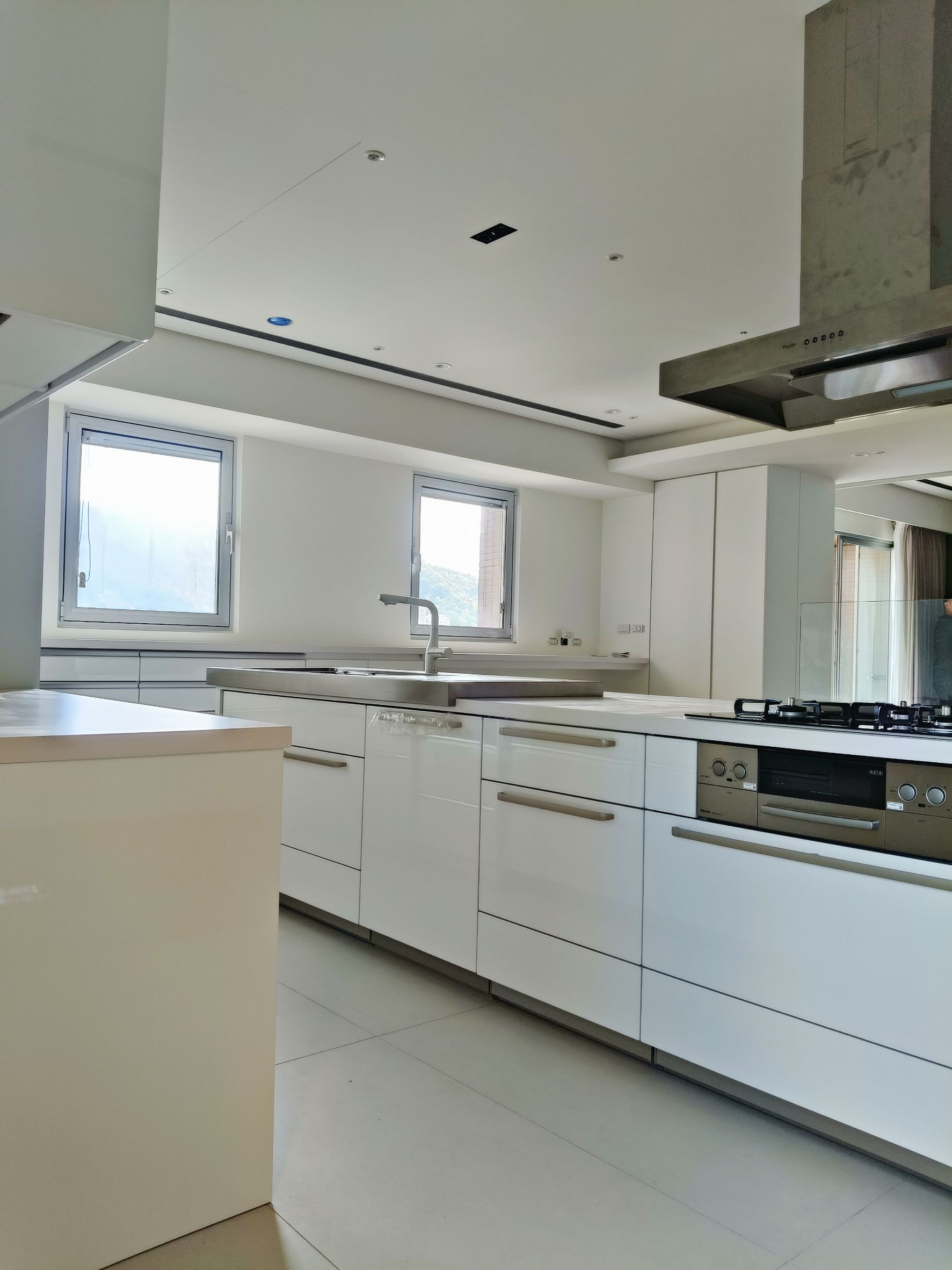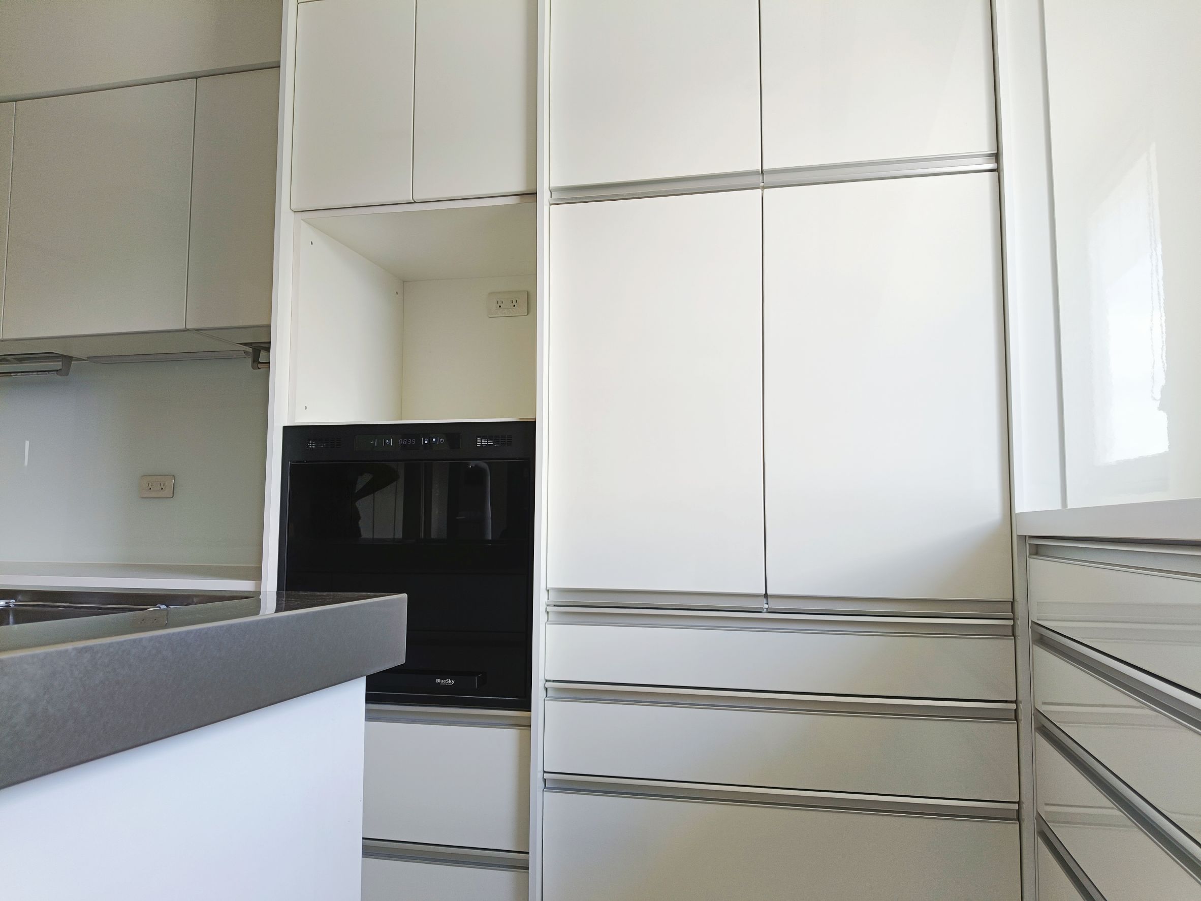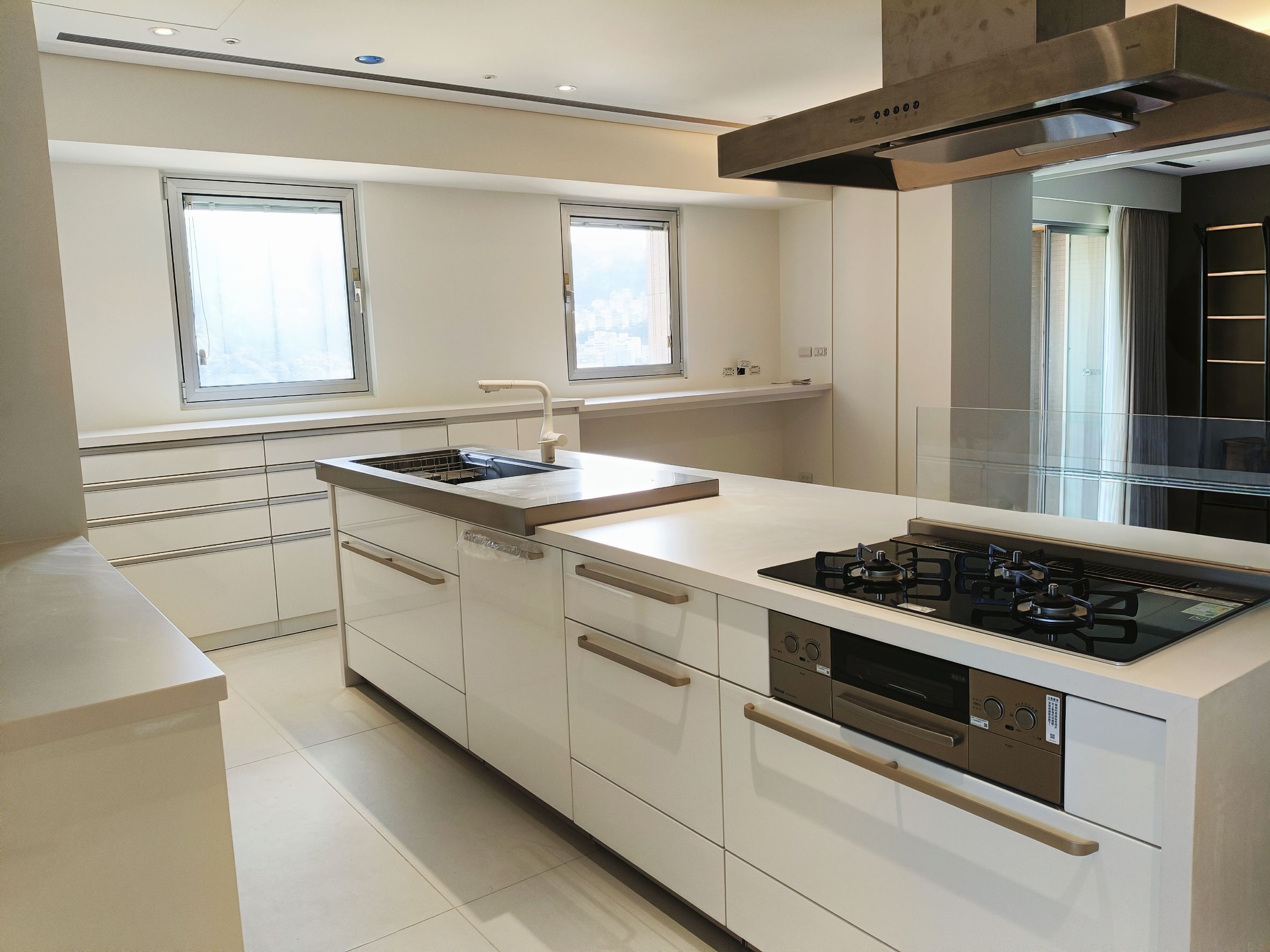 設計師以「共饗」為核心,為屋主打造零距離的開放式社交廚房,選用 Cleanup STEDIA Class03 系列,以溫潤CNA門片搭配潔白賽麗石與銀色長把手,勾勒出優雅俐落的空間;打破傳統界線,將職人手作 JL 水槽與林內爐連烤移至中島,讓備料與烹飪成為一場精采的展演,主客互動無縫接軌,L 型區域則化身為強大的收納後盾,將海量鍋碗瓢盆完美隱藏,這不僅是機能廚房,更是凝聚親友情感的極致款待空間。