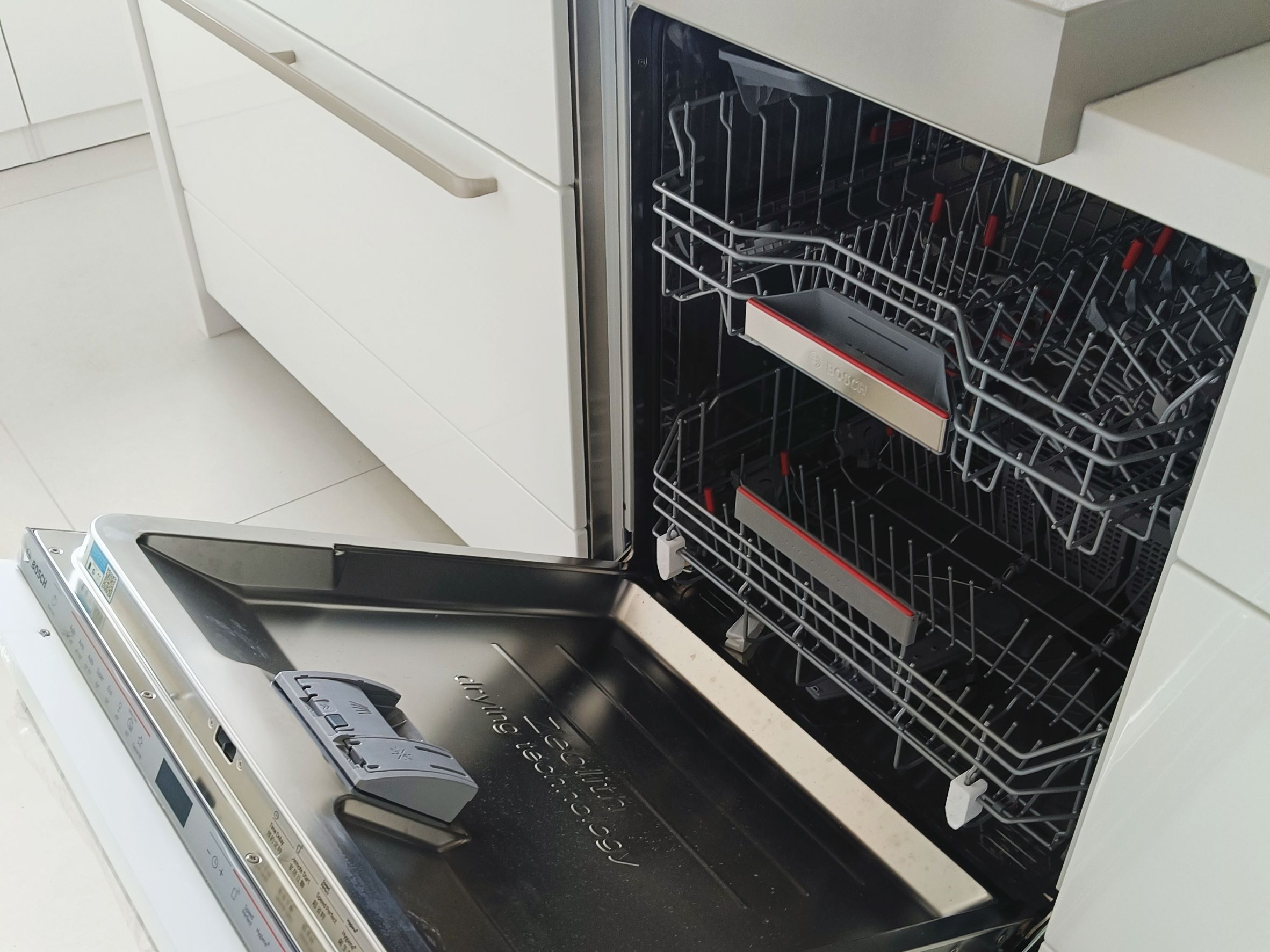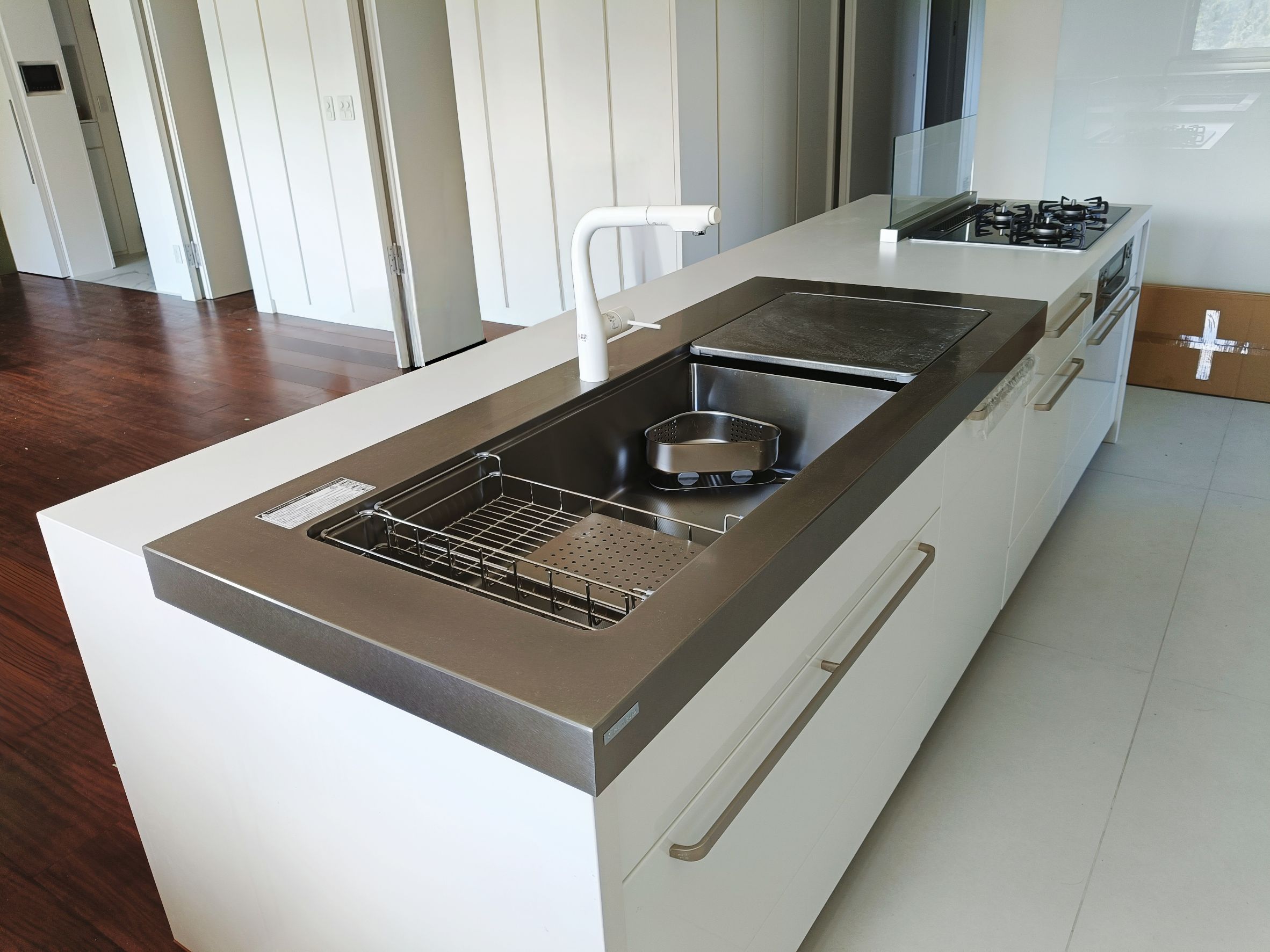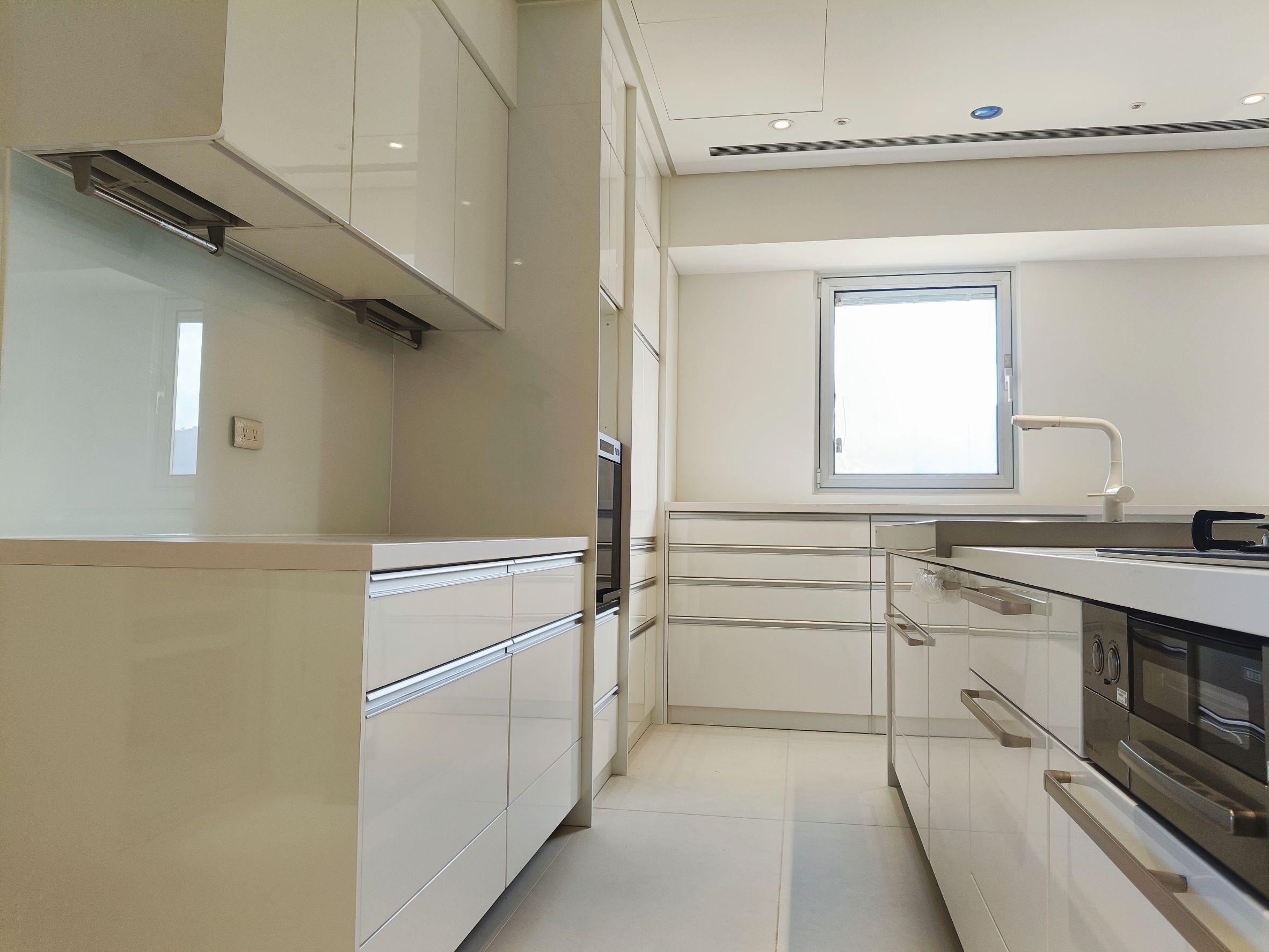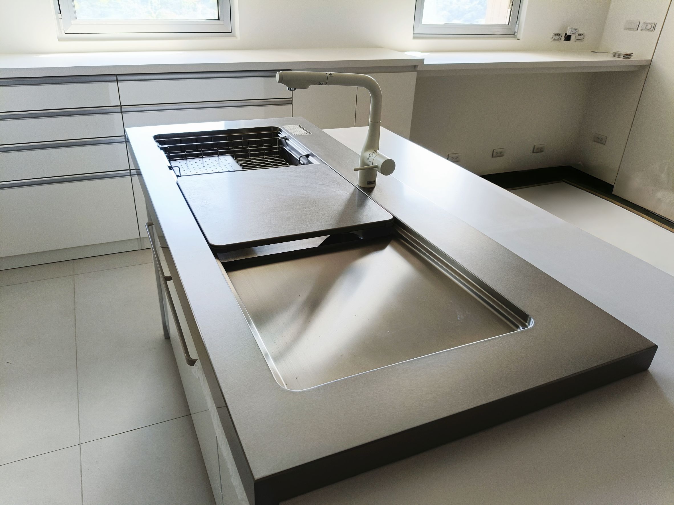 設計師以「共饗」為核心,為屋主打造零距離的開放式社交廚房,選用 Cleanup STEDIA Class03 系列,以溫潤CNA門片搭配潔白賽麗石與銀色長把手,勾勒出優雅俐落的空間;打破傳統界線,將職人手作 JL 水槽與林內爐連烤移至中島,讓備料與烹飪成為一場精采的展演,主客互動無縫接軌,L 型區域則化身為強大的收納後盾,將海量鍋碗瓢盆完美隱藏,這不僅是機能廚房,更是凝聚親友情感的極致款待空間。