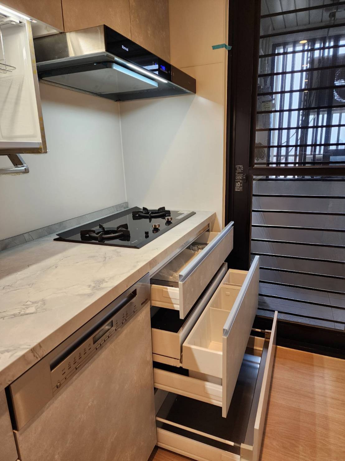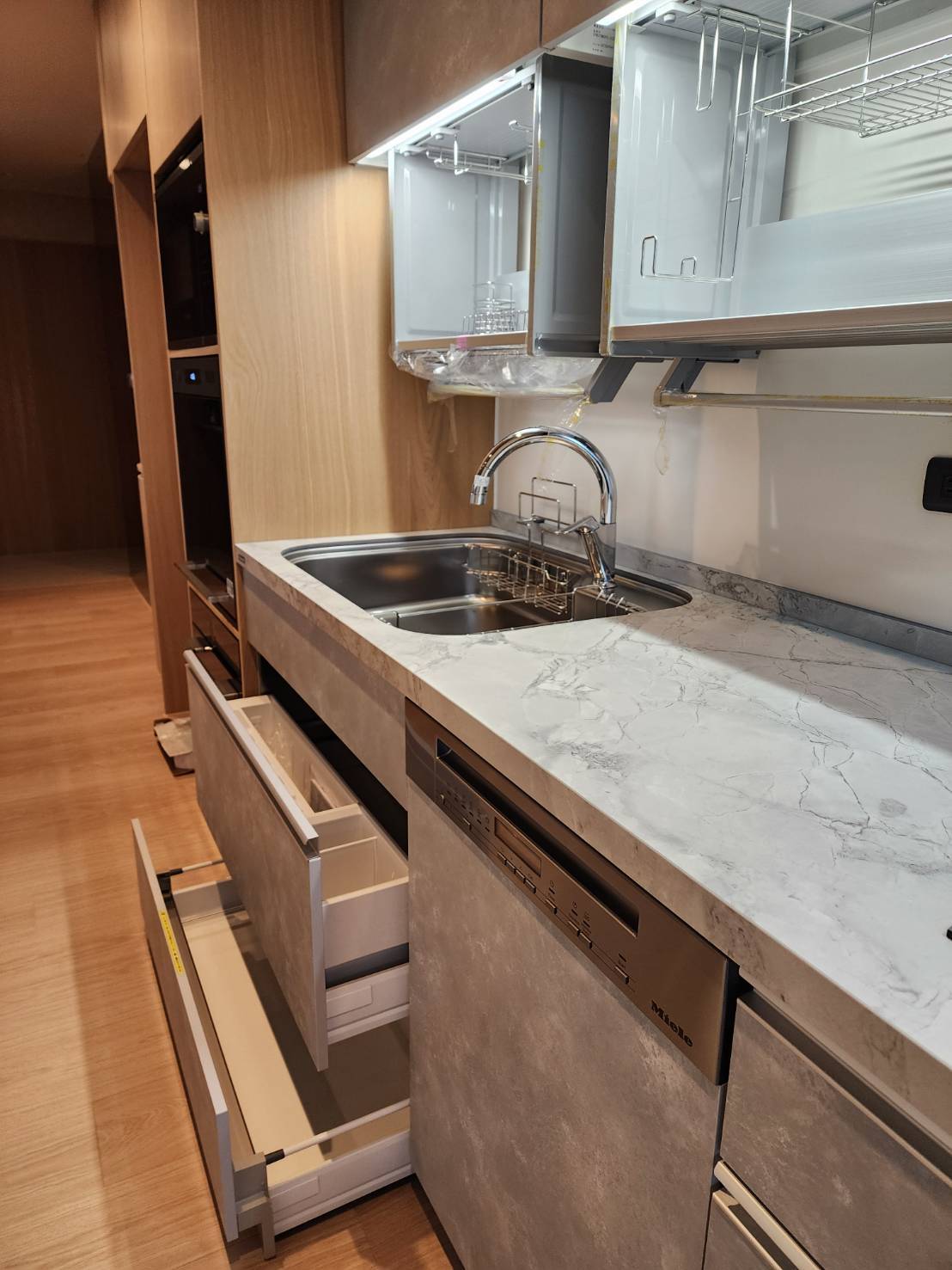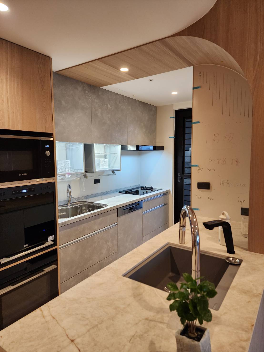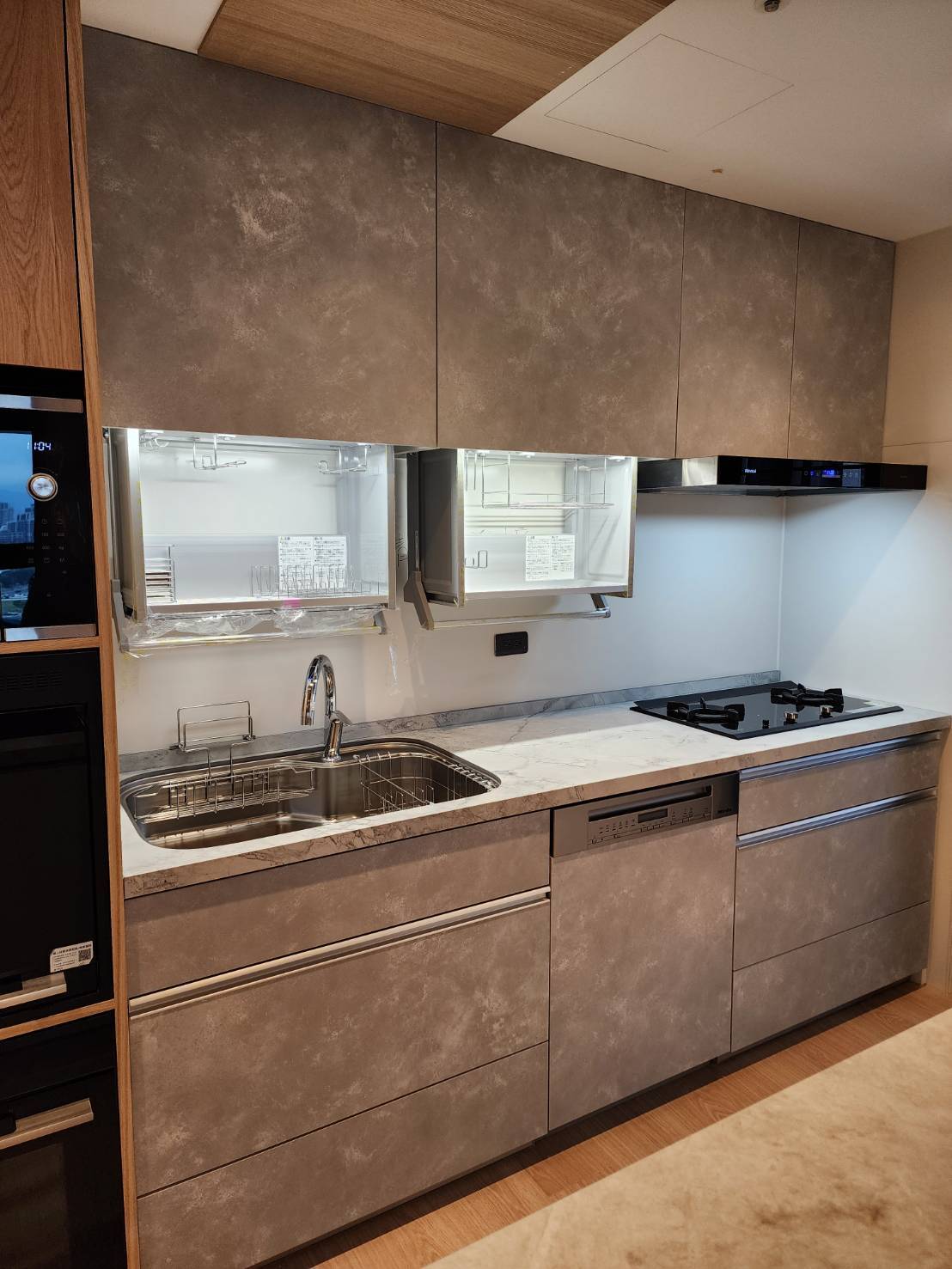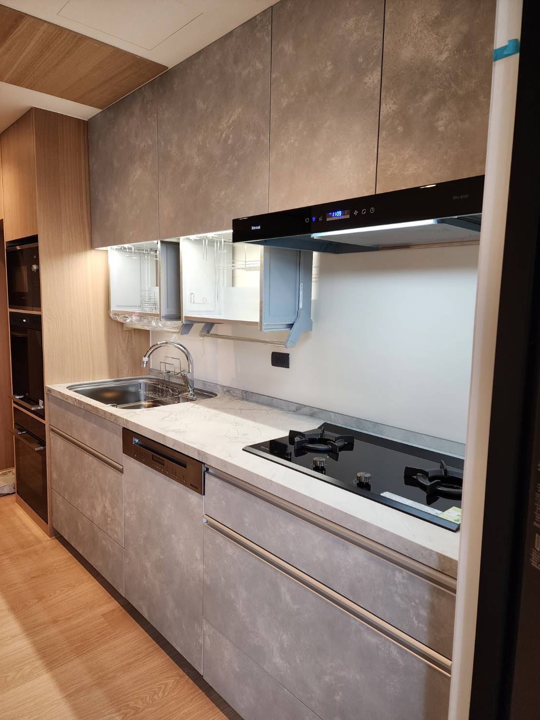 設計師透過 STEDIA Class05 (ECG) 門片細膩的灰階織紋,為空間注入沉穩而優雅的靈魂,特別選用銀色B隱藏式把手,弱化櫃體線條,使立面更顯俐落純淨,搭配Cleanup導流水槽,兼顧實用性與耐用細節,下拉式吊櫃貼合使用動線,讓收納與取用更加直覺,整體呈現出簡約、理性又耐看的現代廚房,完美演繹現代極簡美學。