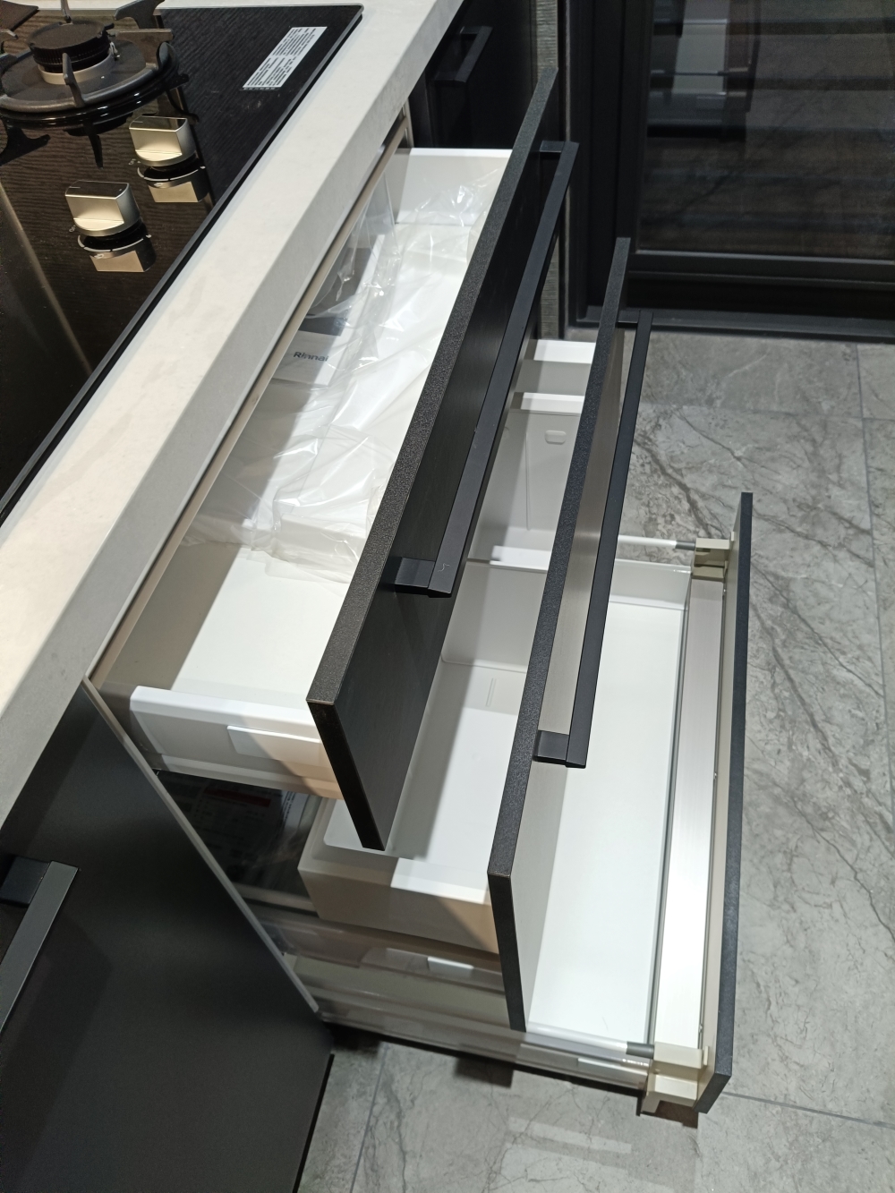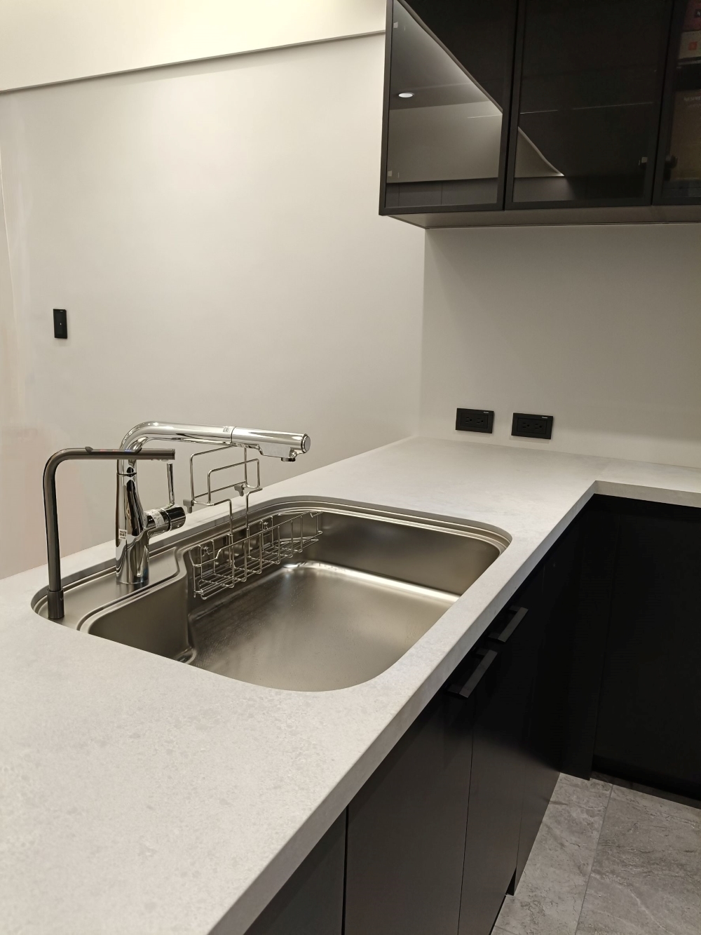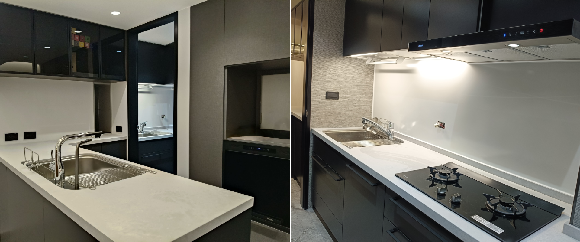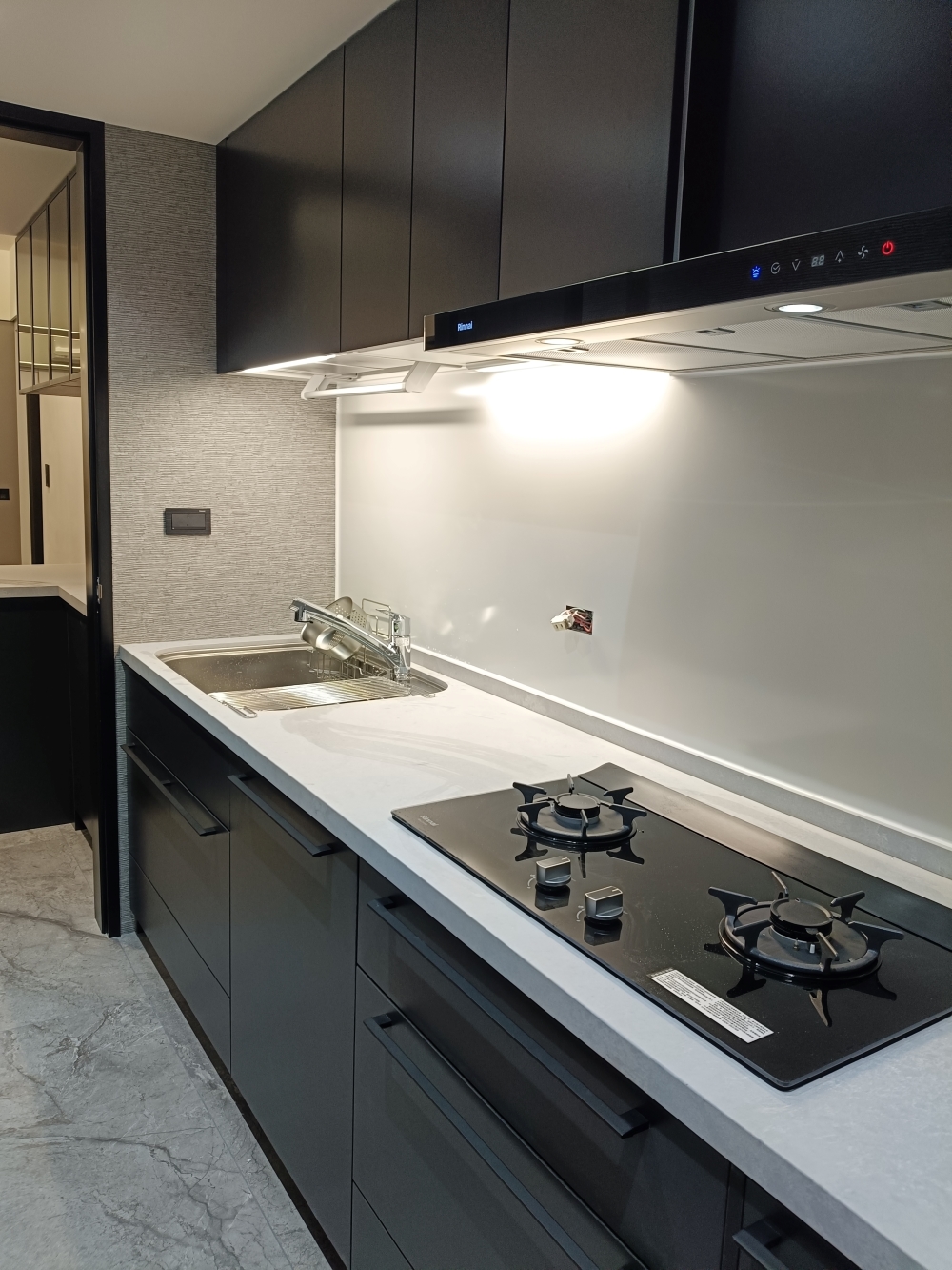 設計師不動牆面讓廚房延伸至客廳,將廚房化為守護幼兒的溫柔視角,中島兼具料理、洗滌與用餐機能,滿足年輕媽媽邊烹飪邊照護幼兒的需求;內廚規劃為油煙區;Cleanup STEDIA Class05 CAZ 上下櫃、G黑色長把手與SA導流水槽,俐落設計與高效收納,讓小空間也能展現開闊質感,點亮專屬於母子間的幸福溫度。